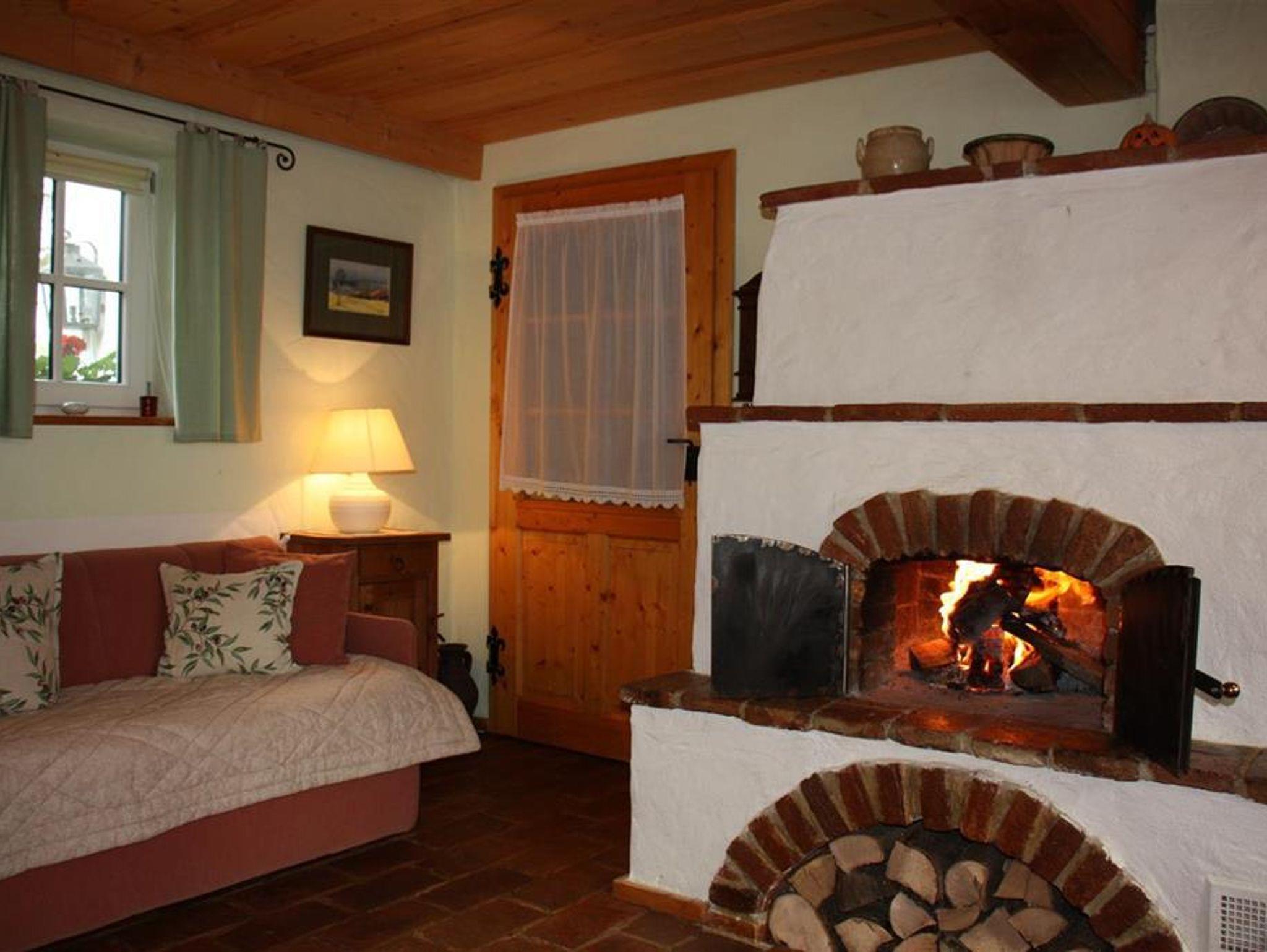 • Eine rustikale Wohnküche mit offenem Kaminfeuer, einer großen Essecke und direktem Ausgang zur Sonnenterrasse