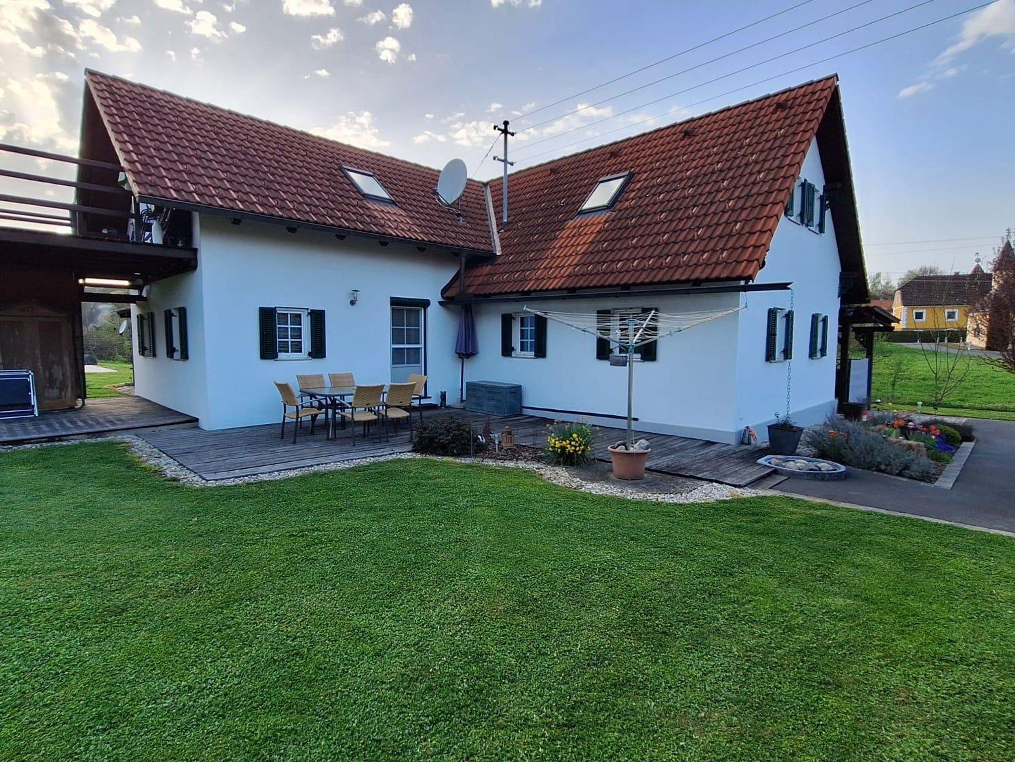 Zur Ausstattung zählen auch mehrere Terrassen sowie eine ansprechende Außenanlage, eingebettet in einem großen Garten.