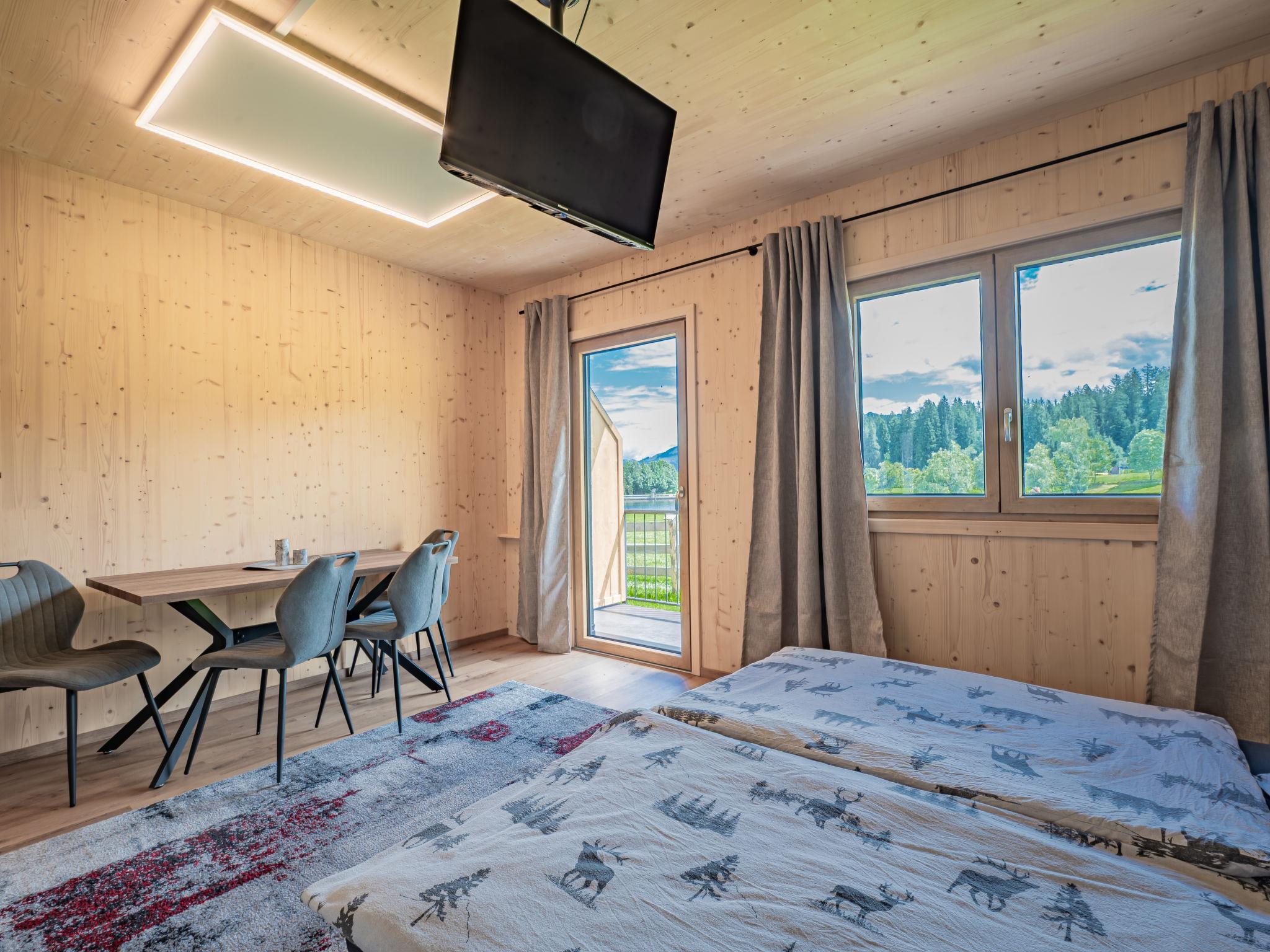 "2 Zimmer", 2-room apartment 30 m2. Beautiful and cosy furnishings: living/sleeping room with 1 double bed (180 cm, length 200 cm), dining table and TV (flat screen). Open kitchen in the entrance (oven, 2 ceramic glass hob hotplates, toaster, kettle, electric coffee machine). Shower/WC. Heating. Balcony. Balcony furniture. Beautiful panoramic view of the lake and the mountains. Free. Please note: non-smokers only. Smoke alarm.