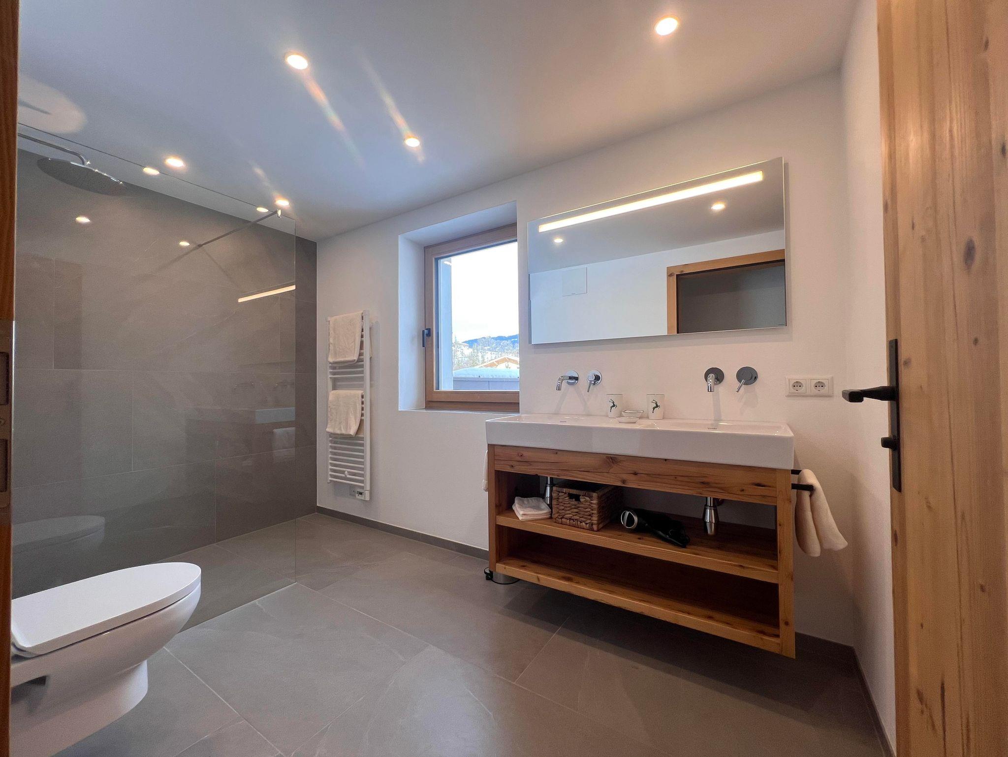 Das Chalet ist ein freistehendes Haus in Hanglage und erstreckt sich über zwei Etagen. Auf jeder Ebene befindet sich ein hochwertig ausgestattetes Appartement, beide mit separatem Zugang von außen. Großzügige Fensterfronten lassen viel Tageslicht herein und eröffnen einen weiten Blick auf die Bergwelt der Kitzbüheler Alpen. Beide Appartements verfügen zudem über eine nach Süden ausgerichtete Terrasse.