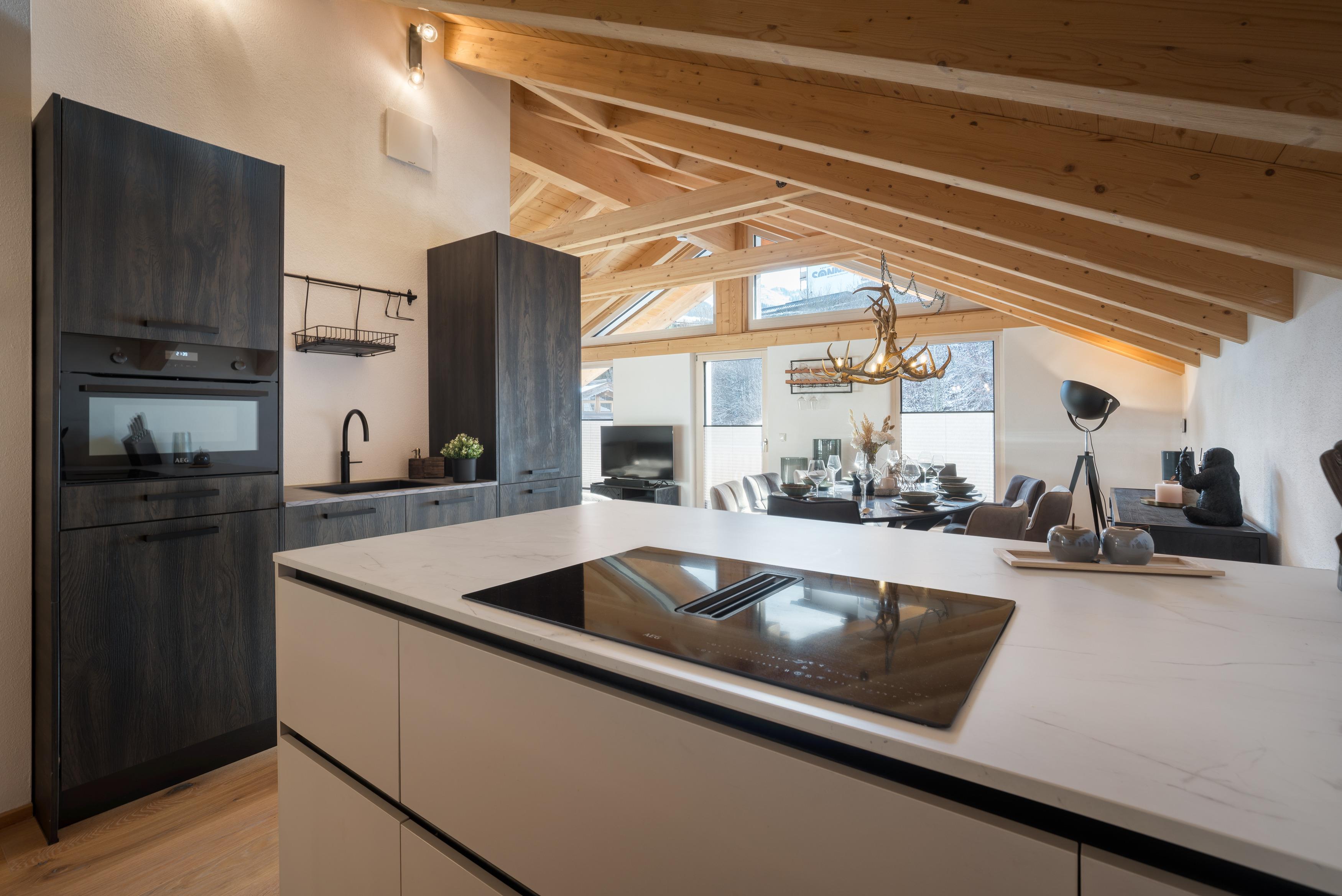 In der obersten Etage befindet sich unser gemütlicher Wohn-/Essbereich mit einer frei stehenden Küche, einem großen Esstisch mit Stühlen und einer bequemen Couch, welche abends bei einem netten Film zum verweilen einlädt. Ein Balkon mit Blick auf die Skipiste ist ebenfalls vorhanden, sowie 1 Schlafzimmer mit einem Doppelbett.