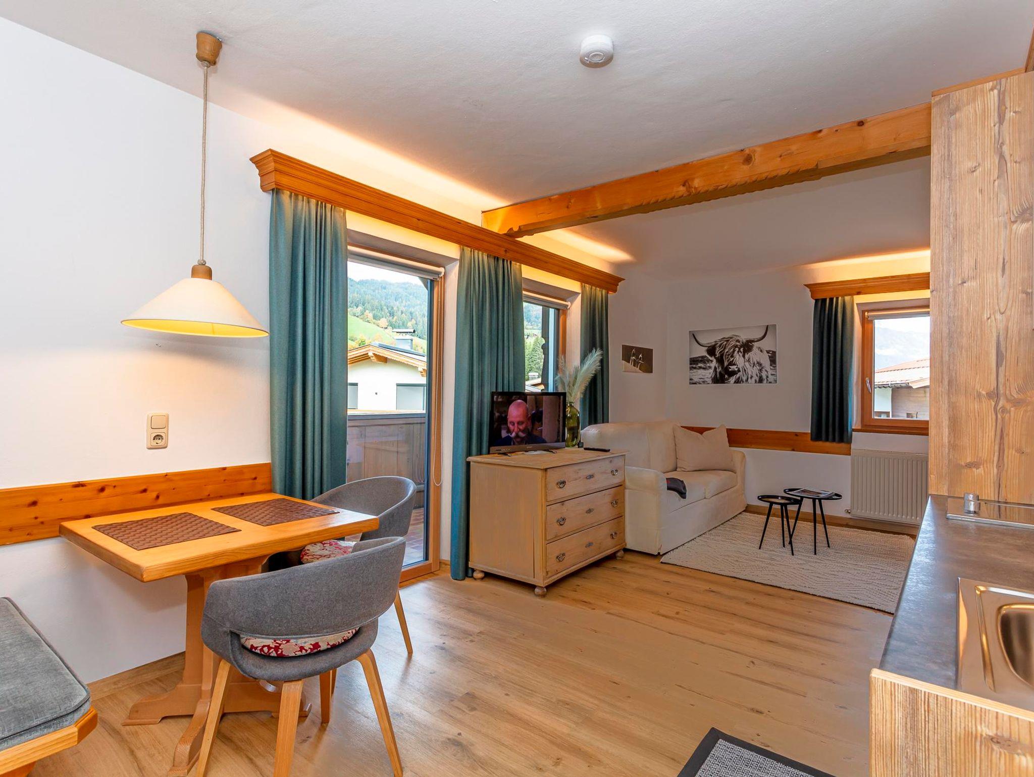 Willkommen in der modernen Ferienwohnung Kaiser 4! Hier erwarten dich auf 40 m² ein stilvolles und komfortables Ambiente. Angefangen von bequemen Betten und einer ausziehbaren Couch bis hin zu einer Kochnische mit Essecke findest du hier alles, was du für Ihren erholsamen Urlaub in den Kitzbüheler Alpen brauchst. Genieße die frische Luft und den herrlichen Ausblick vom Balkon aus. In der Ferienwohnung Kaiser 4 erwartet dich ein Aufenthalt voller Komfort und Gemütlichkeit.