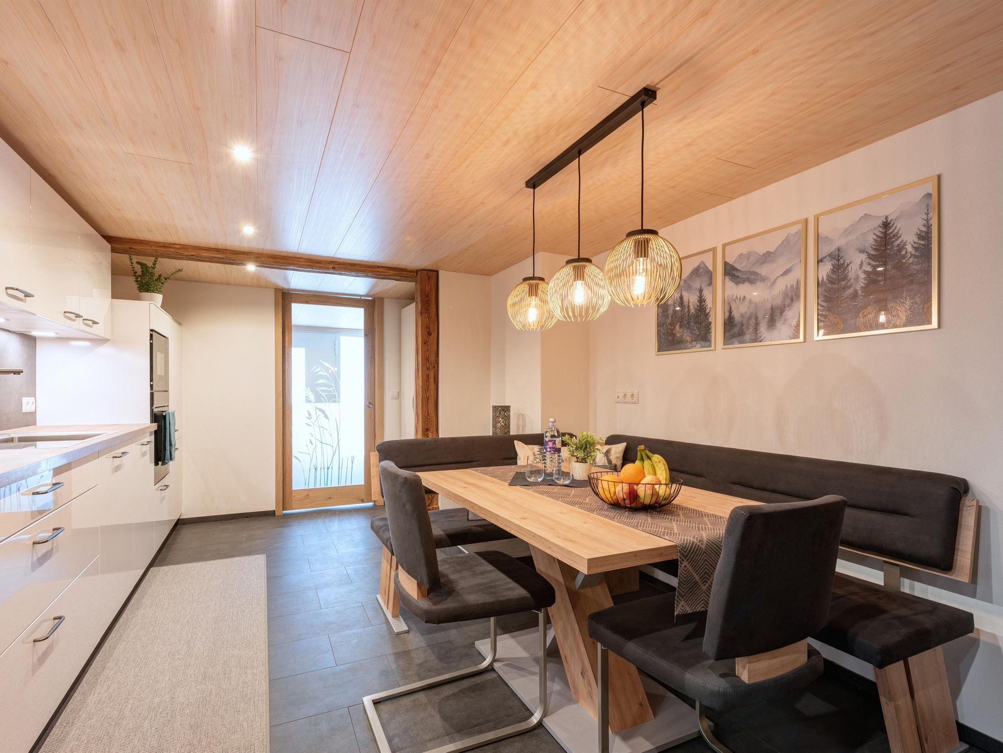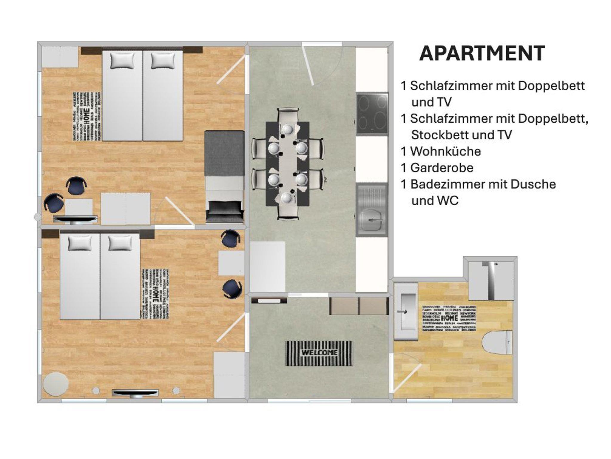 Das Apartment ist vollständig ausgestattet, verfügt über eine moderne Wohnküche, zwei große, gemütliche Schlafzimmer, (ein Schlafzimmer mit zusätzlichem Stockbett), eine Garderobe und ein komfortables Badezimmer. Ein Skiraum mit Schuhtrockner steht Ihnen auch zur Verfügung.