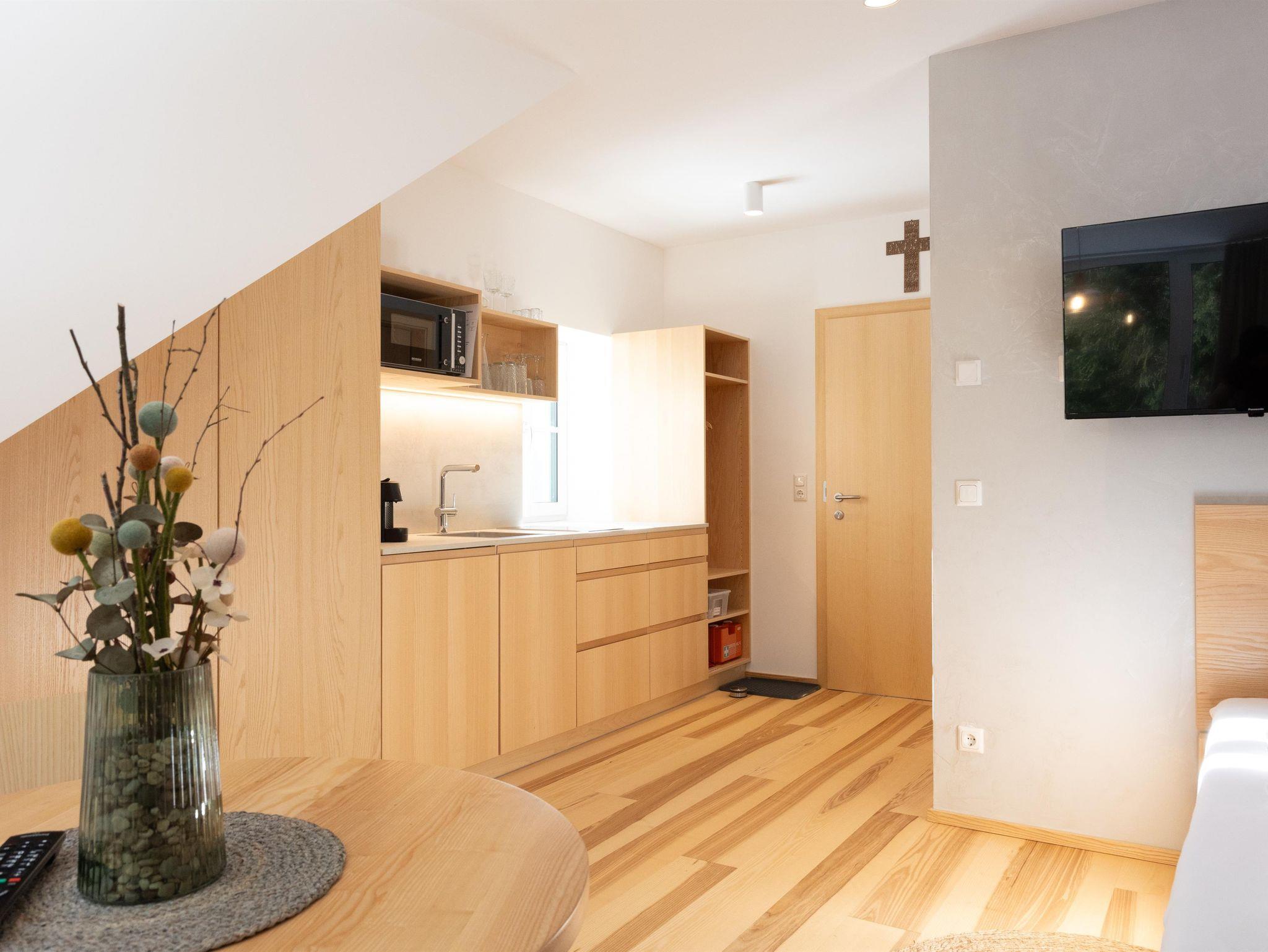 Die Ausstattung der Apartments lässt keine Wünsche offen. In den großzügigen Küchen kannst du dich bequem selbst versorgen, und im Vorraum findest du hausgemachte Gerichte in Kühlschränken, die du in deinem Apartment erwärmen kannst. Außerdem findest du im Kühlschrank in den Appartements einige Erfrischungen, die bereits für dich vorbereitet wurden!