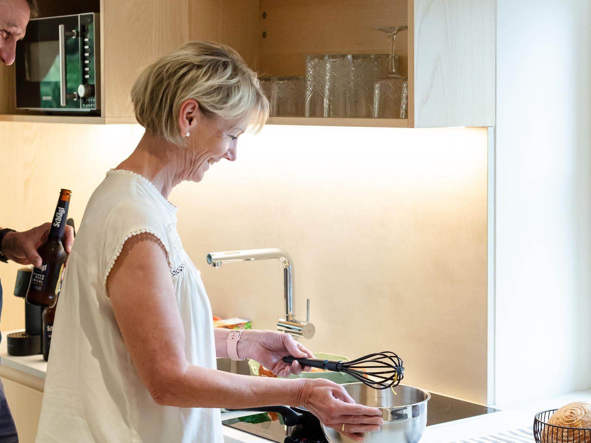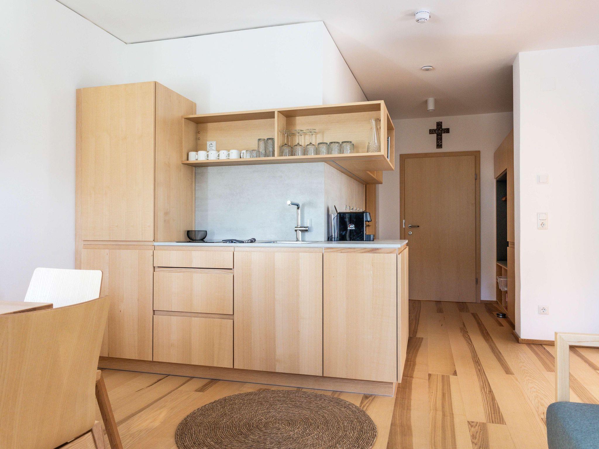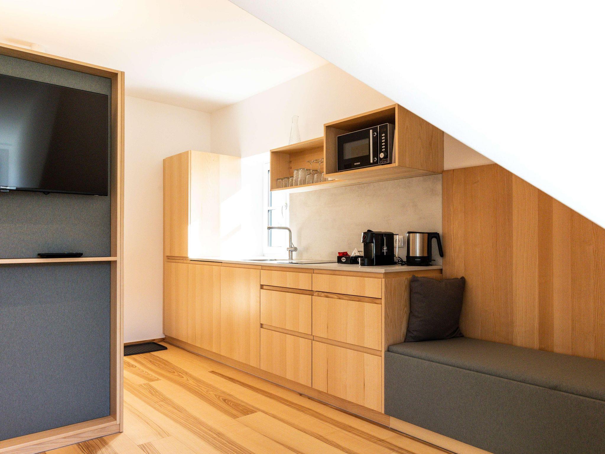 Die Ausstattung der Apartments lässt keine Wünsche offen. In den großzügigen Küchen kannst du dich bequem selbst versorgen, und im Vorraum findest du hausgemachte Gerichte in Kühlschränken, die du in deinem Apartment erwärmen kannst. Außerdem findest du im Kühlschrank in den Appartements einige Erfrischungen, die bereits für dich vorbereitet wurden!