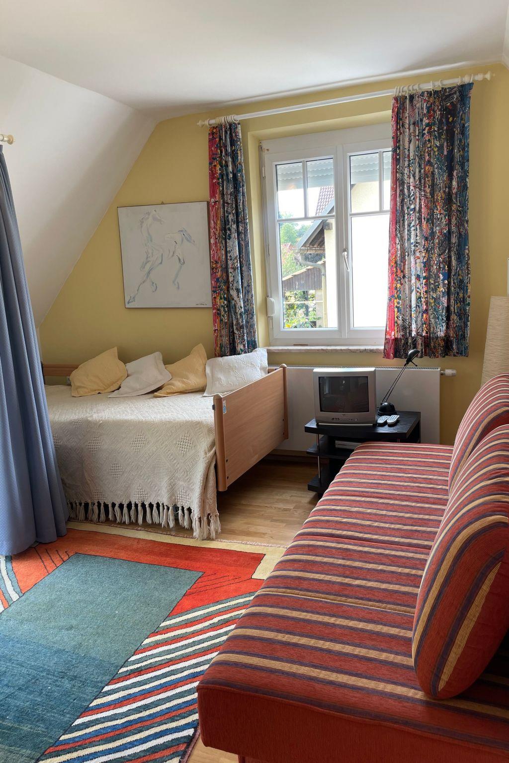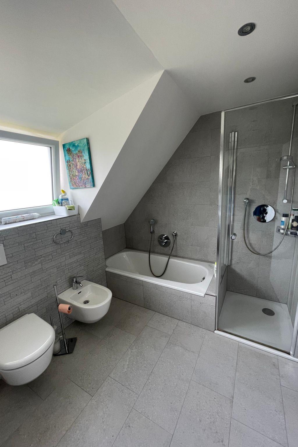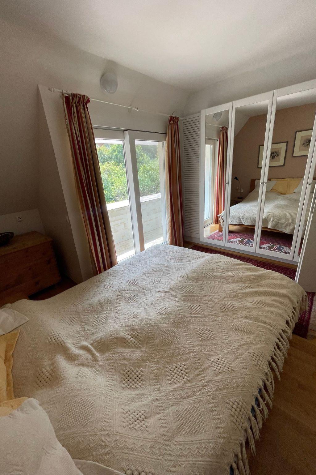 The ground floor comprises an entrance area, a toilet, a kitchen with a dining space and access to the roofed terrace, as well as a living room with a tiled fireplace stove. The kitchen is not new, but is fully-equipped with a dishwasher, coffee machine, Nespresso machine, toaster, fridge with freezer compartment, microwave, cutlery, glasses, plates etc. The first floor consists of three bedrooms, two of which open onto the balcony. Apart from the parents’ bedroom, the bedrooms are furnished with pull-out beds. Bed linen and towels are provided. There is also a bathroom with a shower, bath, double washbasin, bidet and toilet. A hairdryer is available. You can find a washing machine, a second fridge, a grill, loungers, beanbags etc. in the cellar.