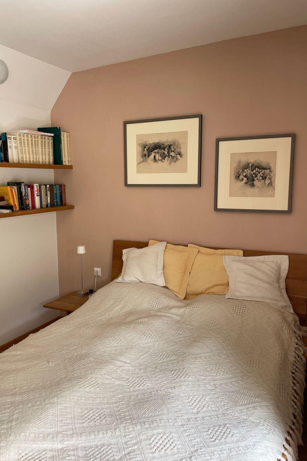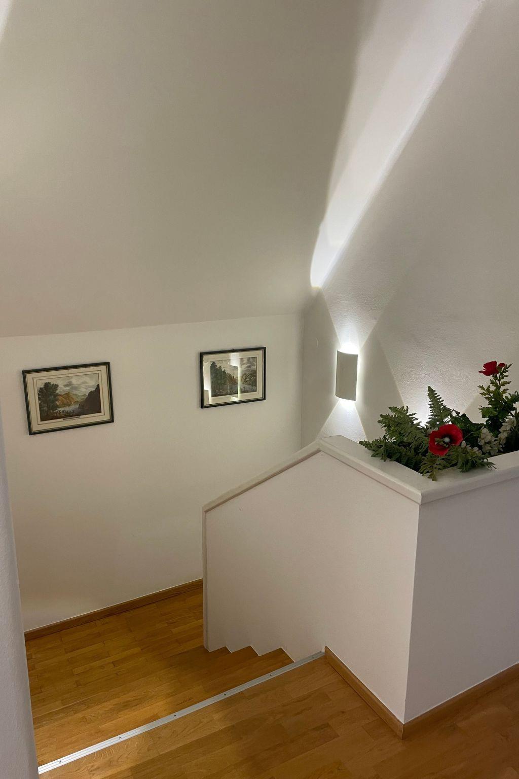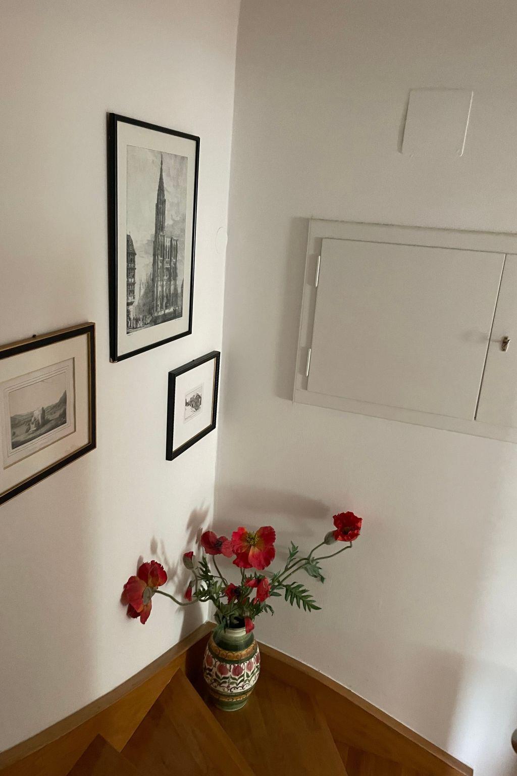 The ground floor comprises an entrance area, a toilet, a kitchen with a dining space and access to the roofed terrace, as well as a living room with a tiled fireplace stove. The kitchen is not new, but is fully-equipped with a dishwasher, coffee machine, Nespresso machine, toaster, fridge with freezer compartment, microwave, cutlery, glasses, plates etc. The first floor consists of three bedrooms, two of which open onto the balcony. Apart from the parents’ bedroom, the bedrooms are furnished with pull-out beds. Bed linen and towels are provided. There is also a bathroom with a shower, bath, double washbasin, bidet and toilet. A hairdryer is available. You can find a washing machine, a second fridge, a grill, loungers, beanbags etc. in the cellar.