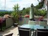 Eine 25 m² große zum Teil überdachte Terrasse mit Sitzgruppe und Liegen.