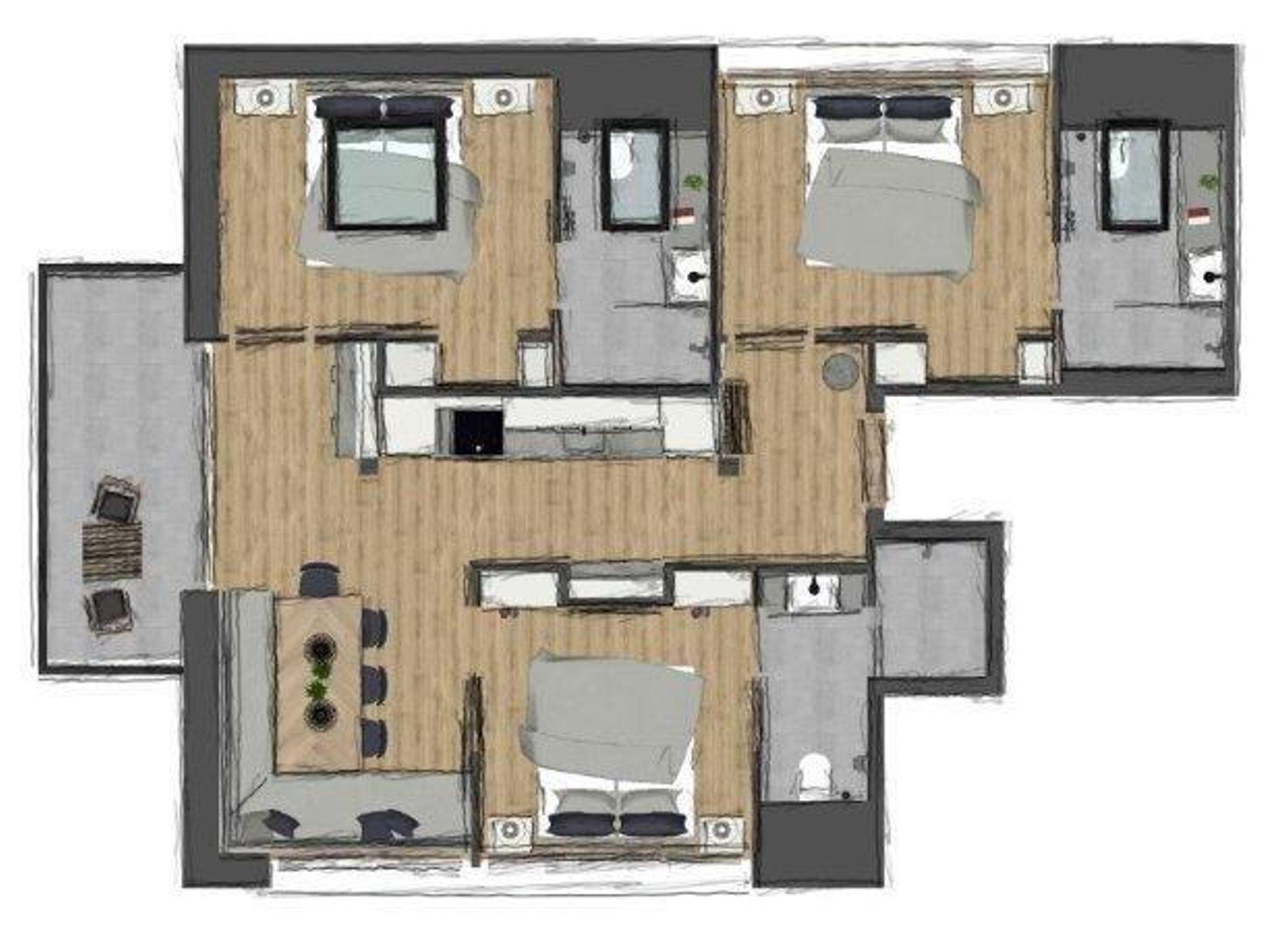 Das großzügige Apartment Jungfrau im zweiten Stock bietet auf 78 m² Platz für bis zu 6 Personen. Es verfügt über drei Schlafzimmer mit Doppelbett, jeweils mit eigenem Badezimmer mit Dusche und WC – ideal für Privatsphäre und Komfort. Die Wohnküche ist mit einem gemütlichen Esstisch ausgestattet und verfügt über eine moderne Küche mit E-Herd, Geschirrspüler, Espressomaschine und Mikrowelle. Ein Balkon lädt zum Entspannen an der frischen Luft ein.