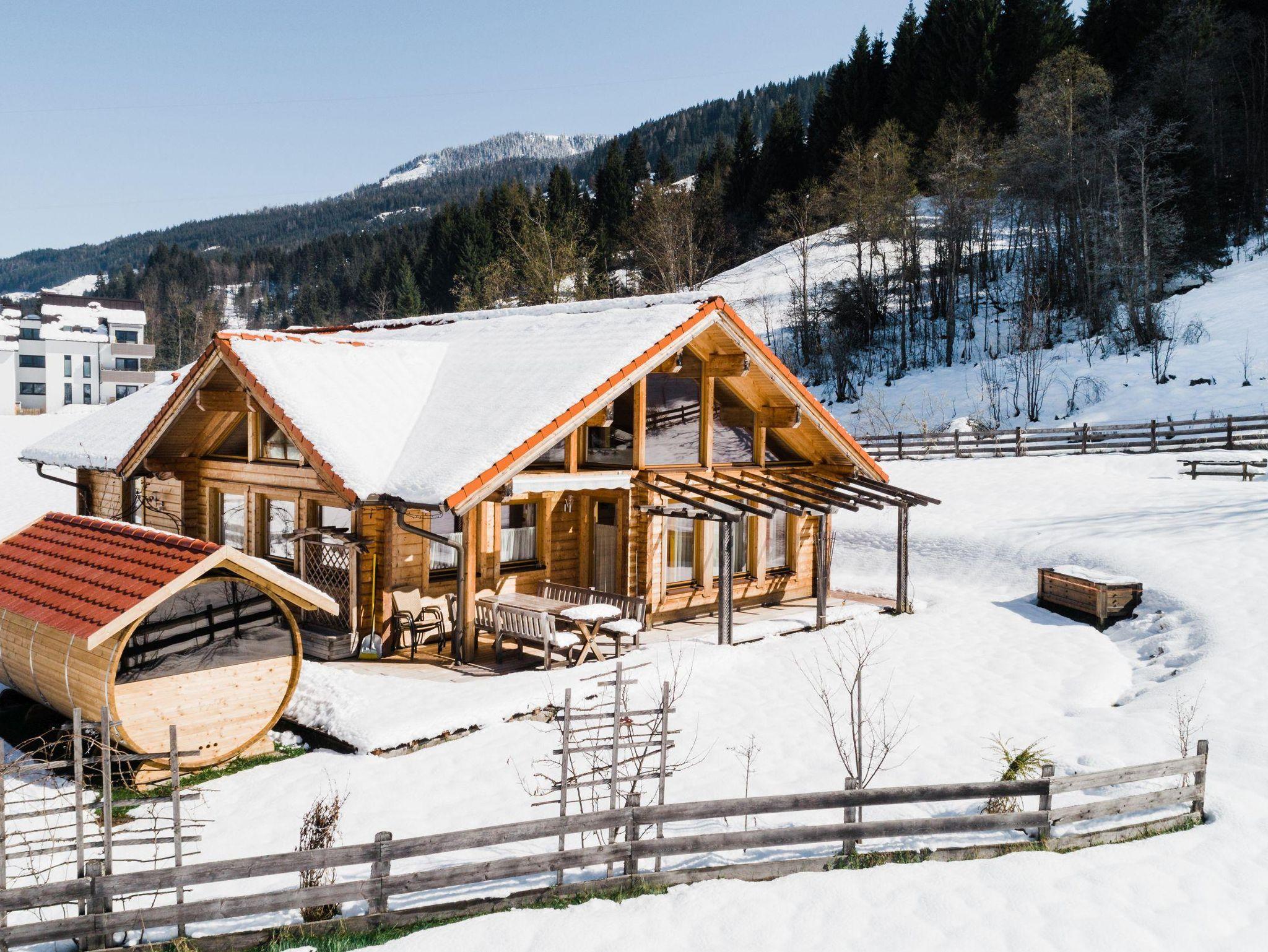 Das besondere Holzblockhaus, möbliert mit wohlriechendem Zirbenholz Wohnzimmer mit Kamin, riesiger Couch, Flatscreen und Kabel-TV Schi- und Schuhraum, Waschmaschine überdachte Terrasse und großer Garten, Sauna, Carport Großes Bad mit Wanne und Dusche
