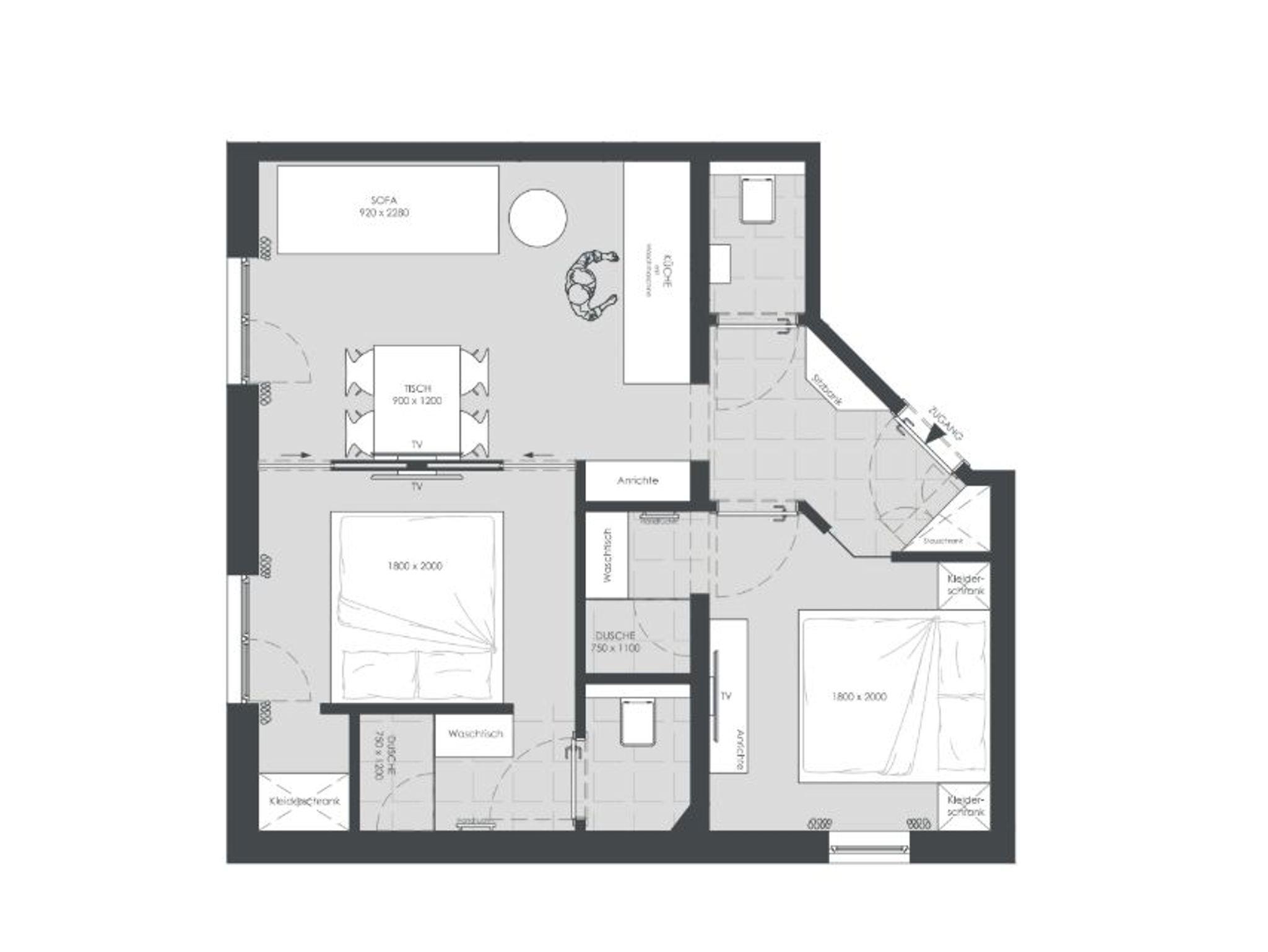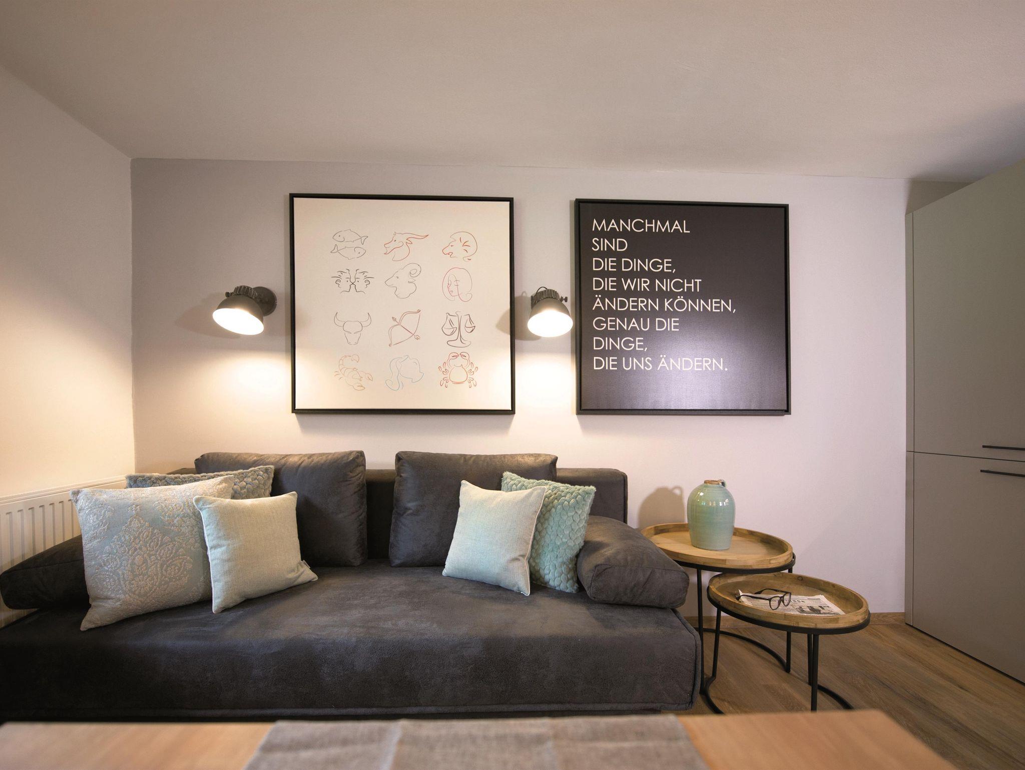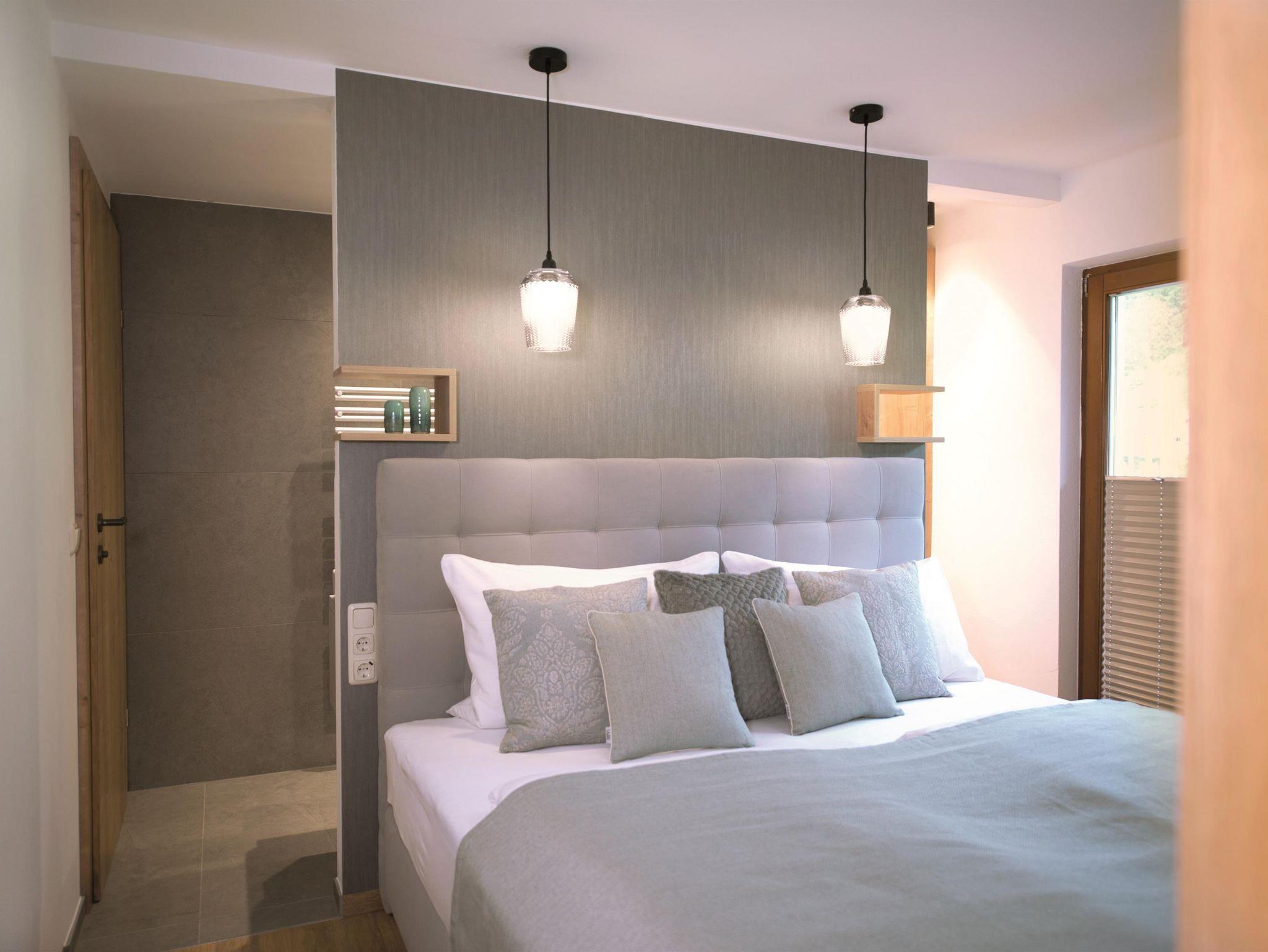 Das großzügige Apartment Wassermann im ersten Stock bietet auf 48 m² Platz für bis zu 5 Personen. Es verfügt über zwei Schlafzimmer mit Doppelbett sowie einer ausziehbaren Couch für eine weitere Person. Jedes Schlafzimmer hat ein eigenes Badezimmer mit Dusche und WC – perfekt für Komfort und Privatsphäre. Die helle Wohnküche ist mit einem gemütlichen Esstisch sowie einem Balkon ausgestattet und verfügt über eine moderne Küche mit E-Herd, Geschirrspüler, Espressomaschine und Mikrowelle.