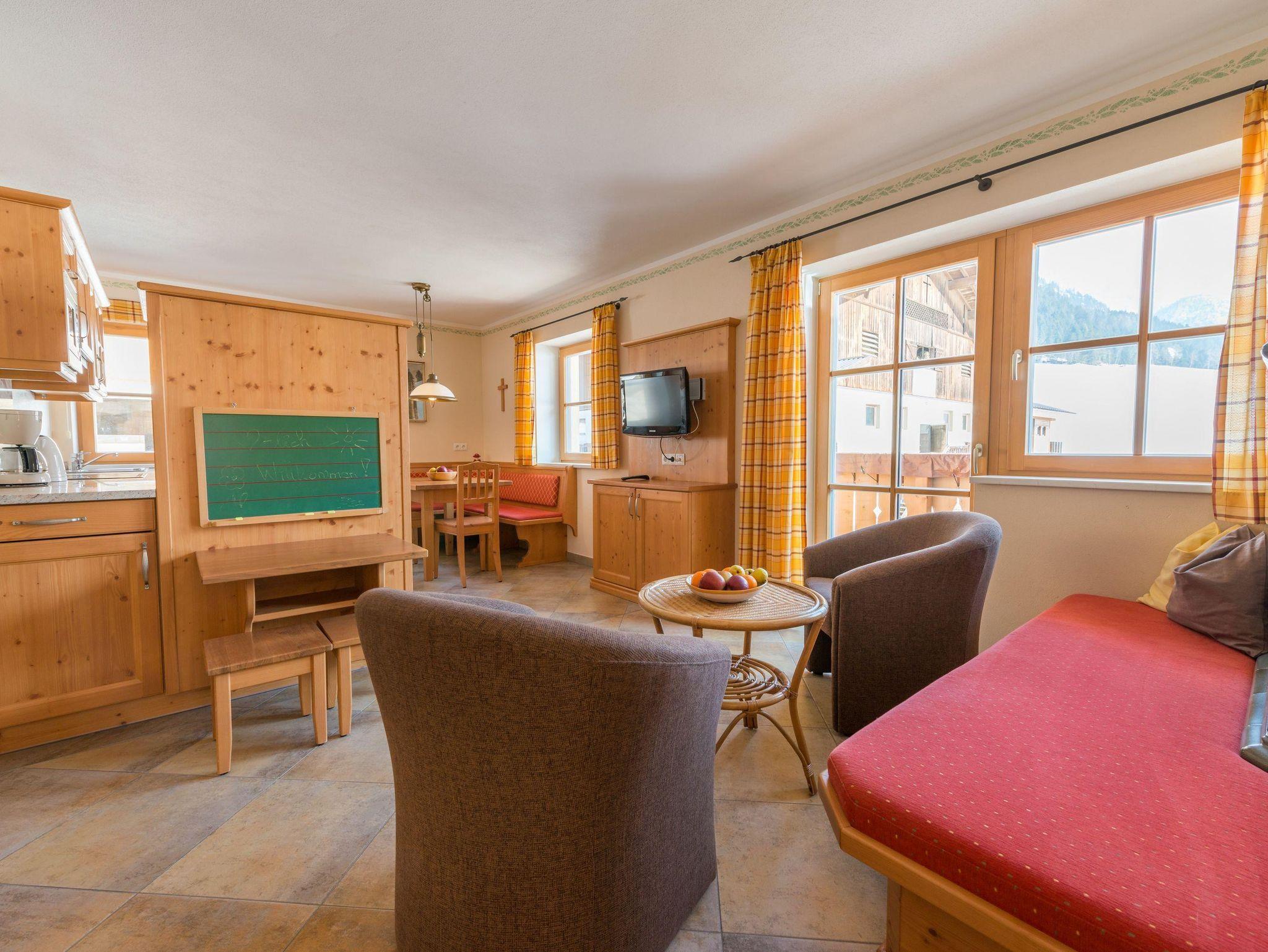 Apartment Jägersee - 55m², zwei Schlafzimmer, Bad mit Dusche, getrenntes WC und große Wohnküche. Komplett ausgestattete Küchenzeile, Sitzecke, beheizter Kachelofen mit gemütlicher Ofenbank, Flachbildschirm mit Kabel - TV und Internetanschluss. Vom eigenen Balkon genießt man einen wunderbaren Ausblick in die Kleinarler Berge, auch den nur 2km entfernt namensgebenden Jägersee kann man schon hinter den Baumwipfeln erahnen. Tipp: Auf www.schwabhof.info können sie eine virtuelle Tour durch unseren Hof und unsere Wohnungen machen!