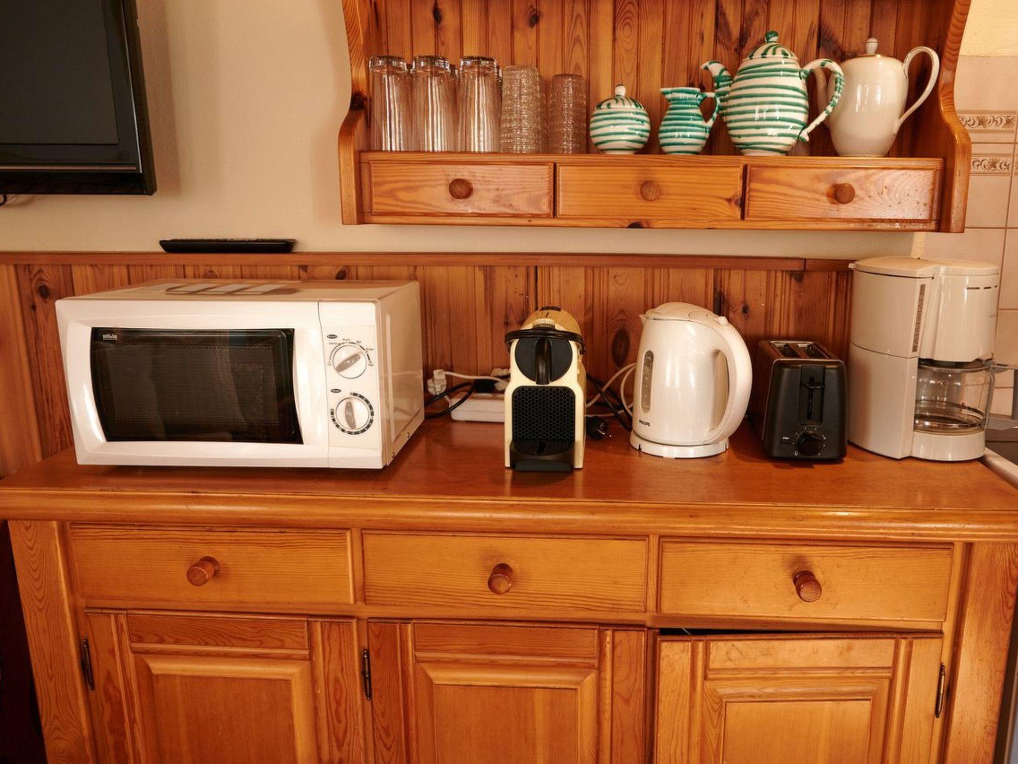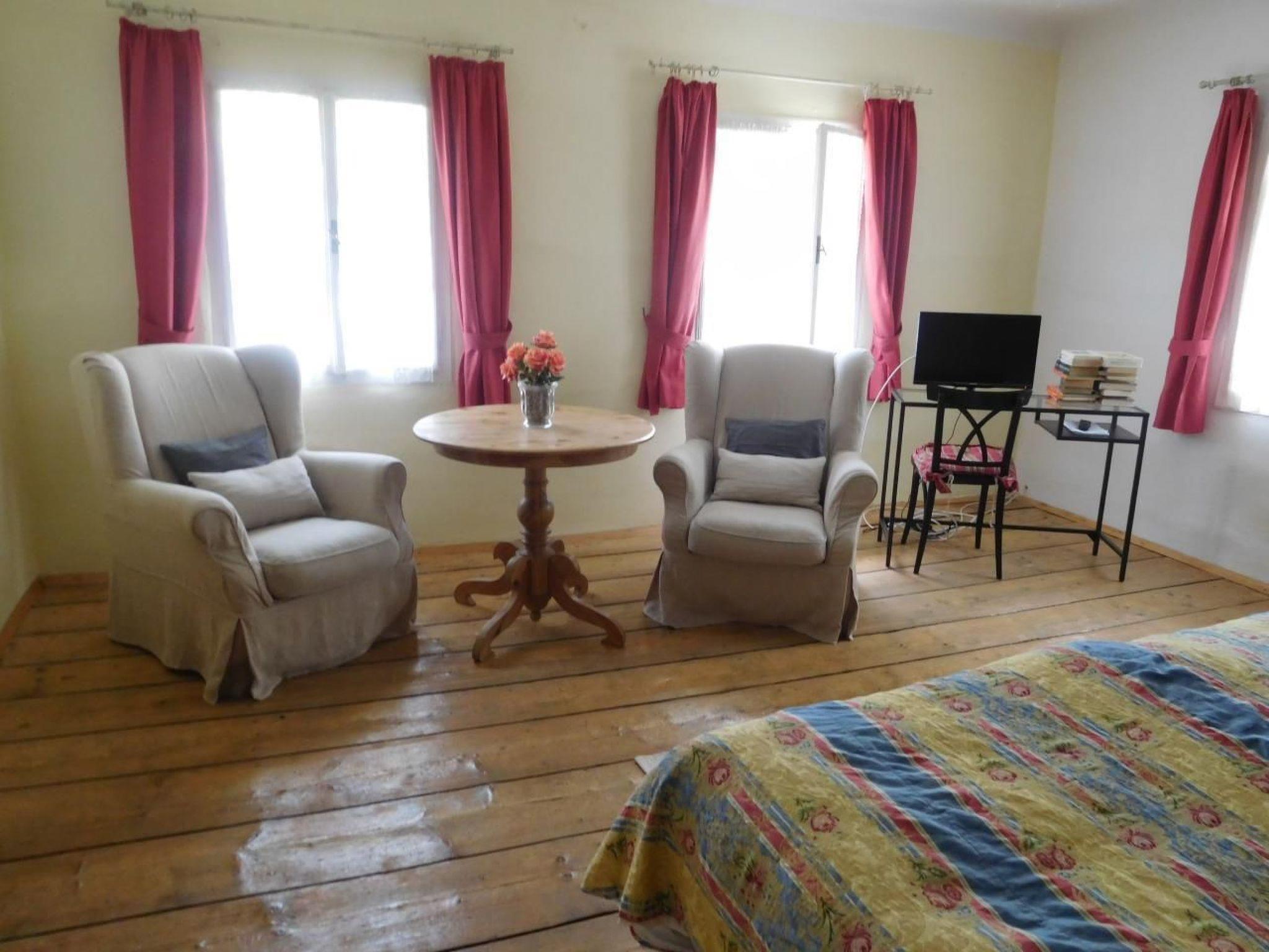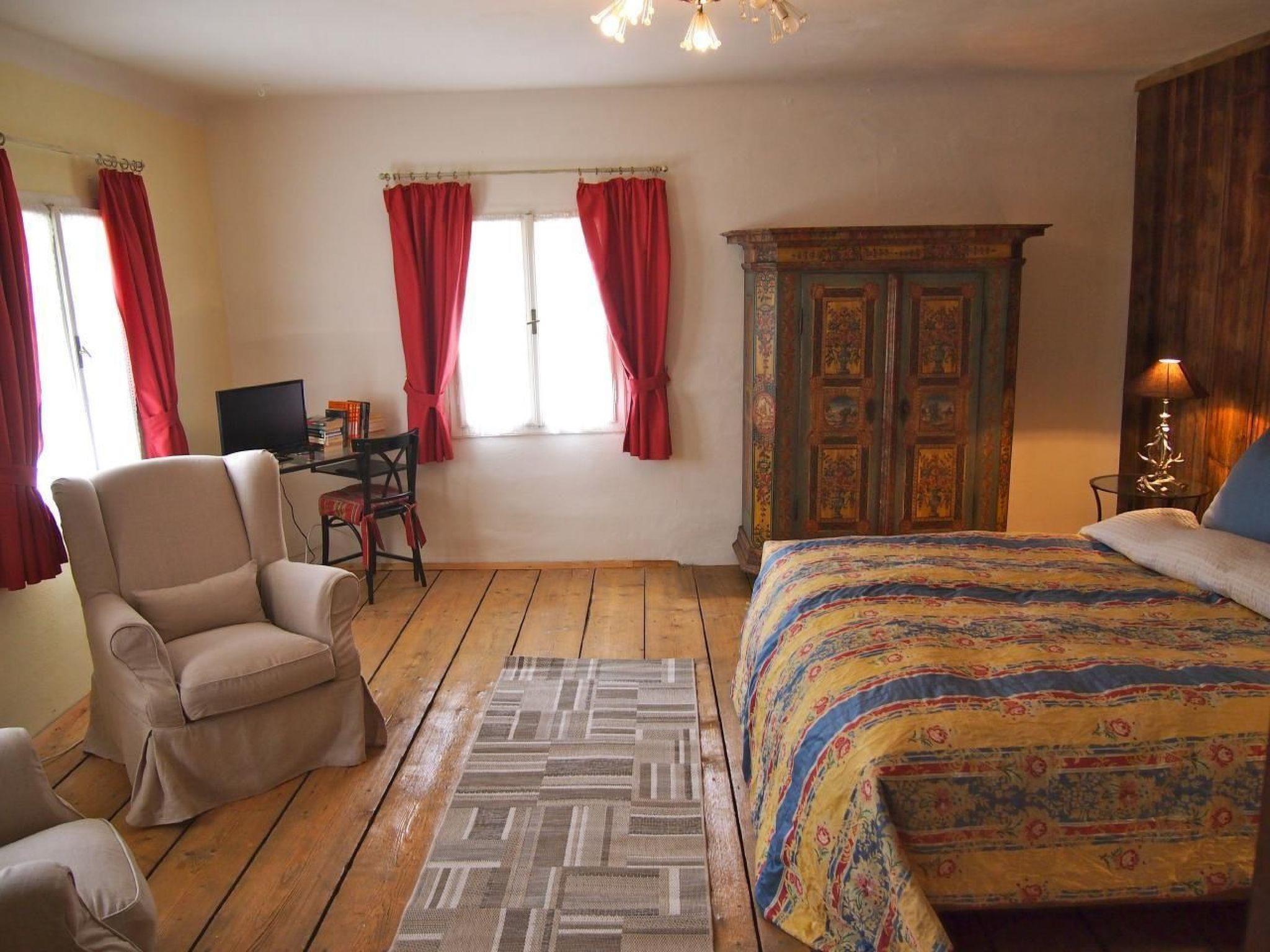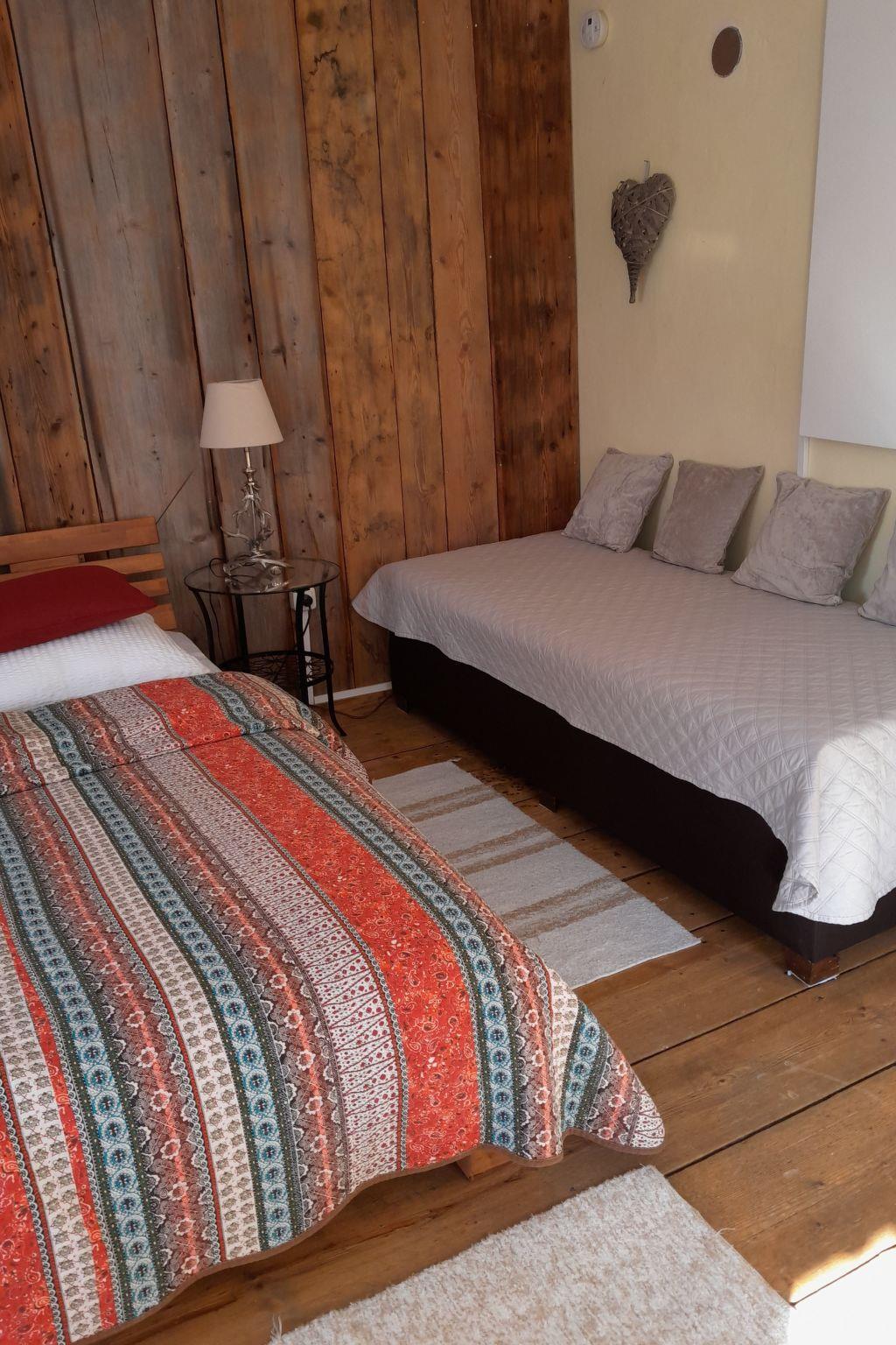 Inside you will find a cosy ground floor with living room and kitchen corner, equipped with electric hob and oven, microwave, crockery, kettle, toaster, Nespresso machine, filter coffee machine, blender and a large fridge with freezer compartment. A steep wooden staircase leads to the first floor, where there is a large bedroom with a double and single bed and an antique farmhouse wardrobe. On the upper floor, guests will find another bedroom with the same bed configuration. The house offers modern amenities such as infrared heating panels, satellite TV, a washing machine and a well-equipped bathroom with shower, WC and hairdryer.
