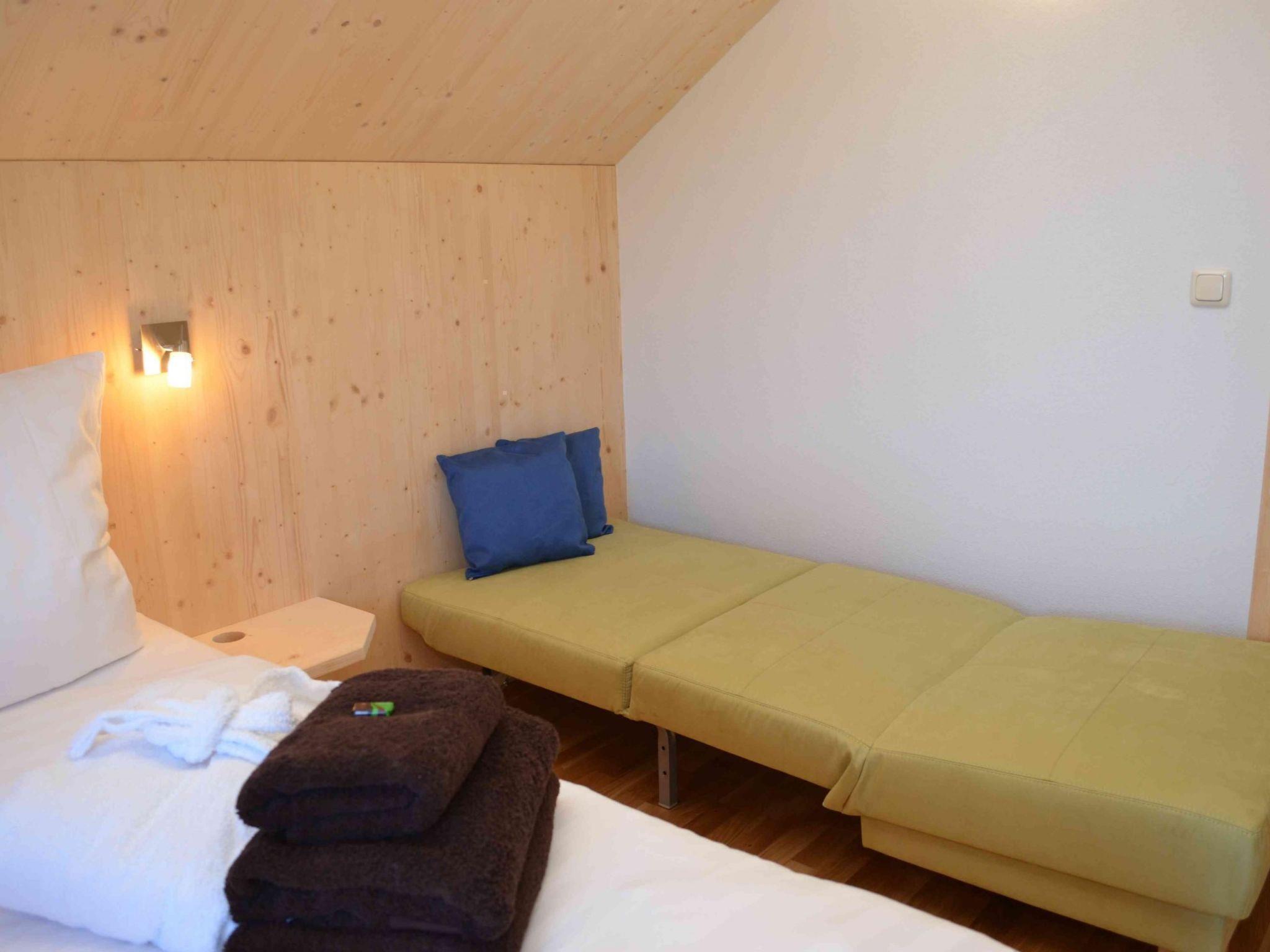 If you would like to enjoy leisure and sports activities amidst wildly romantic nature, as well as comfortable accommodation, then this is the right place for you. The chalet built according to ecological standards was completed in summer 2013. The chalet provides 150m² of space for ten people and a classy interior. It has a generous living and dining room with a gas fire, a cosy conservatory, four bedrooms and two exclusive wellness areas. The wellness area on the upper floor has a whirlpool bath for three to four people, a steam shower, and a fabulous view of Hohenwart. The wellness area on the ground floor has a quality “shasa-mi” sauna (Finnish, organic or Roman) and a shower. After a sauna you have direct to the south-facing terrace. The decorative gas fire in the living room provides pleasant warmth and a romantic atmosphere. The big and comfortable sitting area and the modern dining space provide ample space for families or friends. The living room provides everything you need for evening entertainment: flatscreen TV, DVD player, CD player, radio, wireless Internet access etc. The well-equipped kitchen has an induction hob, oven, microwave, dishwasher, big fridge-freezer, coffee machine, toaster and everyday tableware. The first bedroom has a double bed, a sofa bed and a TV. It is also possible to set up a cot here (provided). The second and third bedrooms each have a double bed. The third bedroom also has a TV. The fourth bedroom has a double bed (160 x 200cm) and a bunk bed (each 80 x 200cm). All the other double beds measure 180 x 200cm. You can also used built-in cupboards in all the bedrooms.