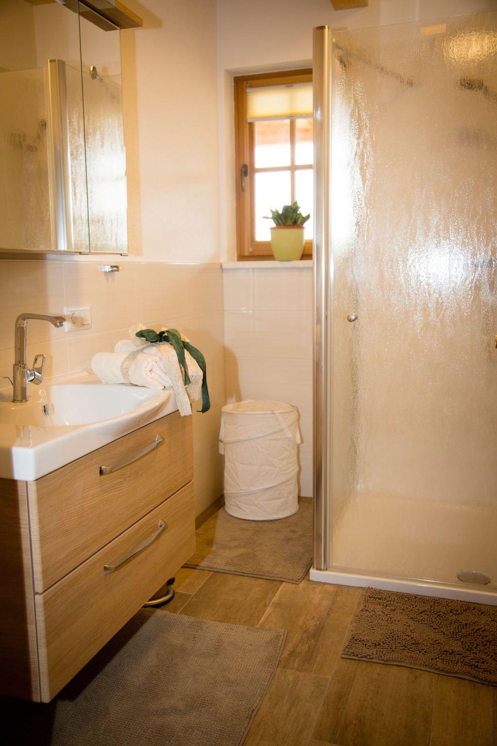 On the top floor there are 2 large bedrooms with Swiss stone pine beds, a children's room and a second bathroom with WC. The ground floor with kitchen-living room, bathroom and separate WC, as well as the room that can be used as a living room, playroom or bedroom, is also easily accessible via the terrace entrance, which is almost at ground level. This offers guests who want to avoid stairs the opportunity to use the house without difficult barriers.