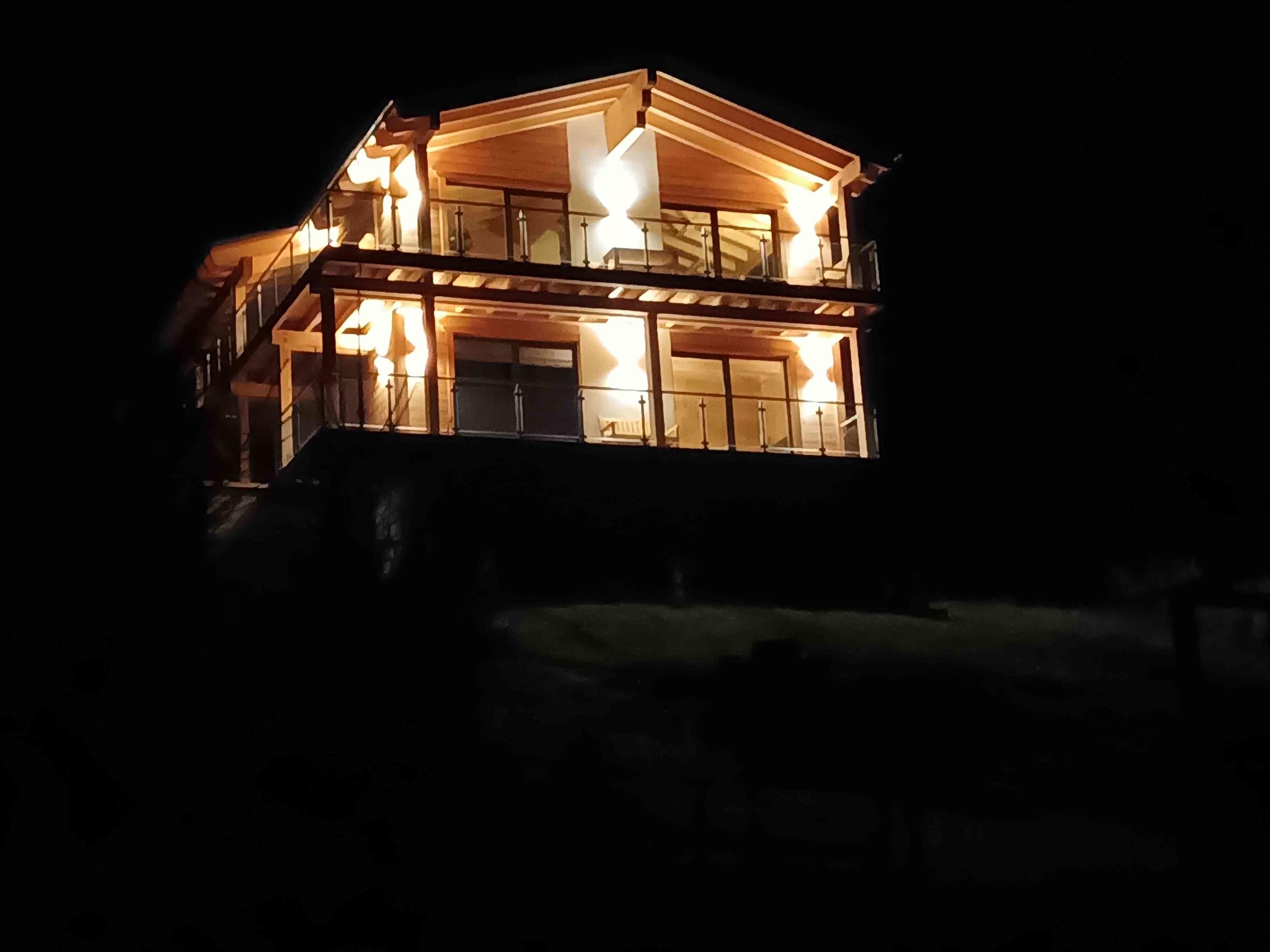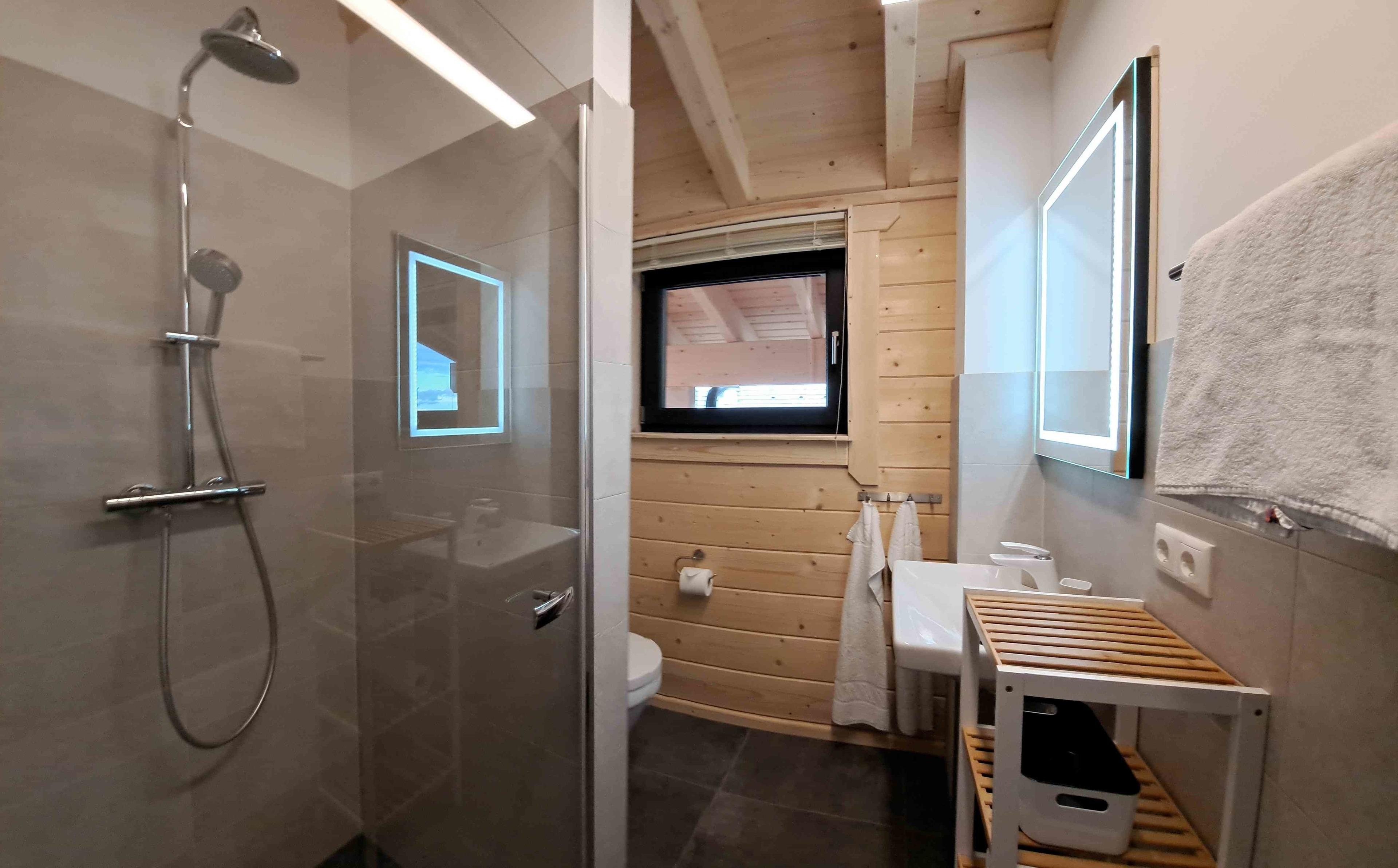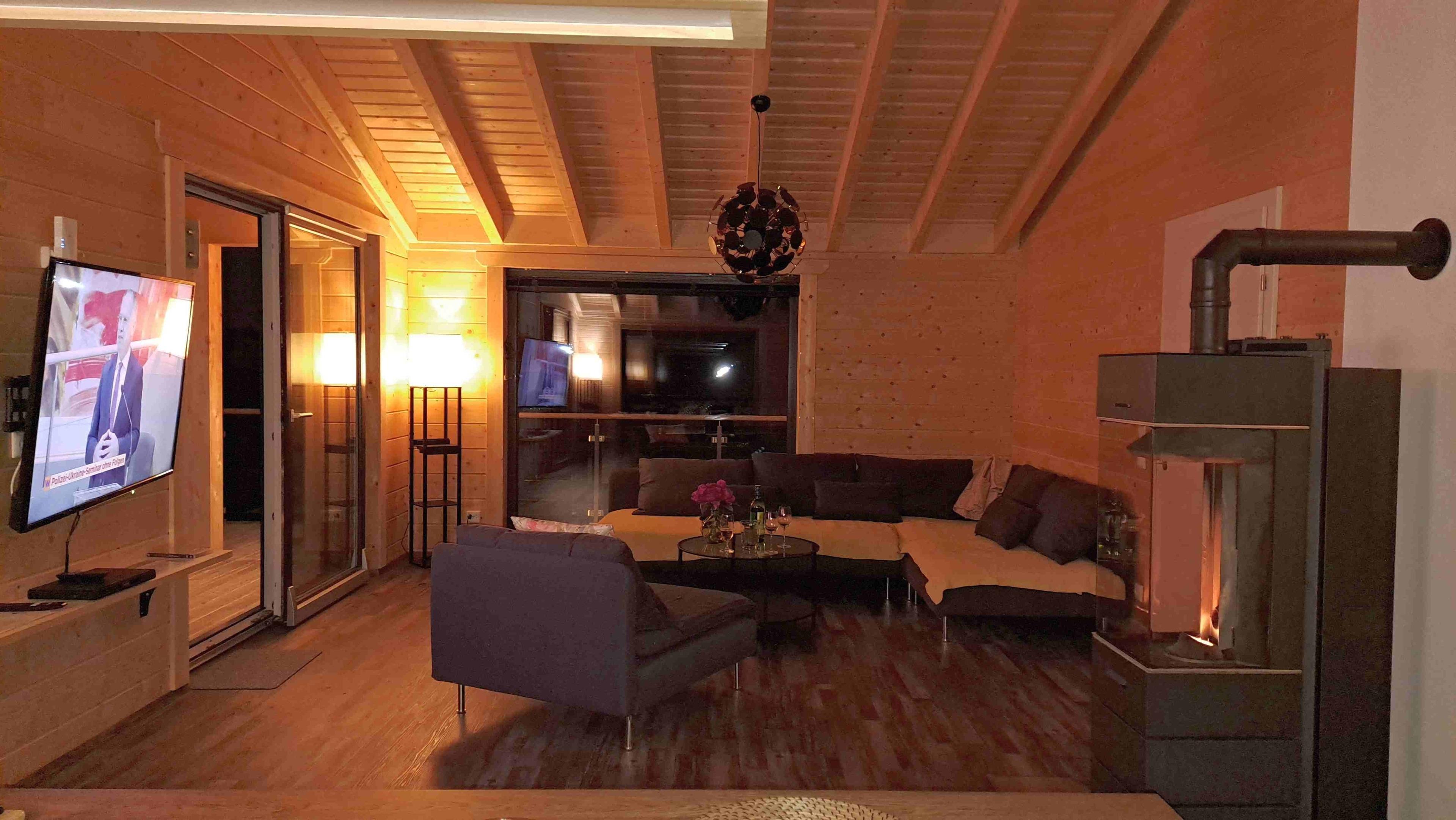 Im OG befinden sich ein Flur mit Garderobe, ein Schlafzimmer mit gegenüberliegendem eigenem Bad sowie ein weiträumiger Wohn/Ess- und Kochbereich mit Pellet-Kaminofen, Smart TV und umlaufendem Balkon mit Außenmöbeln. Im UG befinden sich eine Kombi Sauna ( Finnisch u. Infrarot) mit XL Dusche sowie 2 Schlafzimmer mit En-Suite-Badezimmern sowie ebenfalls umlaufendem Balkon und Terrasse. Im UG gibt es einen separaten 2. Eingang.