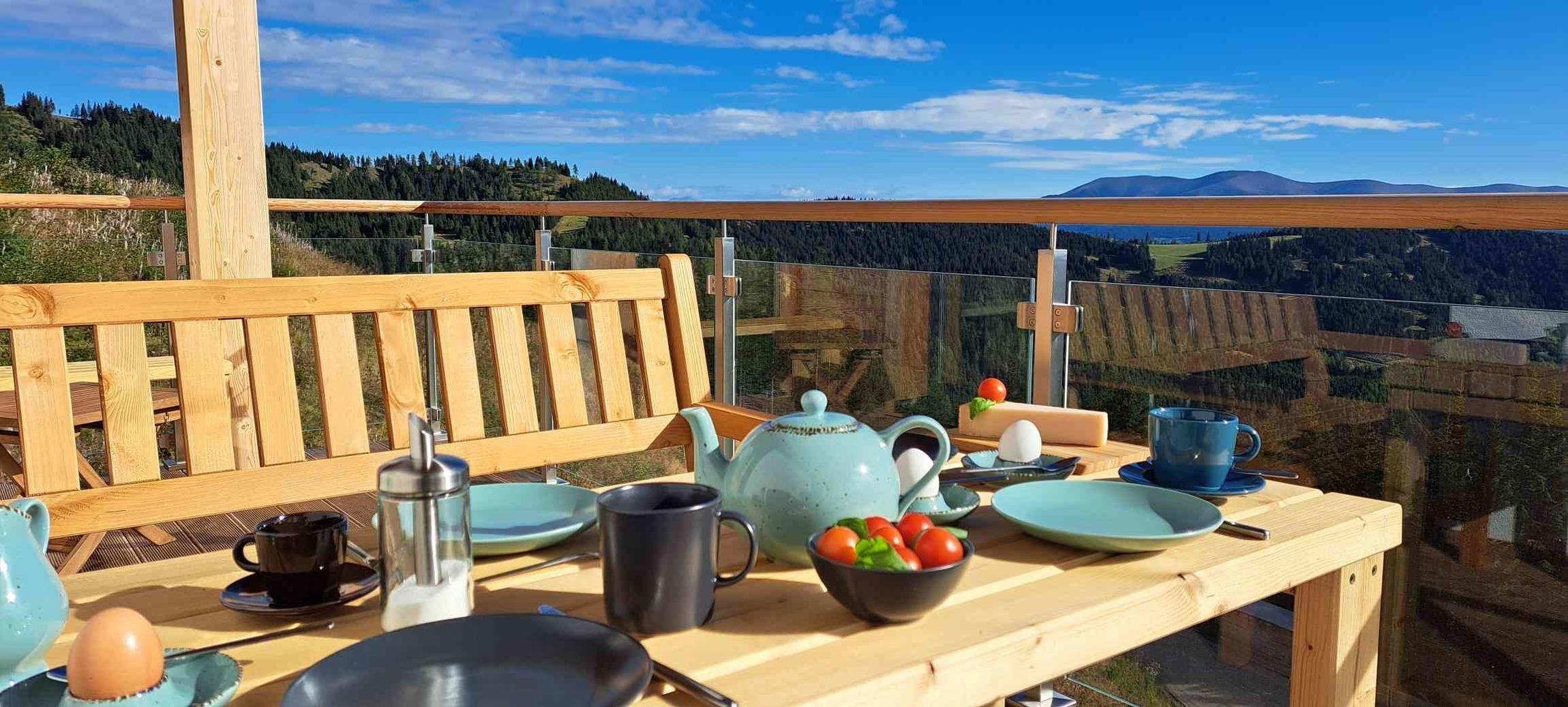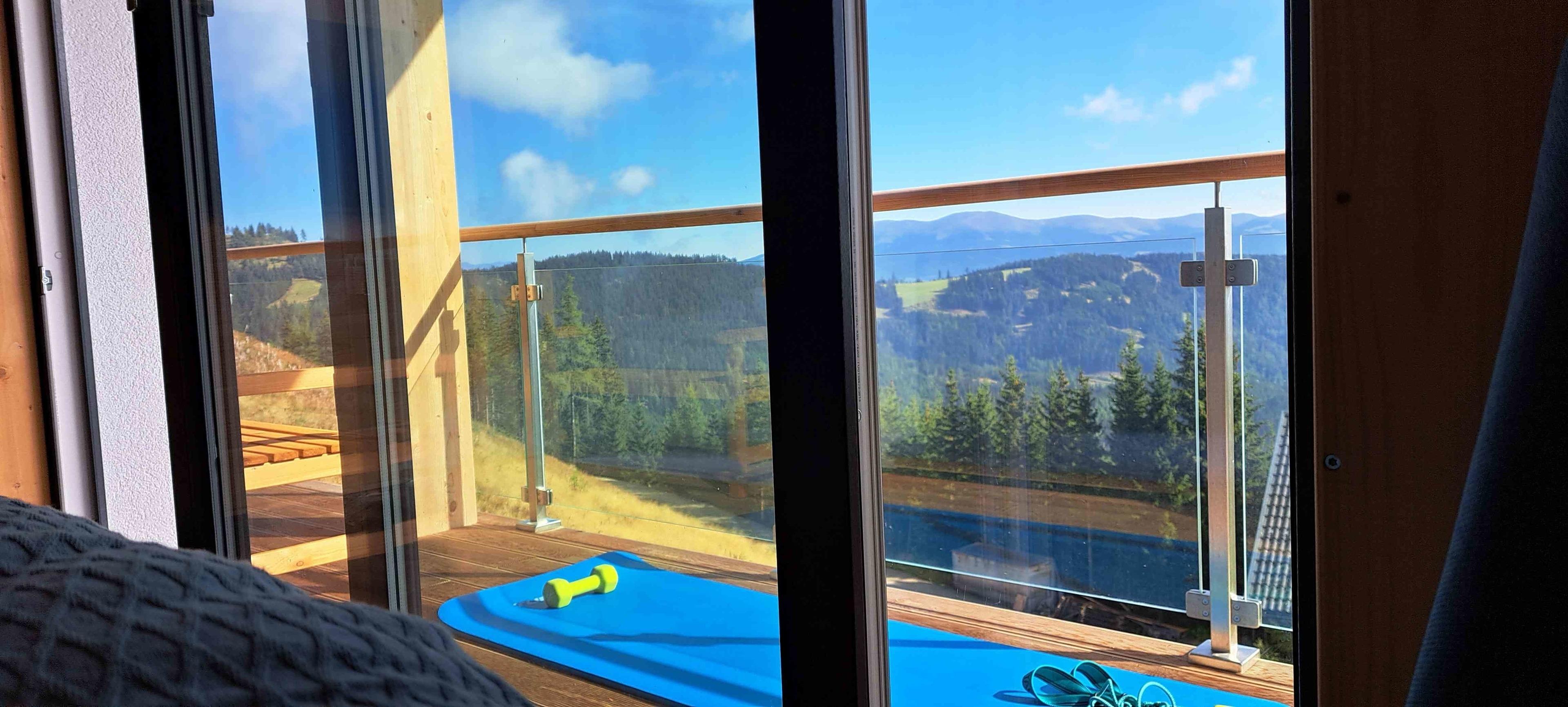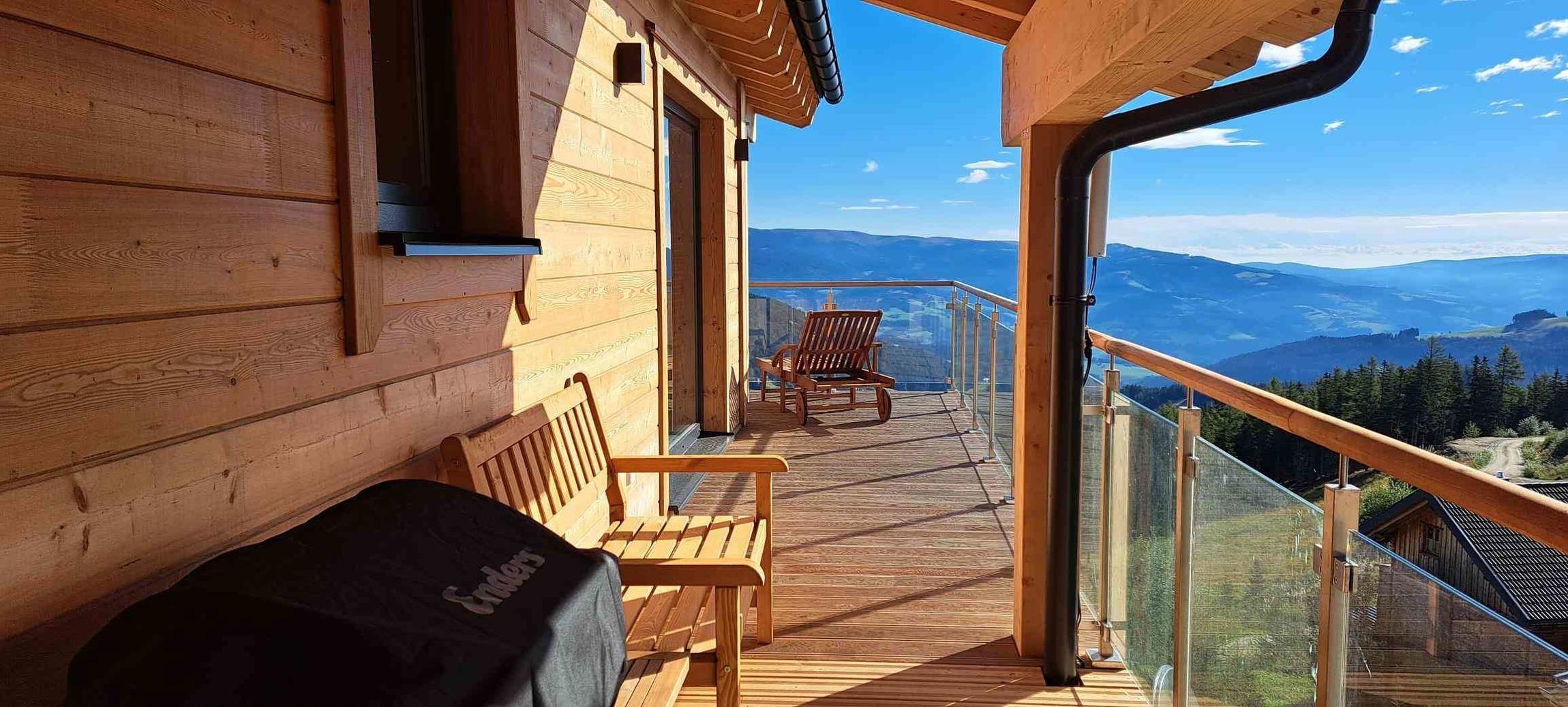 - Zweiseitig umlaufender Balkon auch vor dem Schlafbereich lädt mit Bänken zum Verweilen oder zur morgendlichen Gym/Yoga Einheit gleich aus dem Bett in die frische Almluft ein.