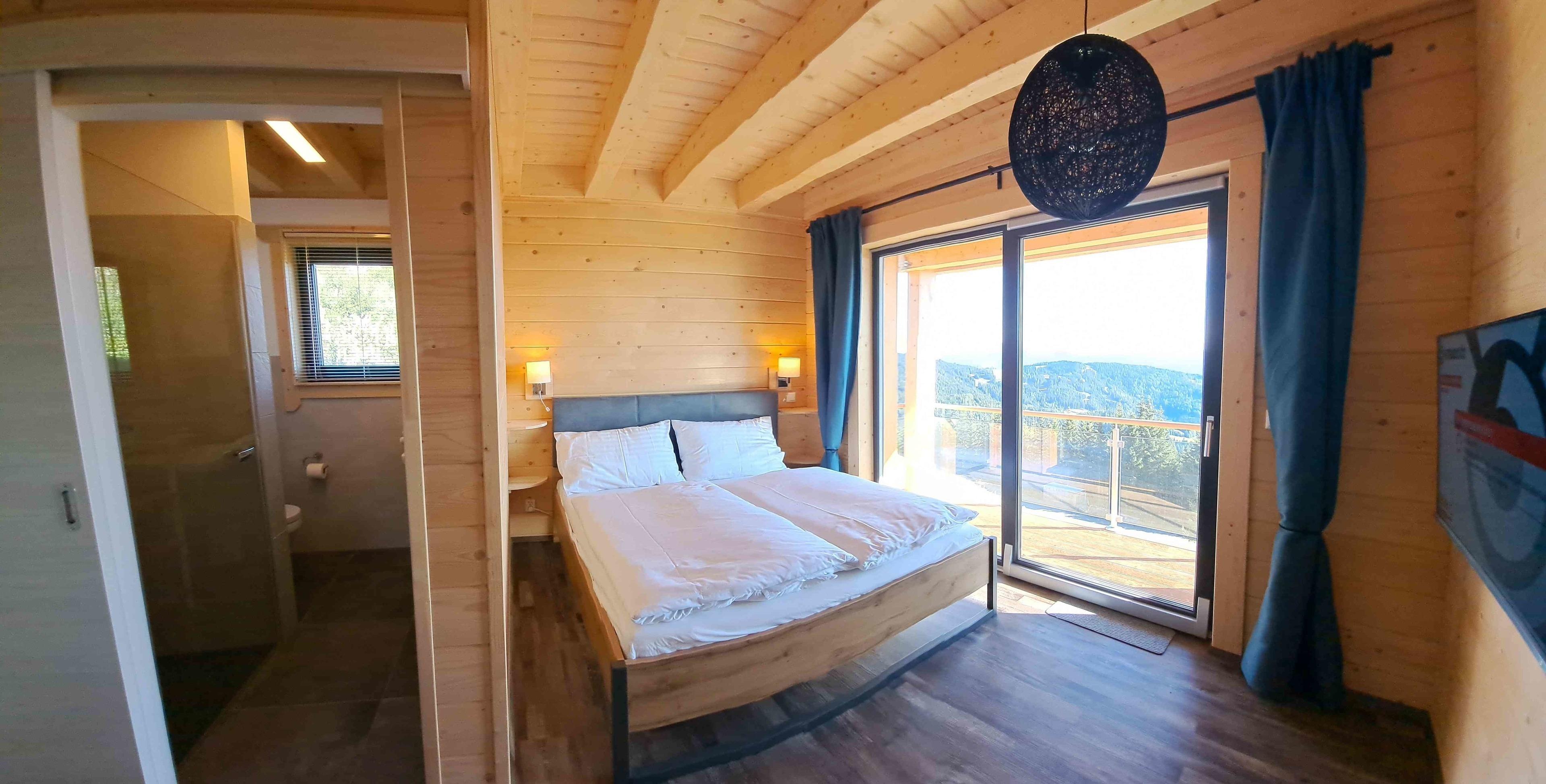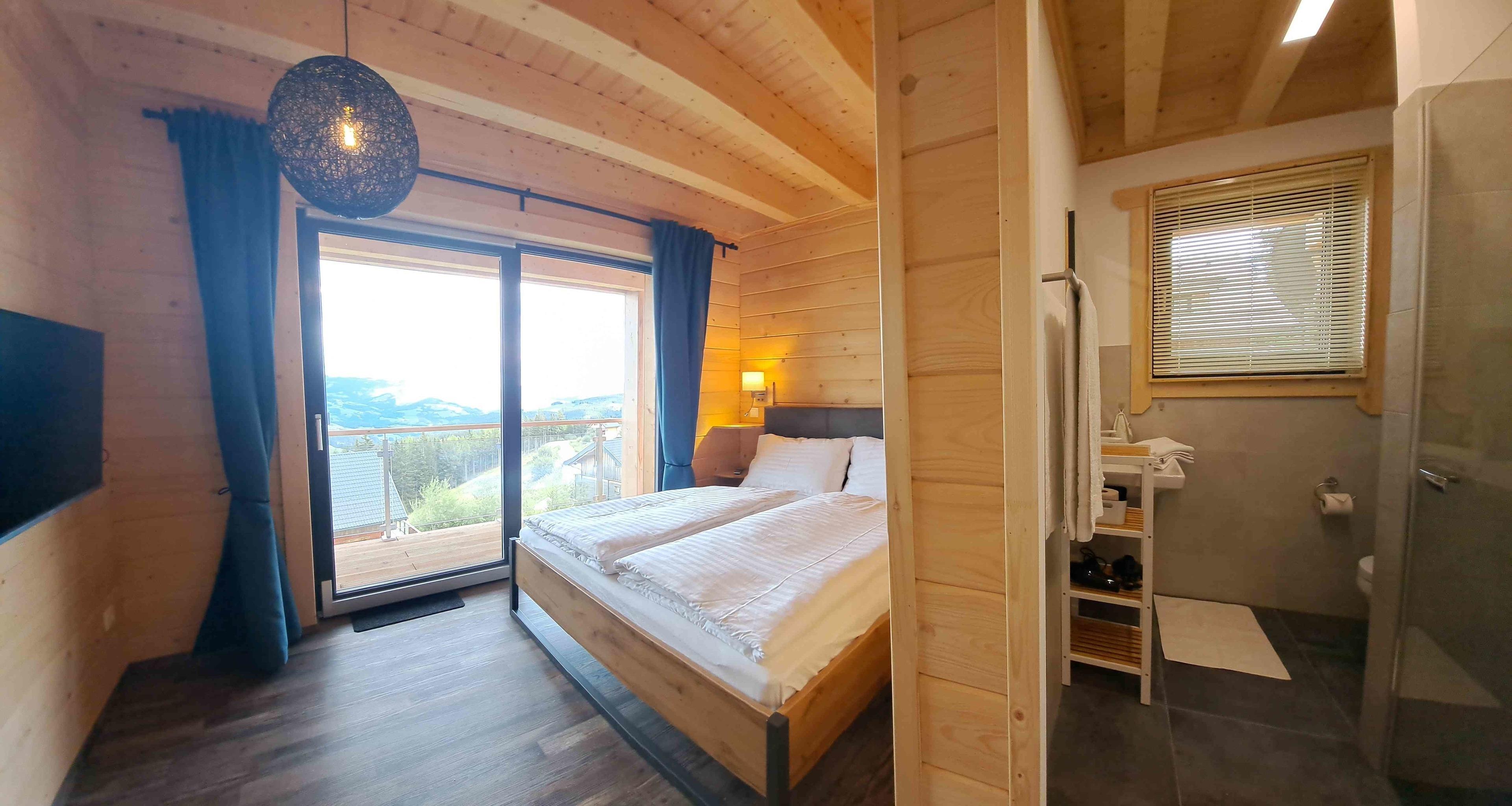 -Raumhohe Schiebekippfenstertüren ermöglichen die Sicht vom Bett direkt in die Berge.