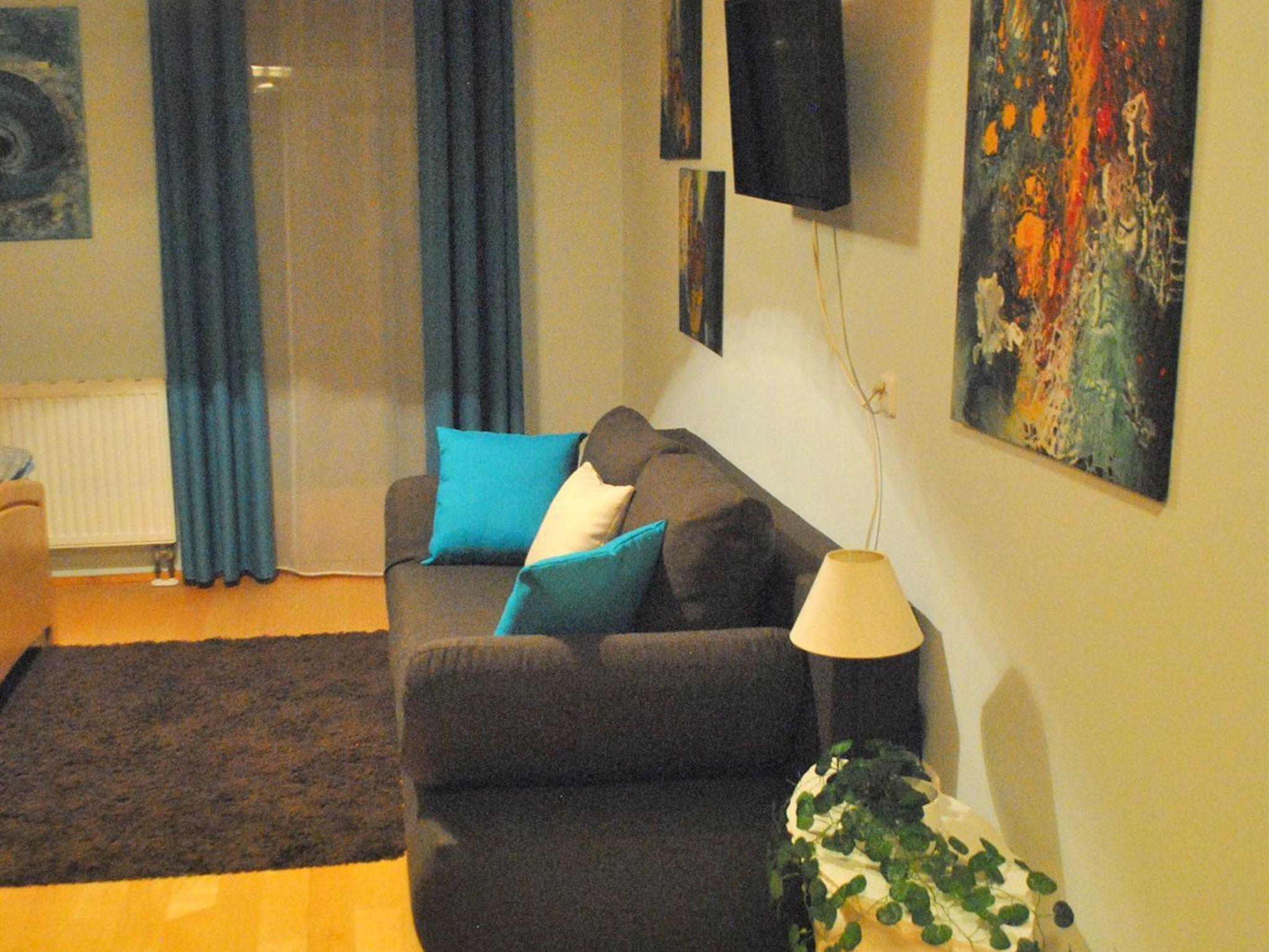 Apartment 2 (40 qm): Wohnküche mit Mini-Geschierspüler, Schlafsofa, TV; Schlafzimmer mit Schlafsofa, TV; Dusche, WC, Balkon mit 4 qm