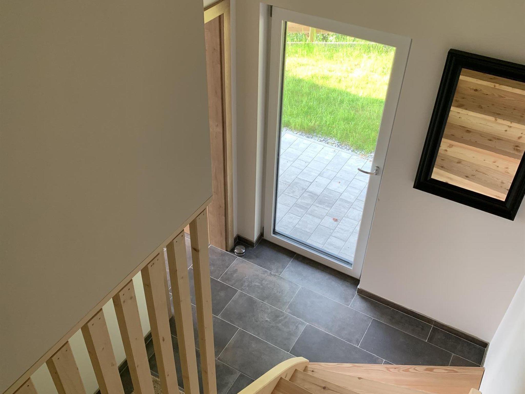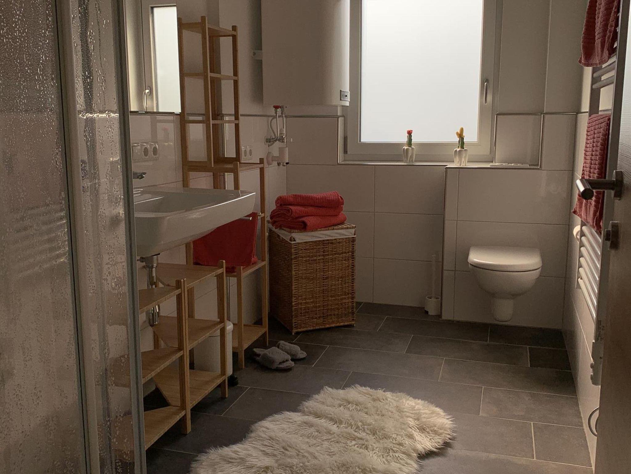Ebenfalls im Erdgeschoss befindet sich das Bad mit Dusche und WC sowie einem Handtuchwärmer.