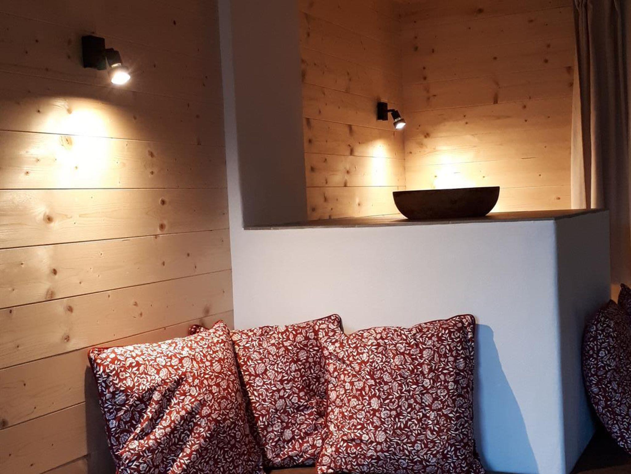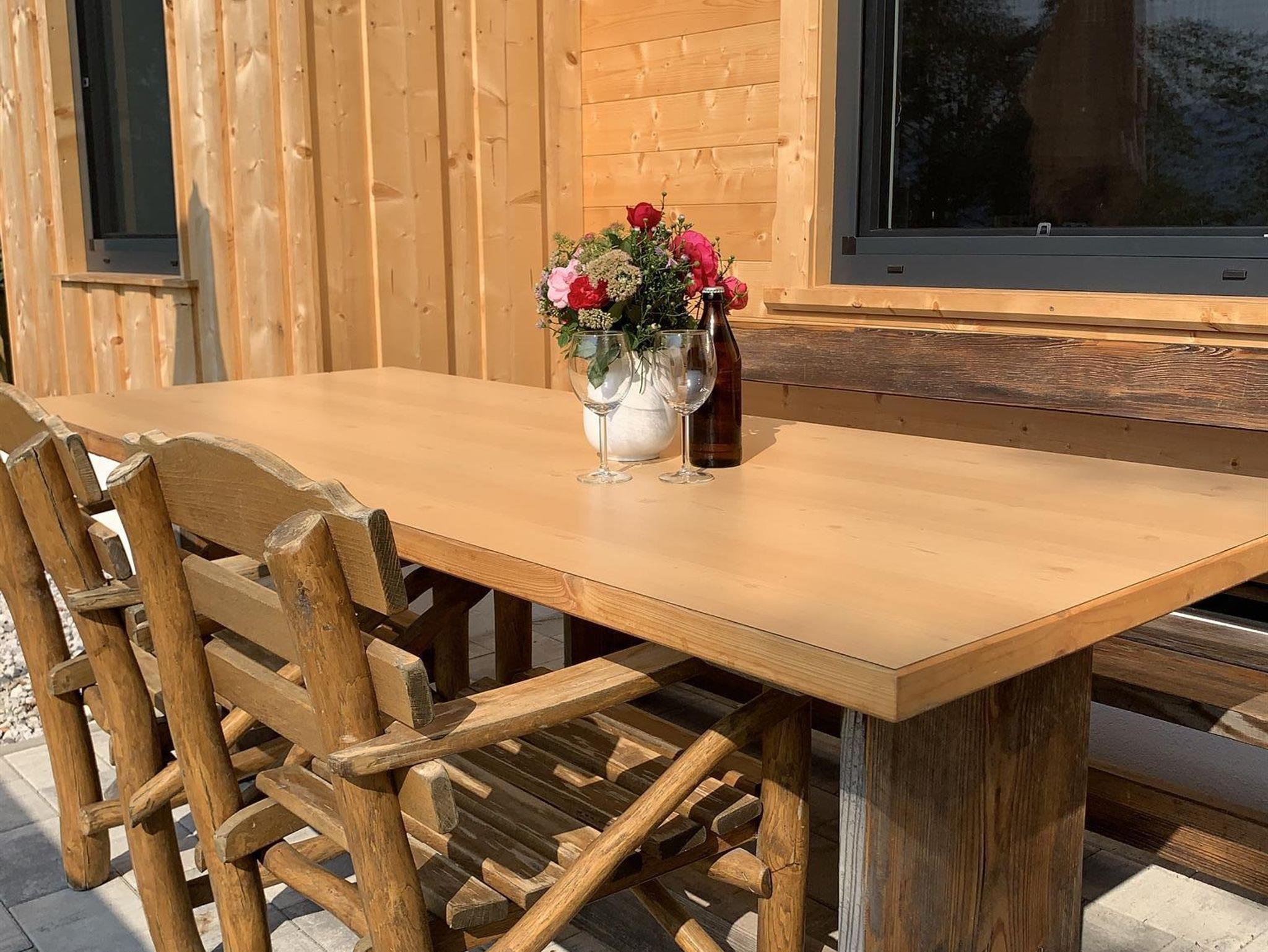 Gleich neben der Küche ist das Wohn-/Esszimmer mit einer Essecke. Der große Ofen (Holzpaket inkl.) mit seiner gemütlichen Ofenbank bietet genug Platz für alle. Auf der Terrasse mit Blick auf den See, die über den Wohn-/Essbereich zu erreichen ist, findet man ausreichend Sitzgelegenheit.