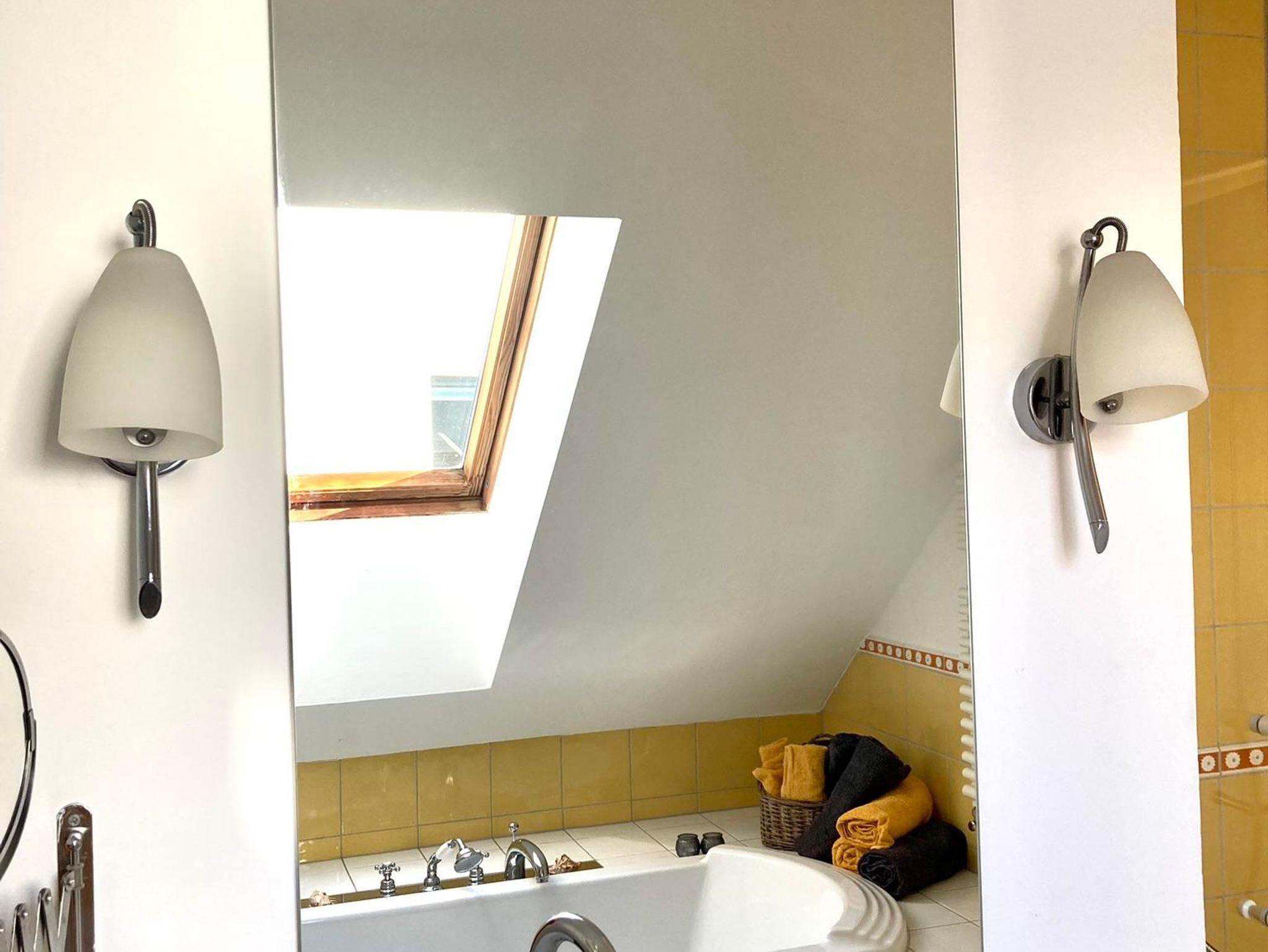 Das Bad ist von 2 Seiten zugängig und von der Badewanne aus genießen Sie einen umwerfenden Blick in den Sternenhimmel.