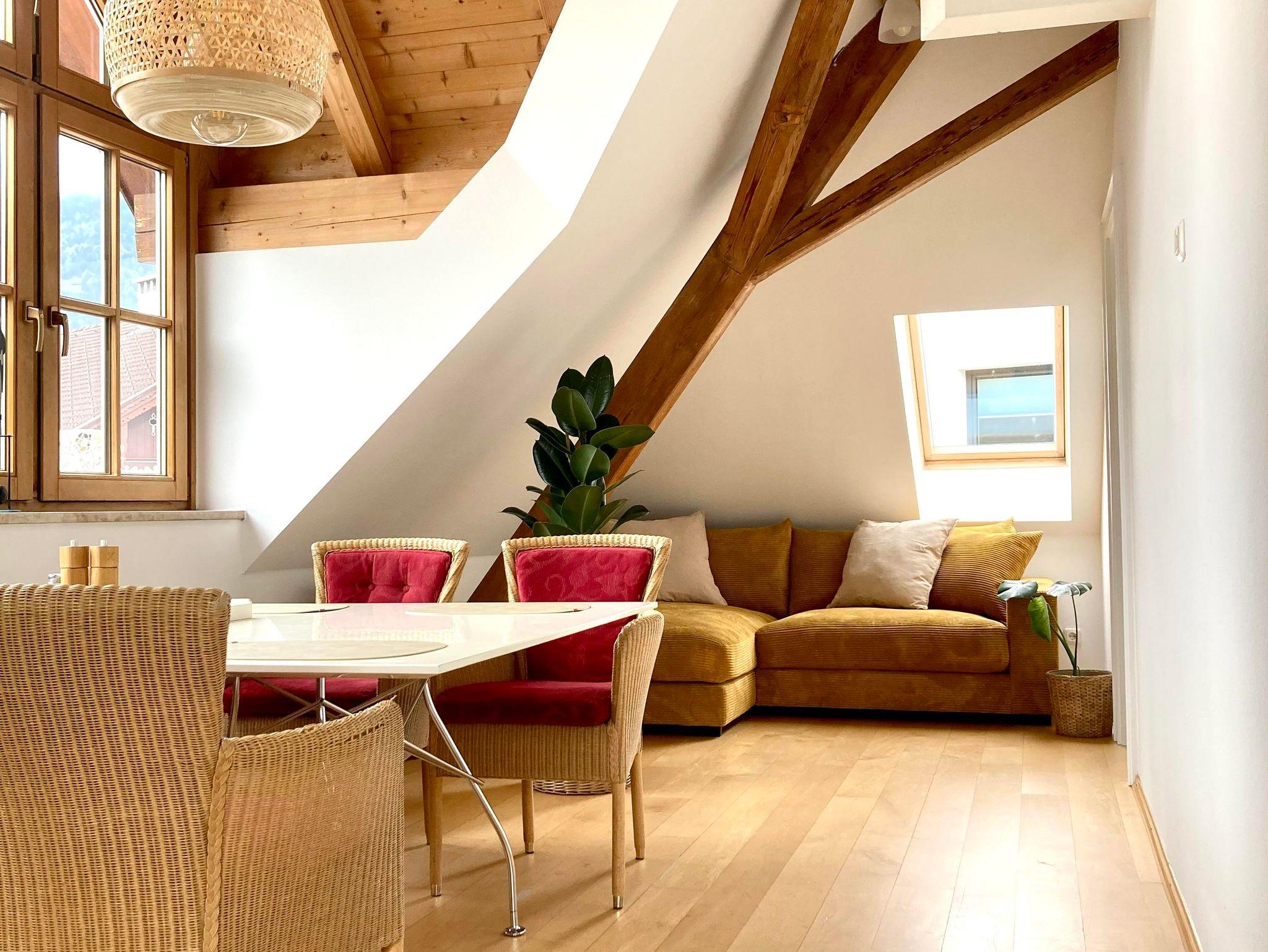 Mit viel Liebe zum Detail haben wir das Apartment eingerichtet, damit Sie Ihren Urlaub genießen können. Sie werden sich fühlen wie auf Wolke 7. Die Räumlichkeiten sind hell, luftig und mit vielen Naturmaterialien ausgestattet. Dachfenster geben den Blick in alle Himmelsrichtungen und die umliegende Bergwelt frei. Im Wohnbereich ist eine große Fensterfront mit Blick Richtung Westen.