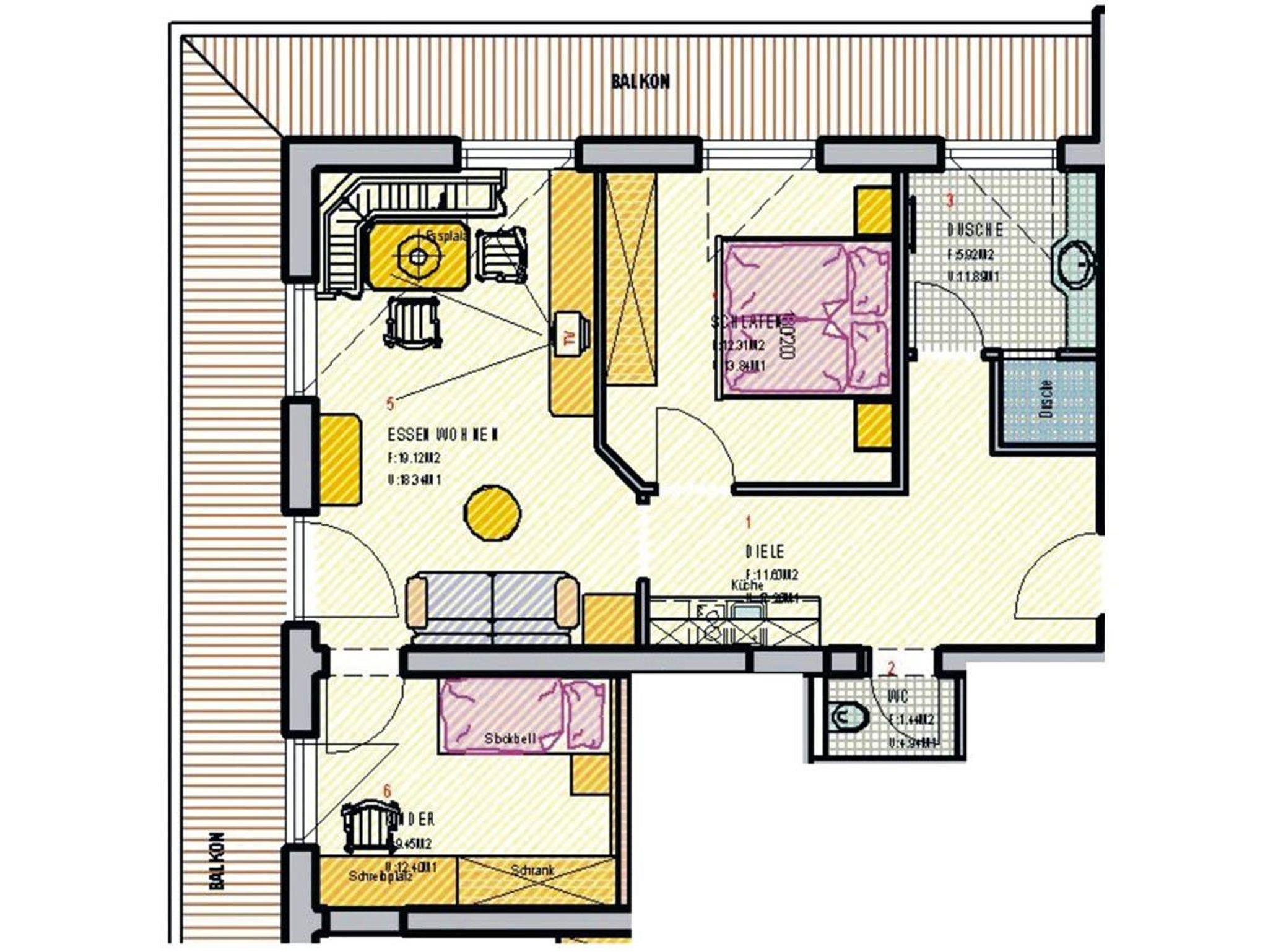 3-Zimmer-Appartement mit 59,84 m², für 1-5 Personen, im 1. Obergeschoss, Blick auf das Rofangebirge und den Reintalersee, Fenster und großer Eckbalkon: Nord/West Ausstattung: 1 Doppelbettzimmer, 1 Kinderzimmer mit Stockbett und Schreibtisch, 1 Sofa im Wohnbereich - zum Ausziehen als großes Einzelbett oder als Doppelbett für Kinder verwendbar; Kochnische und gemütliche Eckbank, Bad: Dusche u. Waschbecken; WC extra, Vorraum; inkl. Bettwäsche.