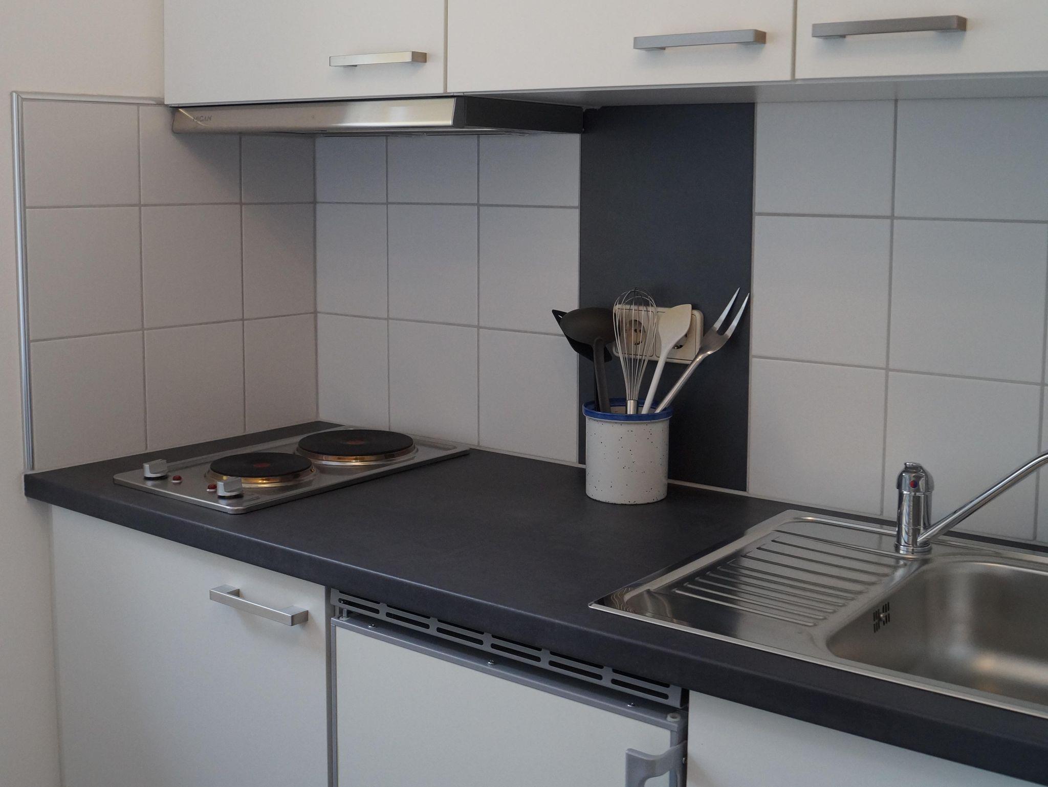 Küche: mit 2x Kochfeld, Mini Backofen, Schränke, Kühlschrank mit Gefrierfach, Filter Kaffeemaschine, Wasserkocher und Geschirr