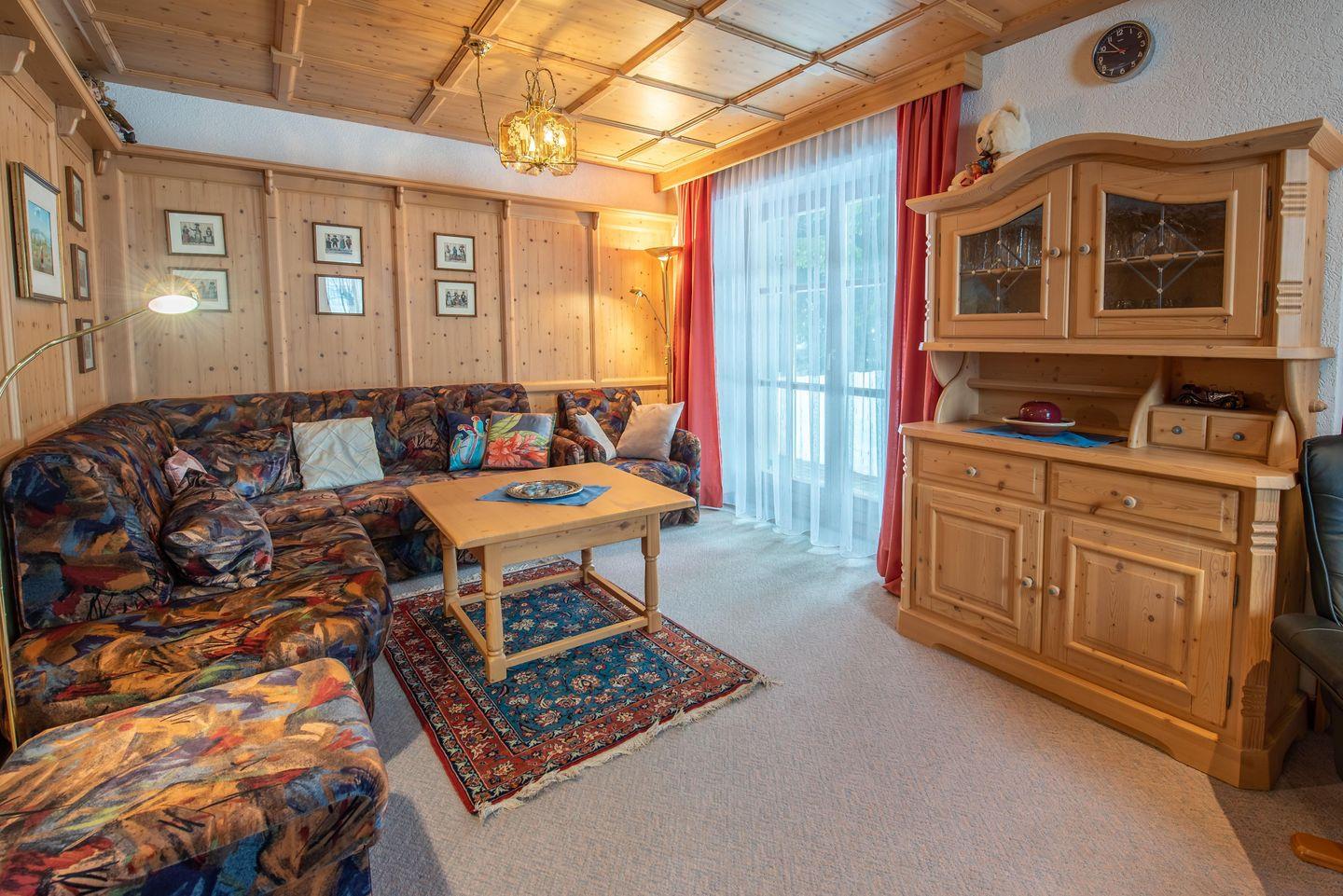 Der große und sehr gemütlich ausgestattete Wohnraum kombiniert die regional typische Ausstattung bestehend aus Holz und rustikalen Elementen mit einer sehr gemütlichen Sitz- und Couchecke.