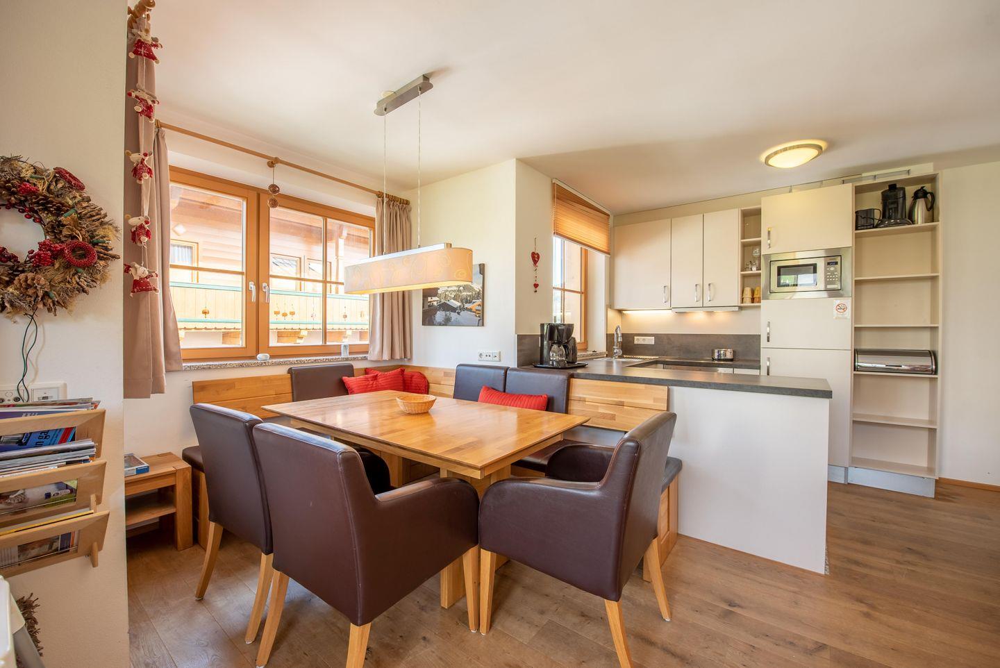 Die offene Küche mit Essbereich lädt zum Kochen und Verweilen ein – nicht nur, aber besonders Paare und Familien werden aufgrund der schönen Raumaufteilung hier ein entspanntes und ruhiges Feriendomizil finden.