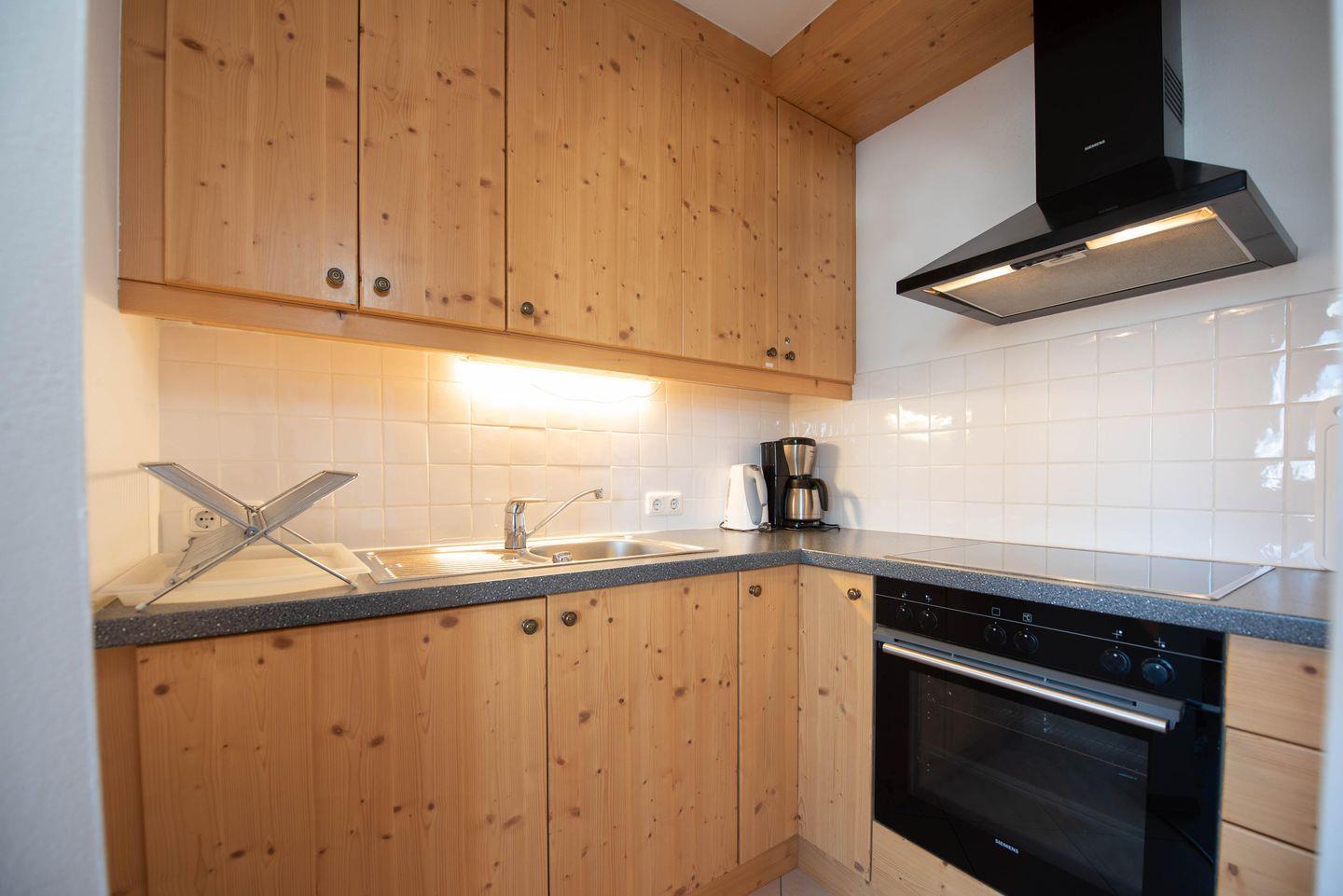 Helle Räume, die Verwendung von ortstypischem Holz und eine perfekte Raumaufteilung ergeben eine sehr offene, ansprechende Atmosphäre. Die gut ausgestattete Küche lässt deutlich mehr kulinarische Gestaltung als Kaffee- oder Teekochen zu. Die Ferienwohnung ist überwiegend mit Fliesenboden ausgestattet und bietet im Wohnzimmer gemütliche Sitzmöglichkeiten, moderne Medien und ausreichend Platz für einen gemütlichen Abend mit Familie oder Freunden.
