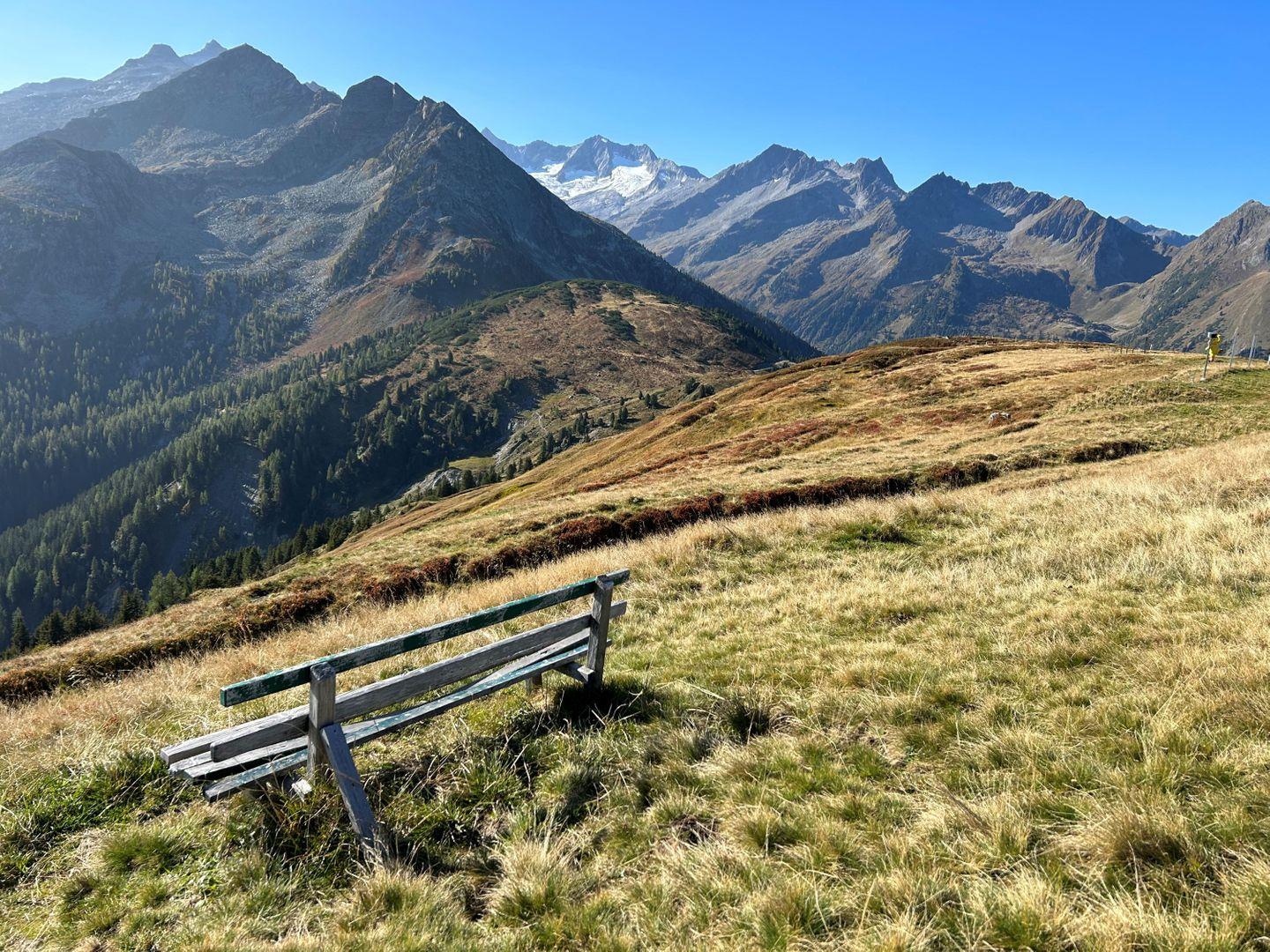 Eine große Terrasse mit Gartenmöbel und postkartentauglichem Panorama des Nationalparks Hohe Tauern lädt zu kleinen Ski-Pausen bei einem erholsamen Snack in der Sonne ein.