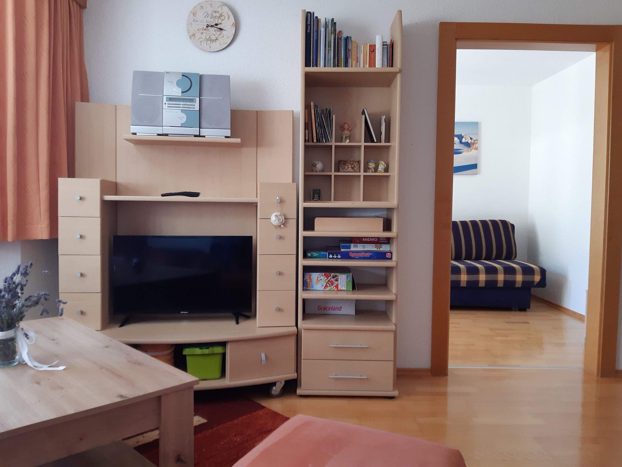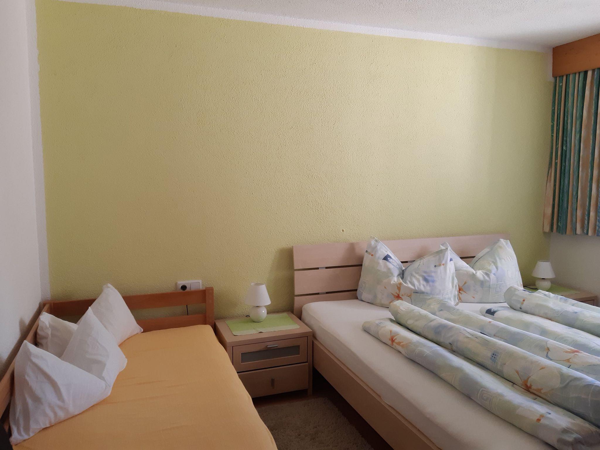 1 Schlafzimmer mit Doppelbett (190x200) und separaten WC, 1 Schlafzimmer mit Doppelbett (190x200) und 1 Zusatzbett (90x200), Wohnzimmer mit Couch, Kachelofen und Ofenbank, Flachbild-SAT-TV, nebenan vom Wohnzimmer ein Einzelzimmer mit Schlafcouch (160x190).