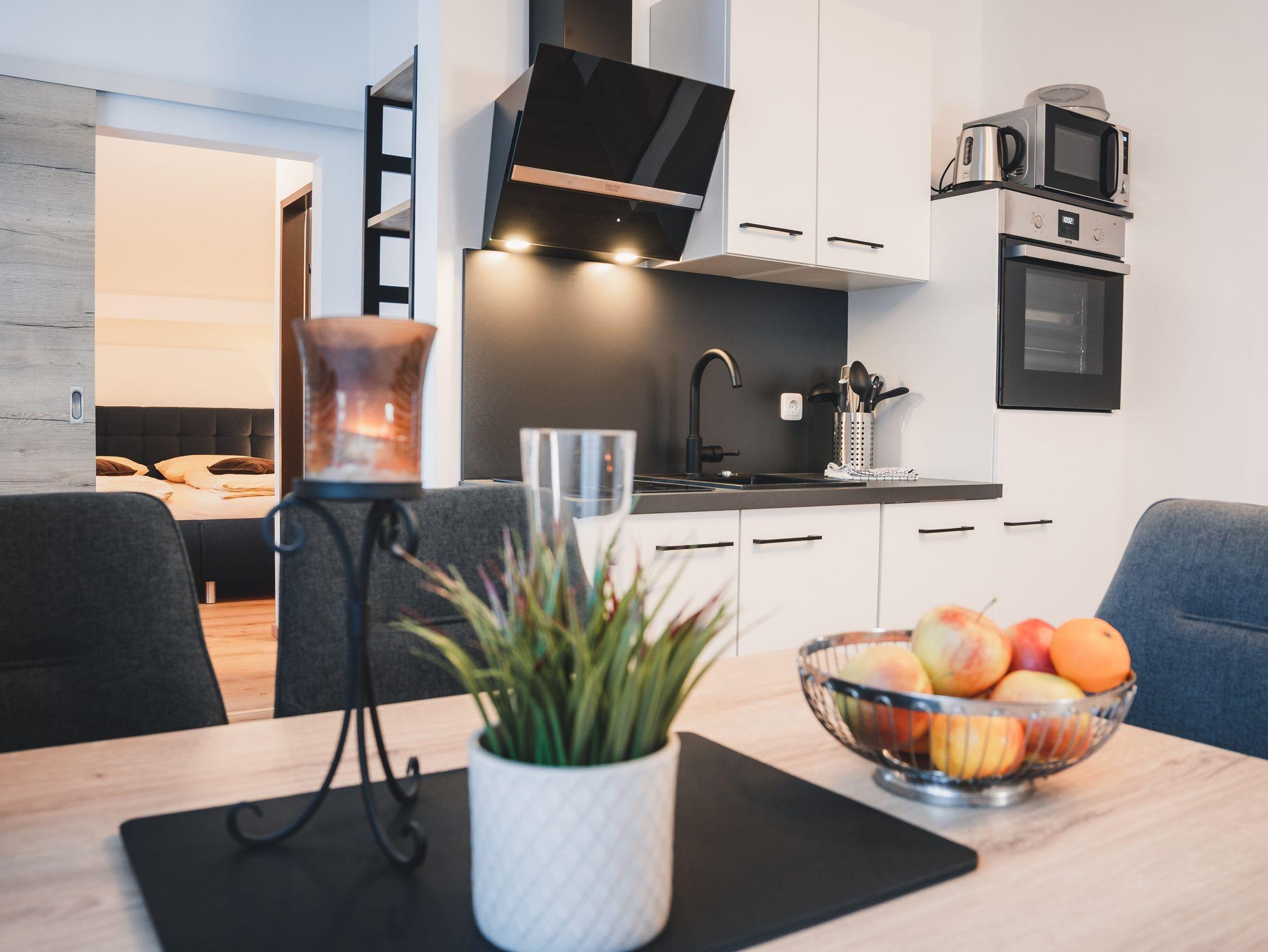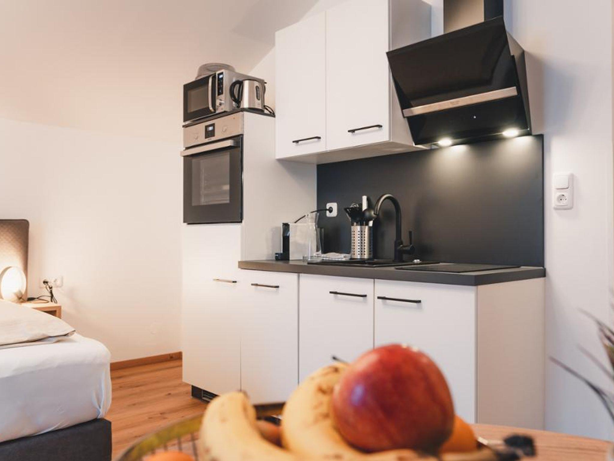 Das Appartement bietet eine voll ausgestattete, moderne Küche mit E-Herd, Backofen, Geschirrspüler, Mikrowelle, Nespresso Kaffeemaschine, Kühlschrank, Wasserkocher, Geschirr und Besteck.