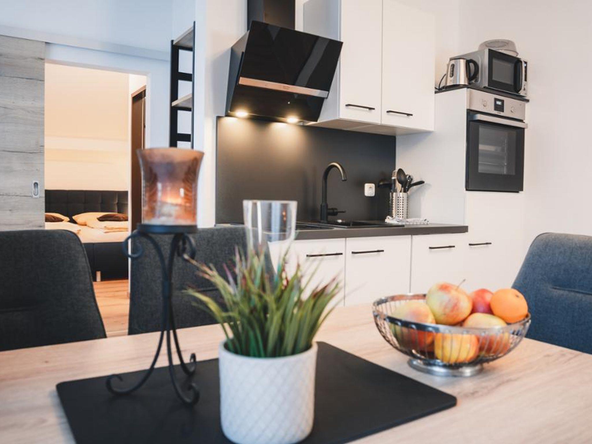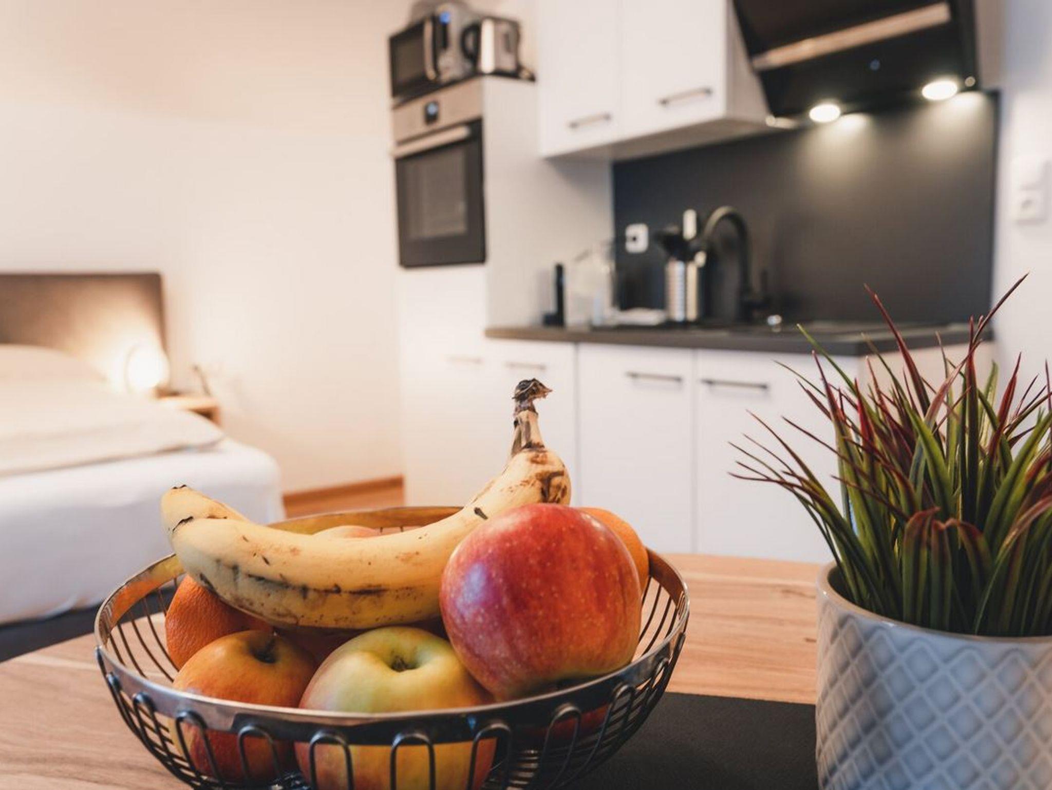 Das Studio bietet eine voll ausgestattete, moderne Küche mit E-Herd, Backofen, Geschirrspüler, Mikrowelle, Nespresso Kaffeemaschine, Kühlschrank, Wasserkocher, Geschirr und Besteck.