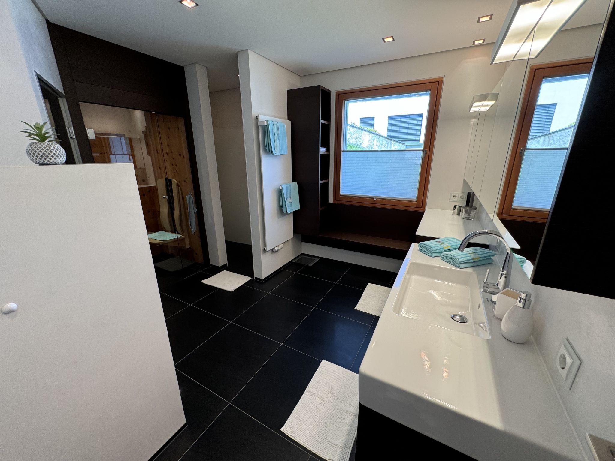 "Villa Renate", 4-room villa 130 m2 on 2 levels. Object suitable for 6 adults. Spacious and bright, luxurious and tasteful furnishings: on the lower ground floor: 1 room with 1 double sofabed, 1 double bed, bath/shower/WC and satellite TV. Upper floor: living/dining room with satellite TV (flat screen). 1 double bedroom with satellite TV. Large, open kitchen (oven, dishwasher, 4 ceramic glass hob hotplates, toaster, kettle, microwave, freezer). Shower/WC. Very beautiful panoramic view of the mountains and the countryside. Facilities: children's high chair. Internet (WiFi, free). Suitable for families. A stroller and high chair are available to guests of the house free of charge.