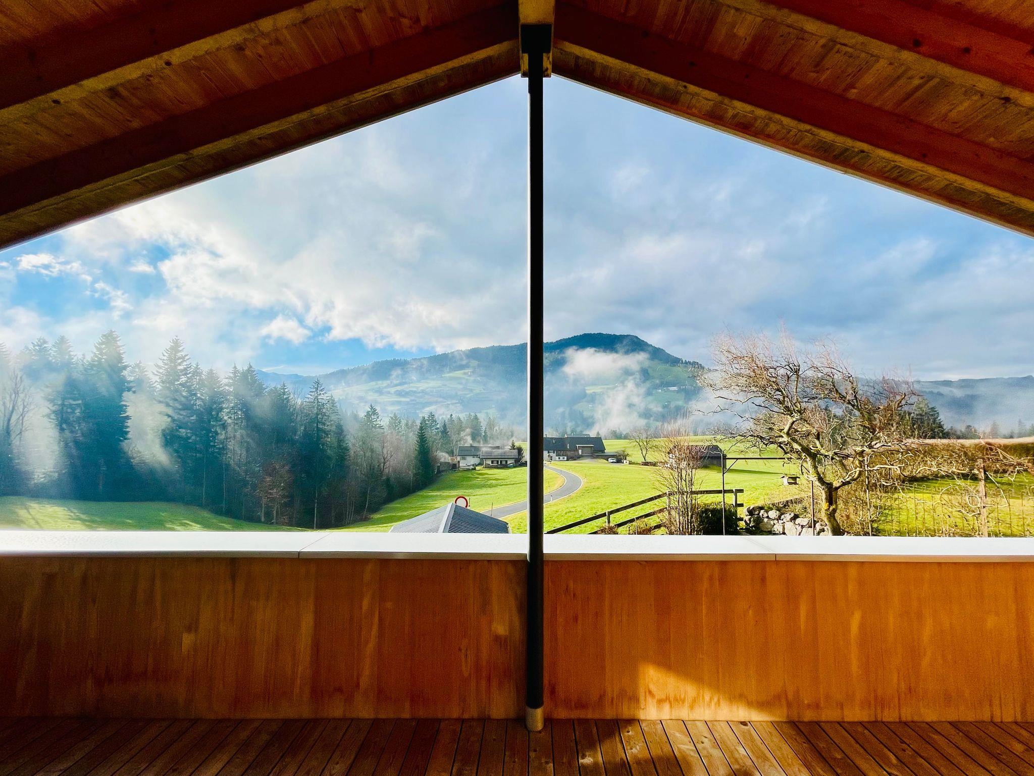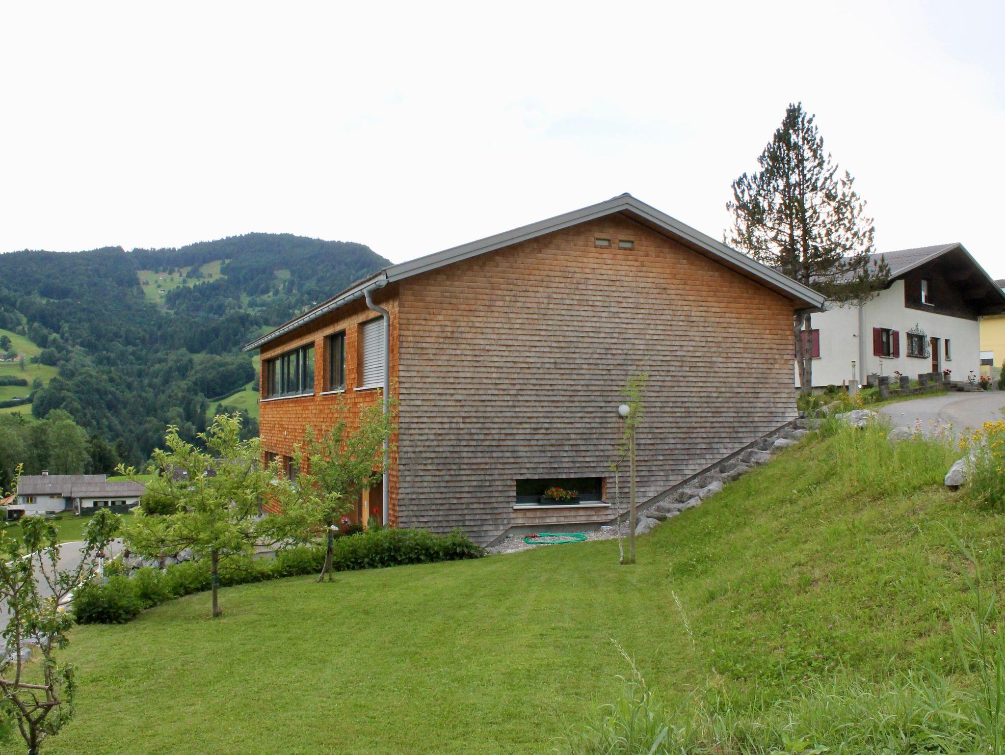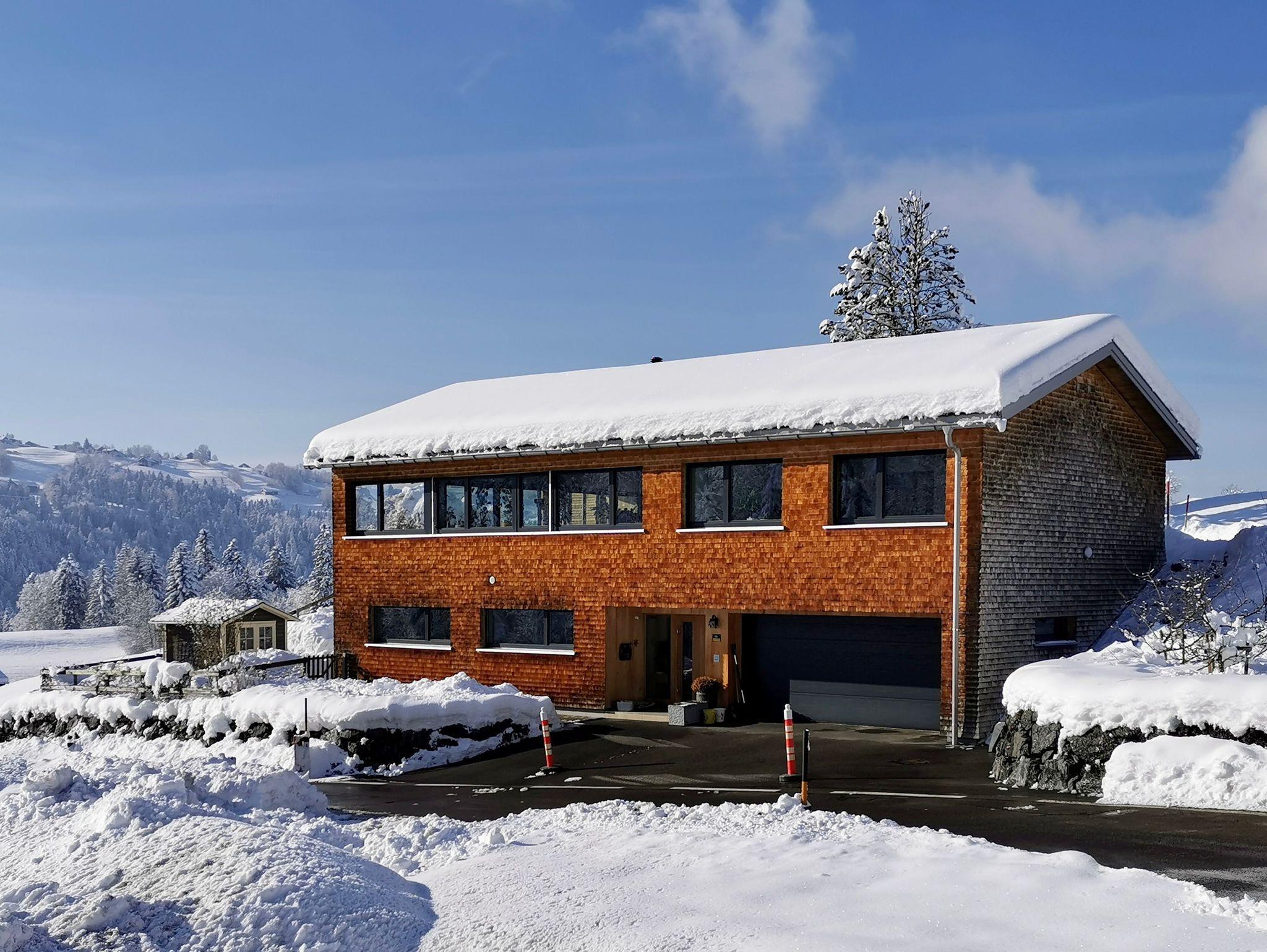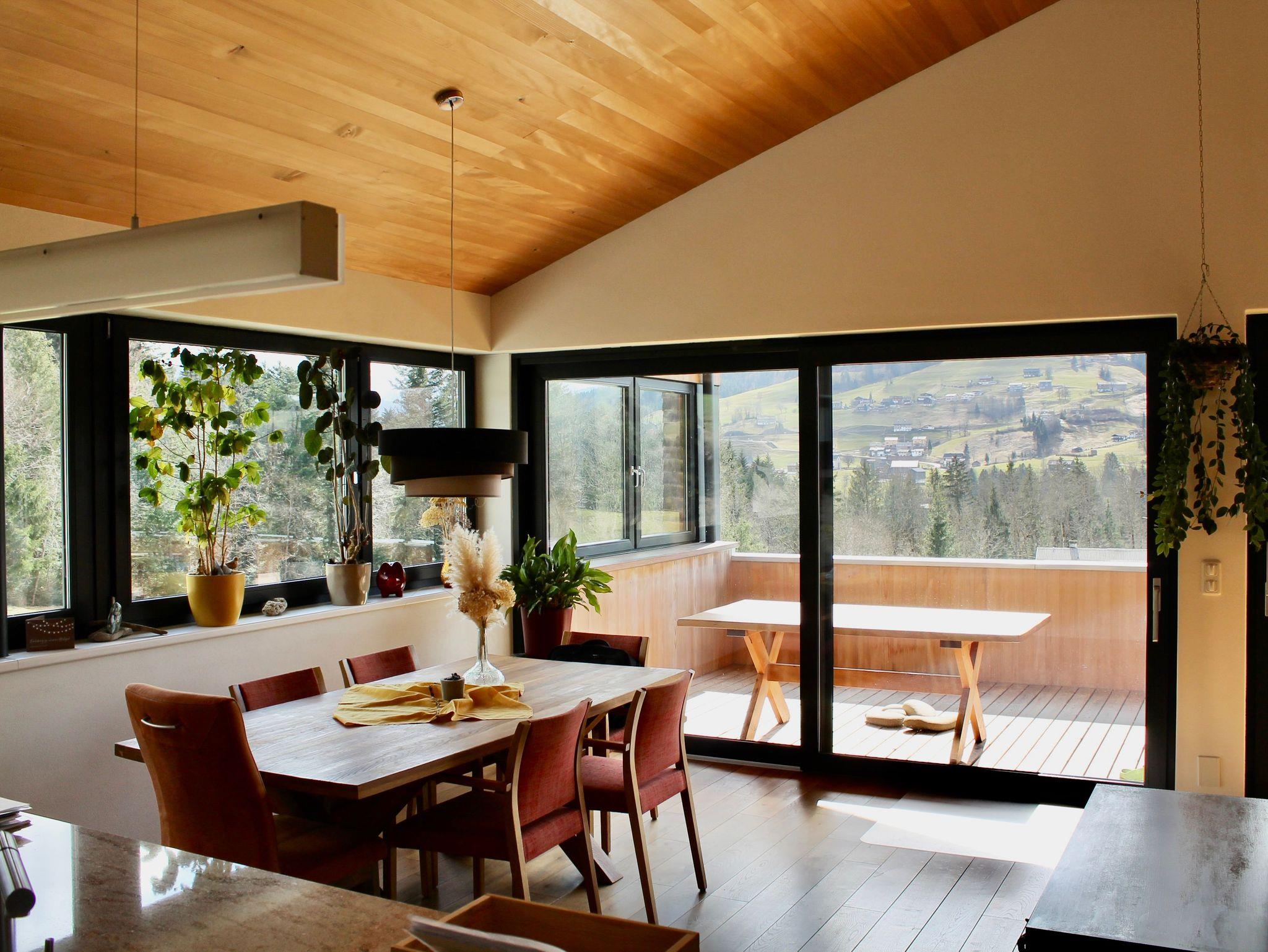 Vollholz Eichenboden und Fliesen, Fussbodenheizung, Erdwärmepumpe, Luftaustausch durch kontrollierte Be- und Entlüftung, moderne bregenzerwälder Bauweise mit Holzschindeln, hoher offener Wohnbereich mit Raumhöhe bis zu 4 m, moderner Holzofen, komplett ausgestattete Wohn-/ Essküche, Bad mit Badewanne und begehbarer Dusche, Schlafzimmer, Büro, überdachte große Terrasse nach Süden, direkter Zugang zum Garten, Parkplätze vor dem Haus