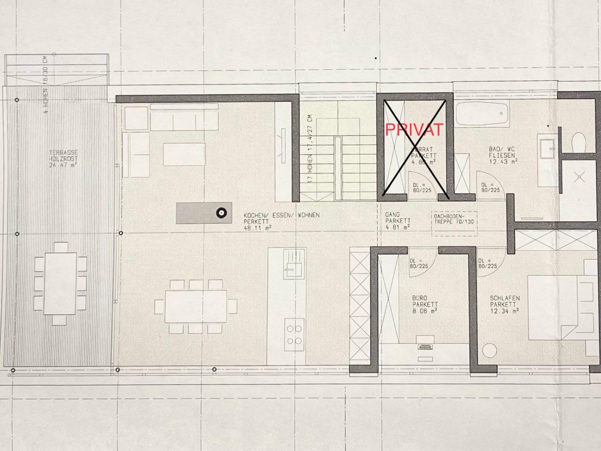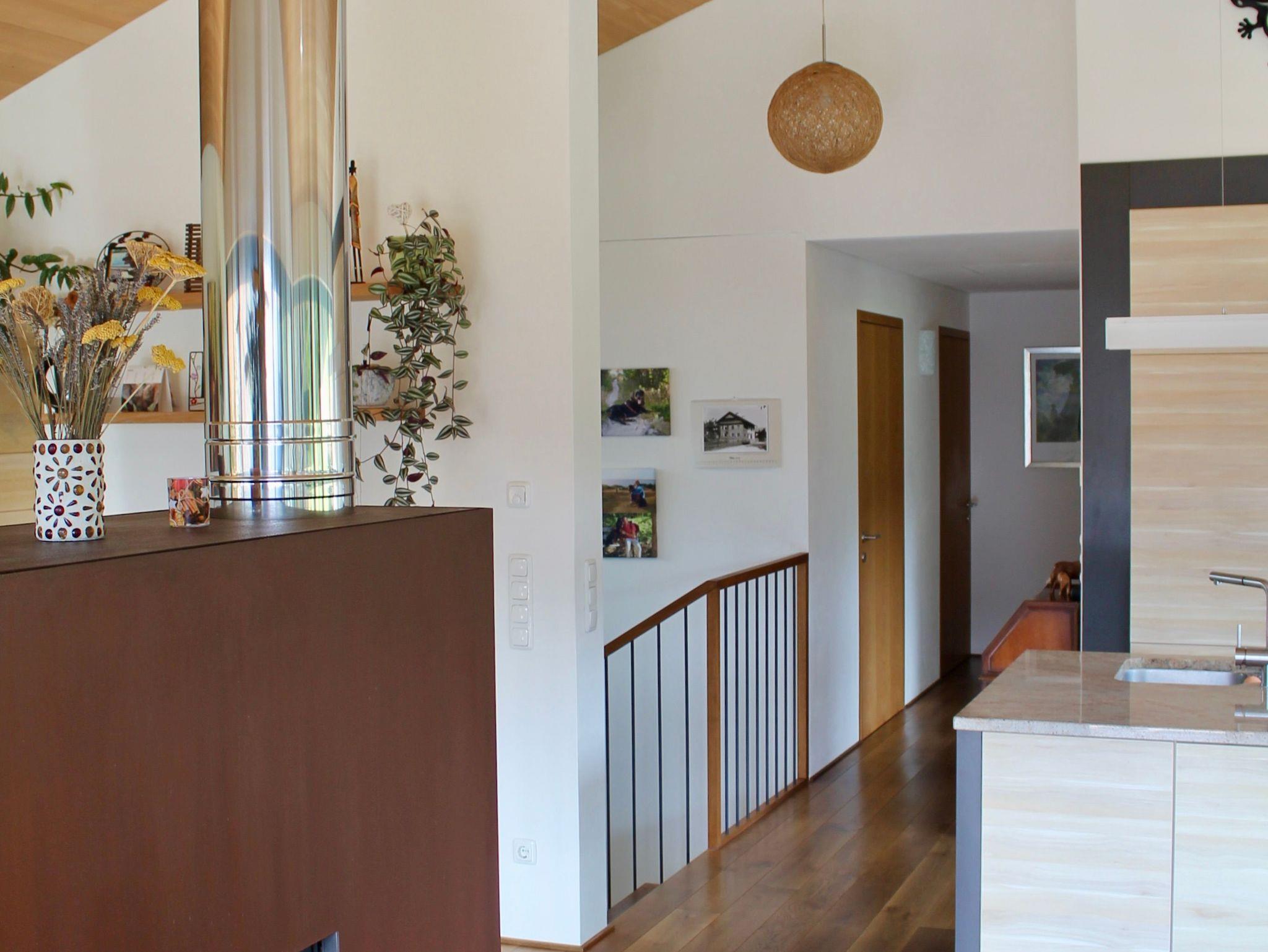 Von der großzügigen und überdachten Südterrasse aus hast du einen herrlichen Blick in die unverbaute Natur. Der Eingangsbereich liegt im Erdgeschoß. Über eine schöne Holztreppe erreichst du den offenen Wohnbereich.