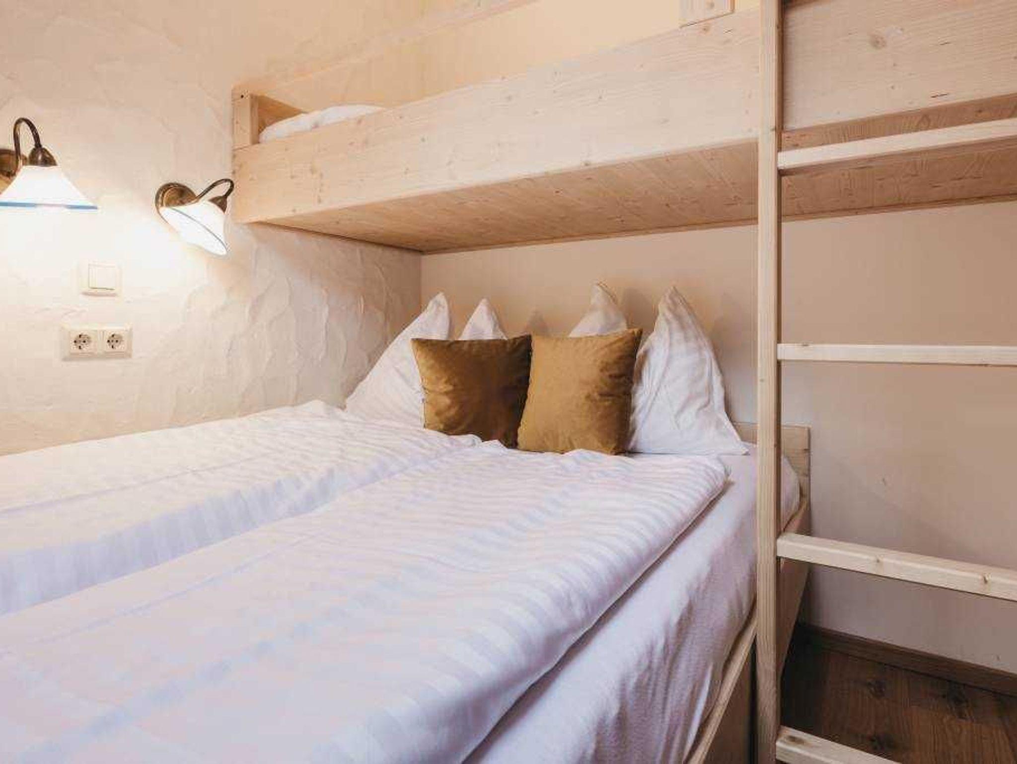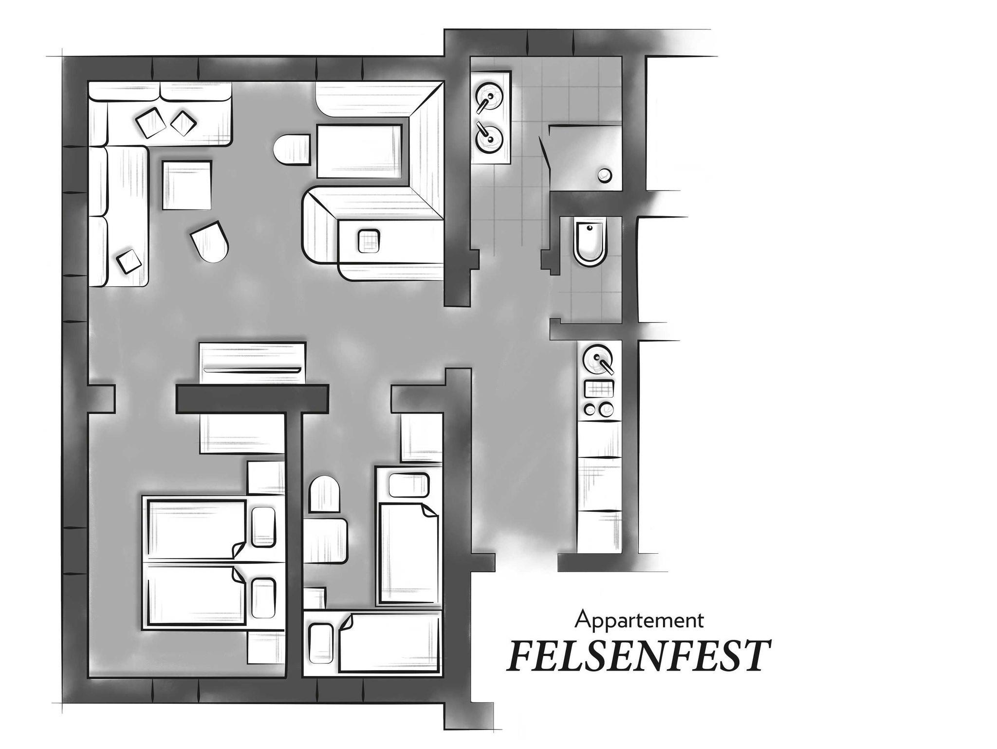 Ereignisreiche Urlaubstage erwarten Sie in unserem großzügigen Appartement Felsenfest. Dank getrenntem Schlafzimmer mit Doppelbett, Schlafzimmer mit zwei Einzelbetten und gemütlichen Schlafsofas im Wohn-Schlafraum steht dem Familienurlaub nichts im Wege.