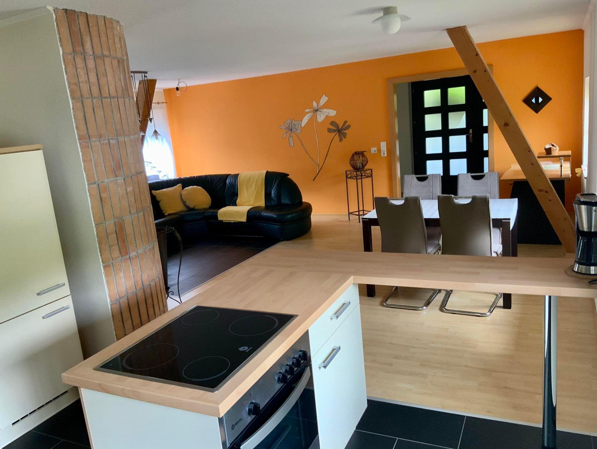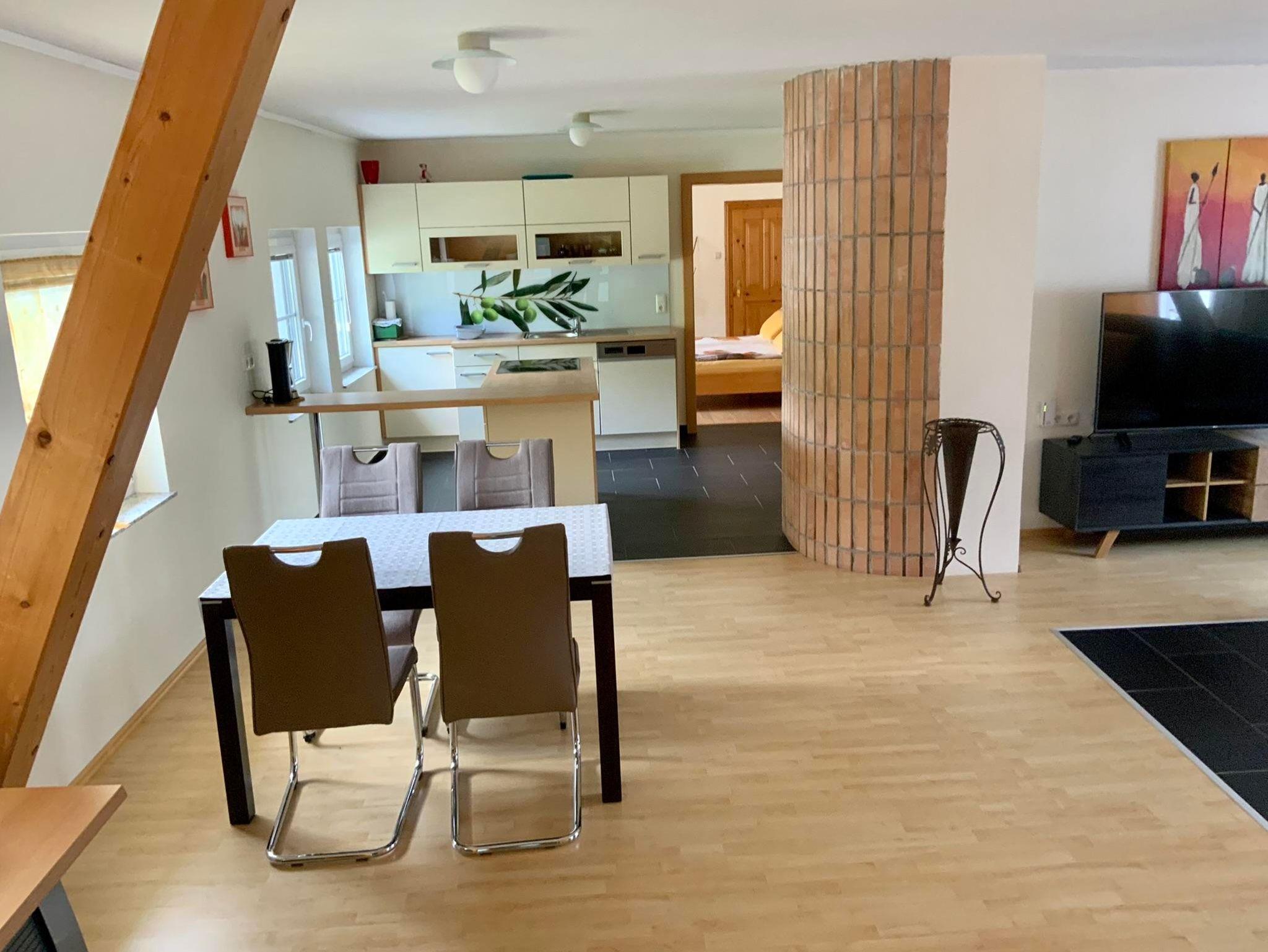Unsere geräumige Ferienwohnung ist ideal für Paare oder kleine Familien, die eine Auszeit vom Alltagsstress suchen. Mit einer Fläche von etwa 90m² bietet sie ausreichend Platz, um sich rundum wohlzufühlen. Mit Wohnzimmer, Küche und Essbereich, sowie zwei Schlafzimmern, Bad mit WC und Vorraum steht einem Entspannungsurlaub im Grünen nichts im Wege.