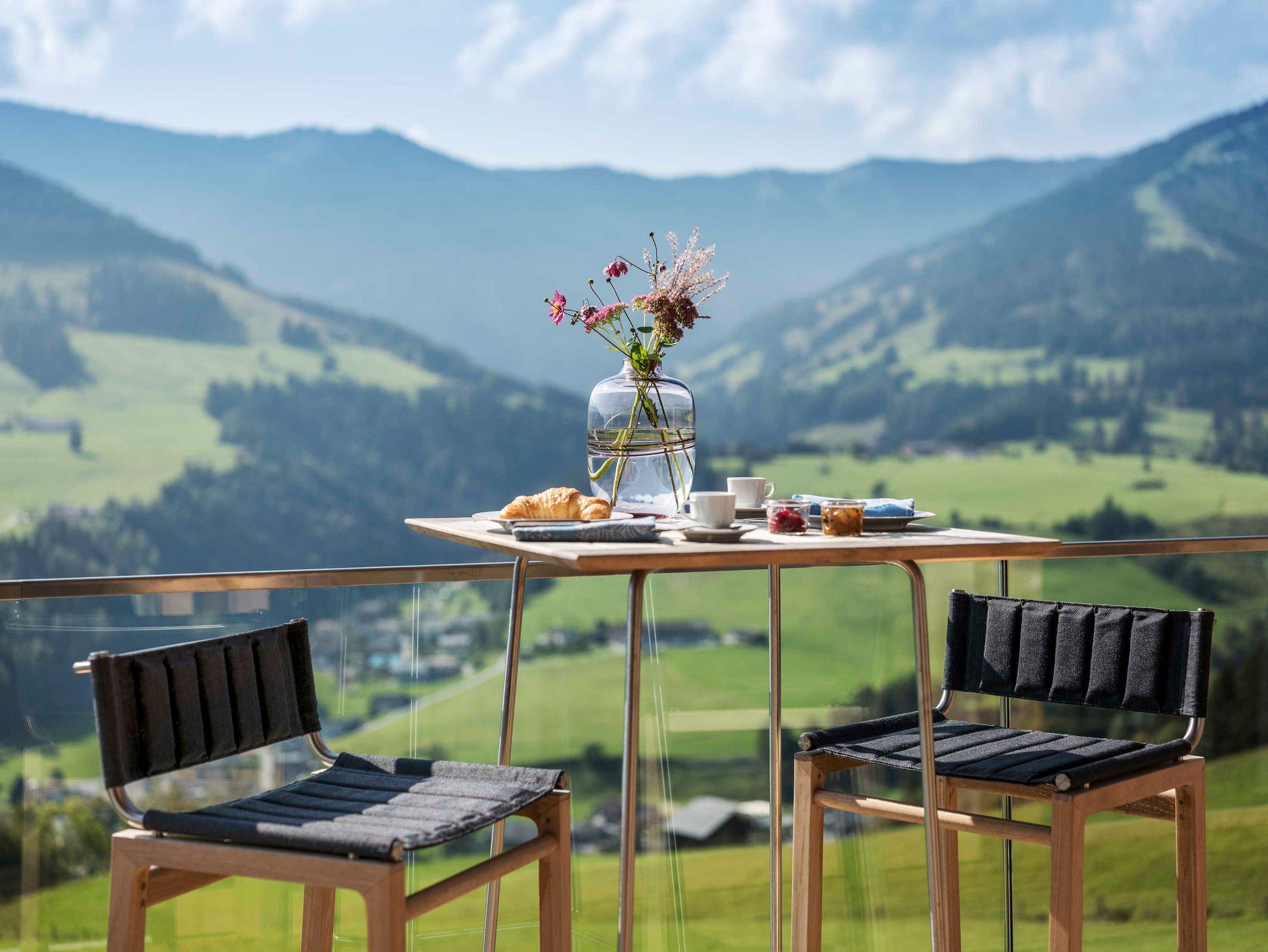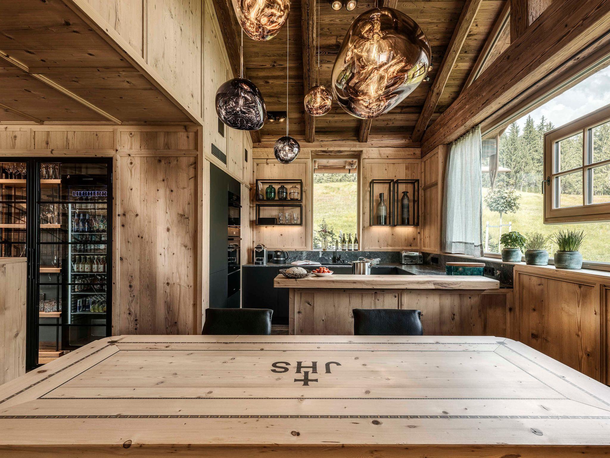 250 m2, die nur dem Sein geho¨ren. Der offene Wohnbereich mit Loft-Atmospha¨re und sichtbarem Dachgeba¨lk aus Altholz ist mit Mo¨biliar von Fritz Hansen wie dem Sofa Luna und dem Egg-Chair ausgestattet und geht leichtfu¨ßig in die Ku¨che mit Sitzgelegenheiten u¨ber. Die zwei Master Bedrooms sowie das zusa¨tzliche Schlafzimmer - alle mit SAMINA-Schlafsystem, eigenen Ba¨dern mit Wellness- Badewannen sowie Berg- und Talblick bis zu den Saalfeldener Steinbergen, verteilen sich fu¨r ungesto¨rte Privatspha¨re auf verschiedene Ebenen und bieten Zugang zu den großzu¨gigen Balkonen und Terrassen. Den Ho¨hepunkt offenbart ein eigener Wellnessbereich mit ganzja¨hrig beheiztem Infinity Outdoor-Pool fu¨r endlos entspannte Stunden mit Weitblick. Natu¨rliche Materialien, Eichenholzbo¨den und Zirbenholzdecken kombiniert mit großen Fensterfronten spenden viel Licht und lassen zur Ruhe kommen ? am besten vor dem knisternden Kamin.