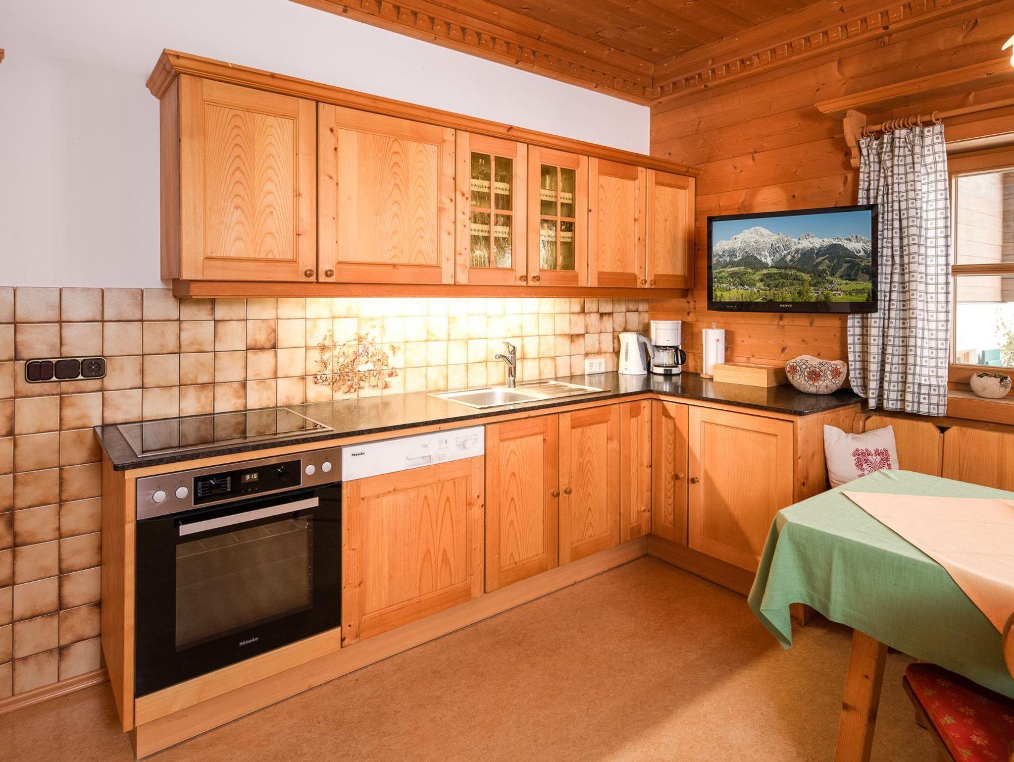 Des Weiteren bietet der große Frühstücks- bzw. Aufenthaltsraum mit gemütlichen Kachelofen eine komplett ausgestattete Gästeküche, die jederzeit benützt werden kann.