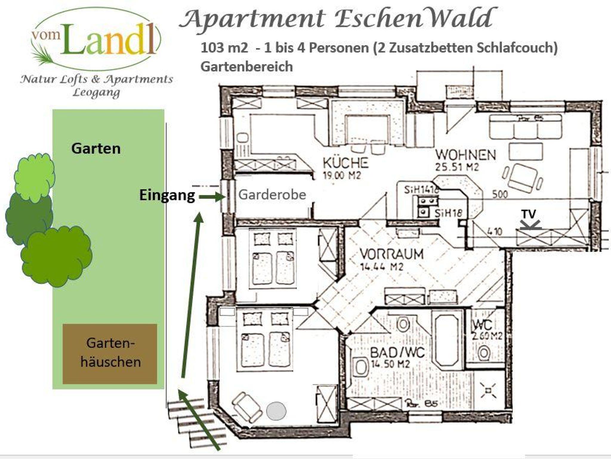 Es erwarten dich zwei Natur Lofts (ZirbenWald 83 m2, FichtenWald 85 m2) mit gemütlichem Ambiente auf 2 Etagen mit viel natürlichem Holz und ein Natur Apartment EschenWald mit 103 m2 mit Kachelofen und Landhausküche, alles im Erdgeschoß mit großzügigem Garten.