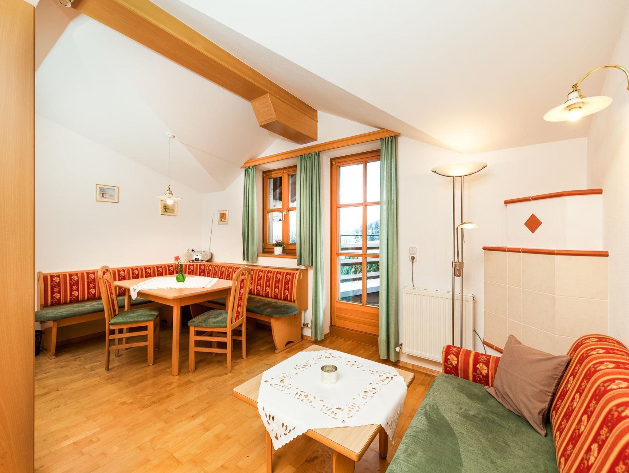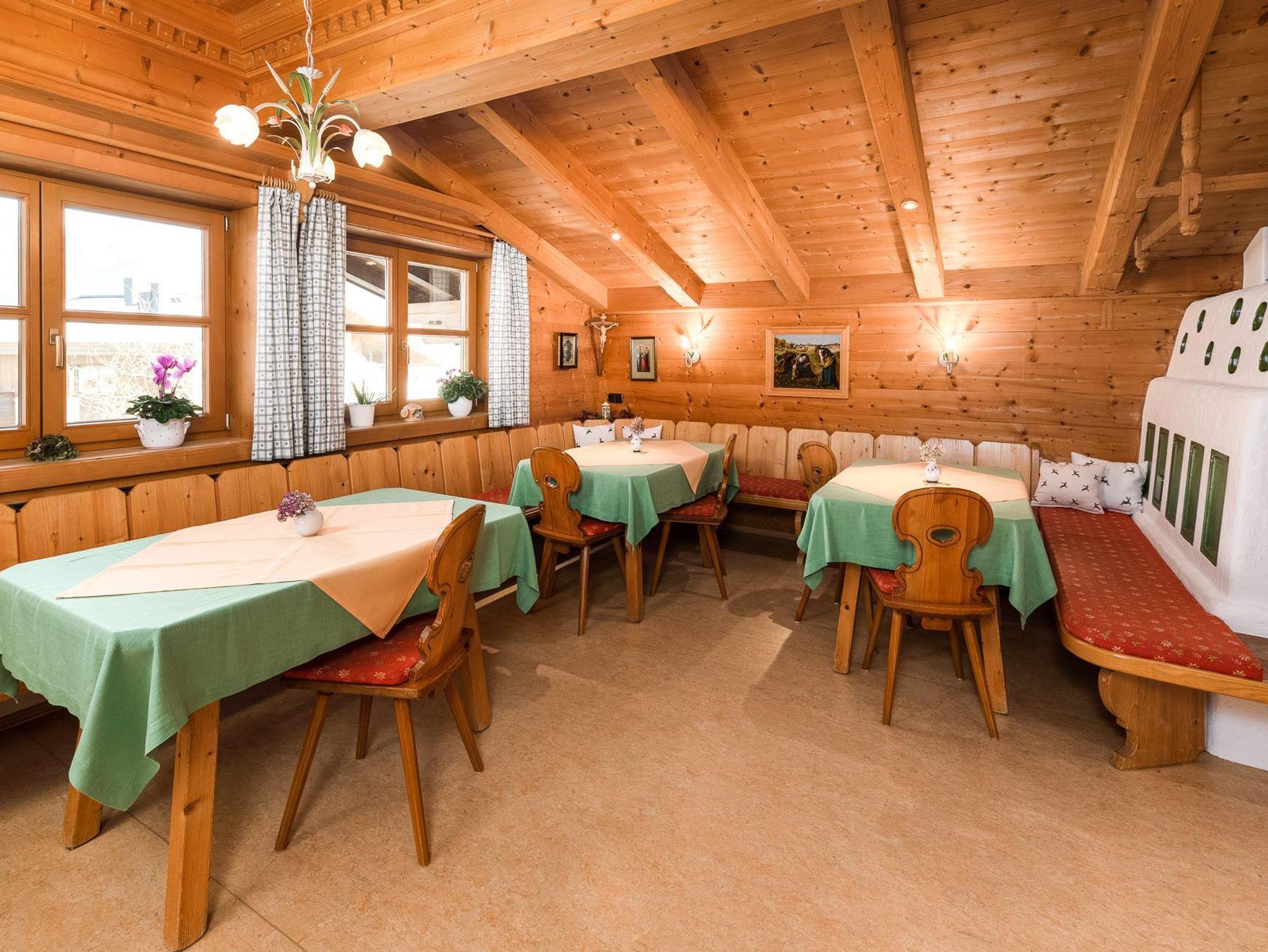 Des Weiteren bietet der große Frühstücks- bzw. Aufenthaltsraum mit gemütlichen Kachelofen eine komplett ausgestattete Gästeküche, die jederzeit benützt werden kann.