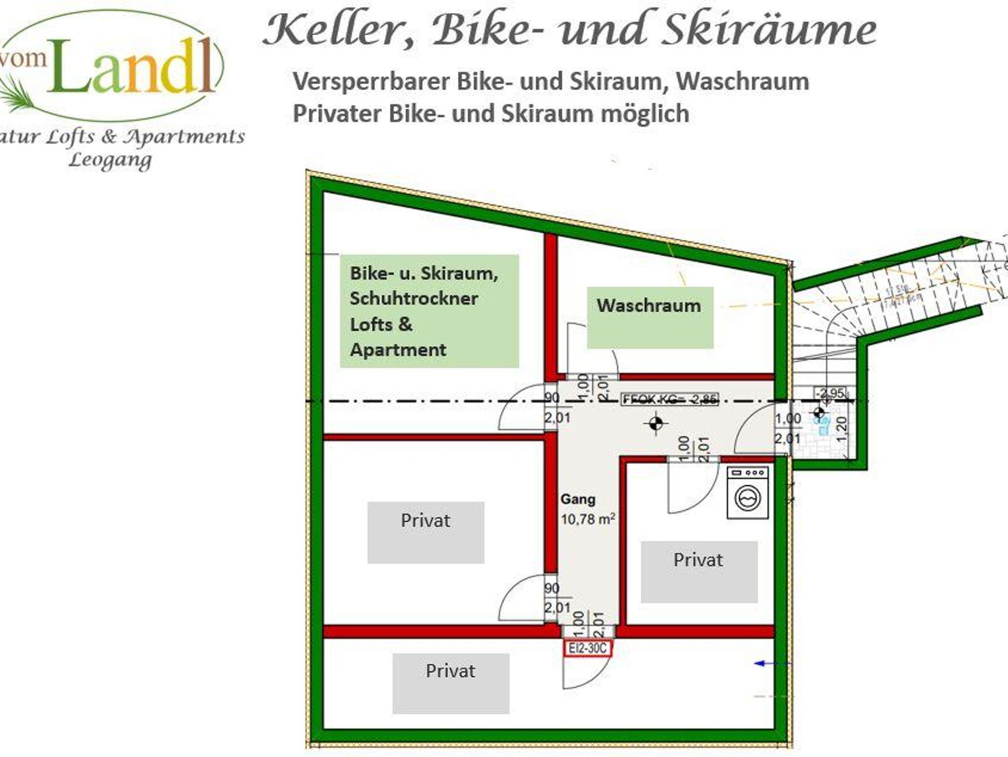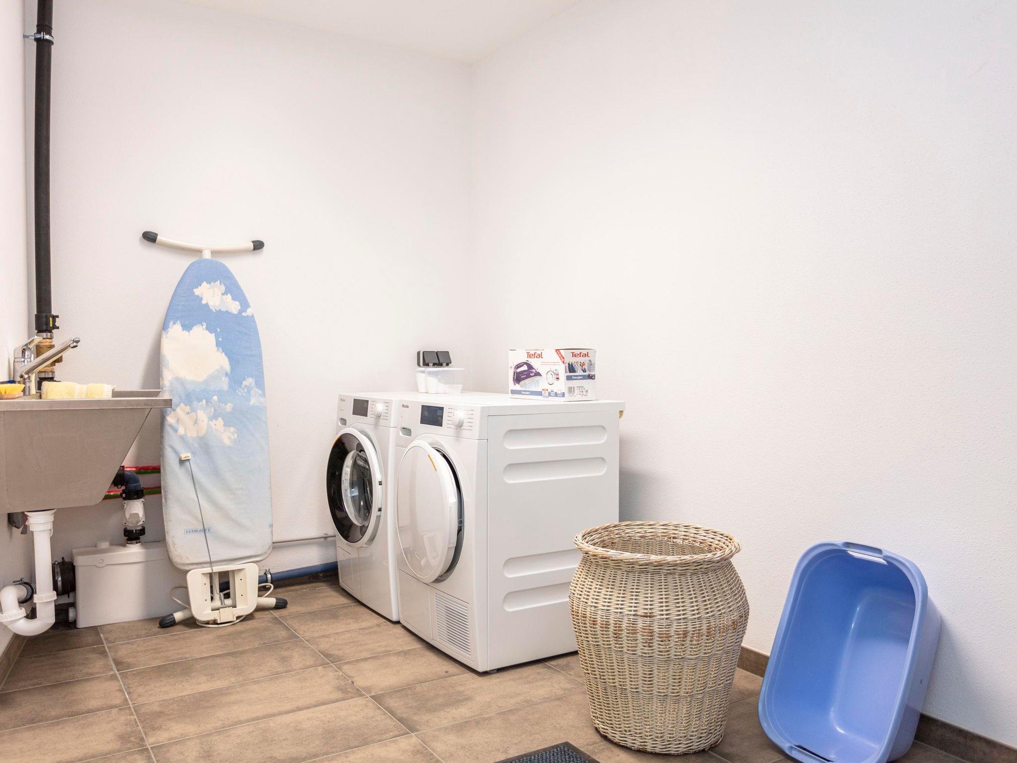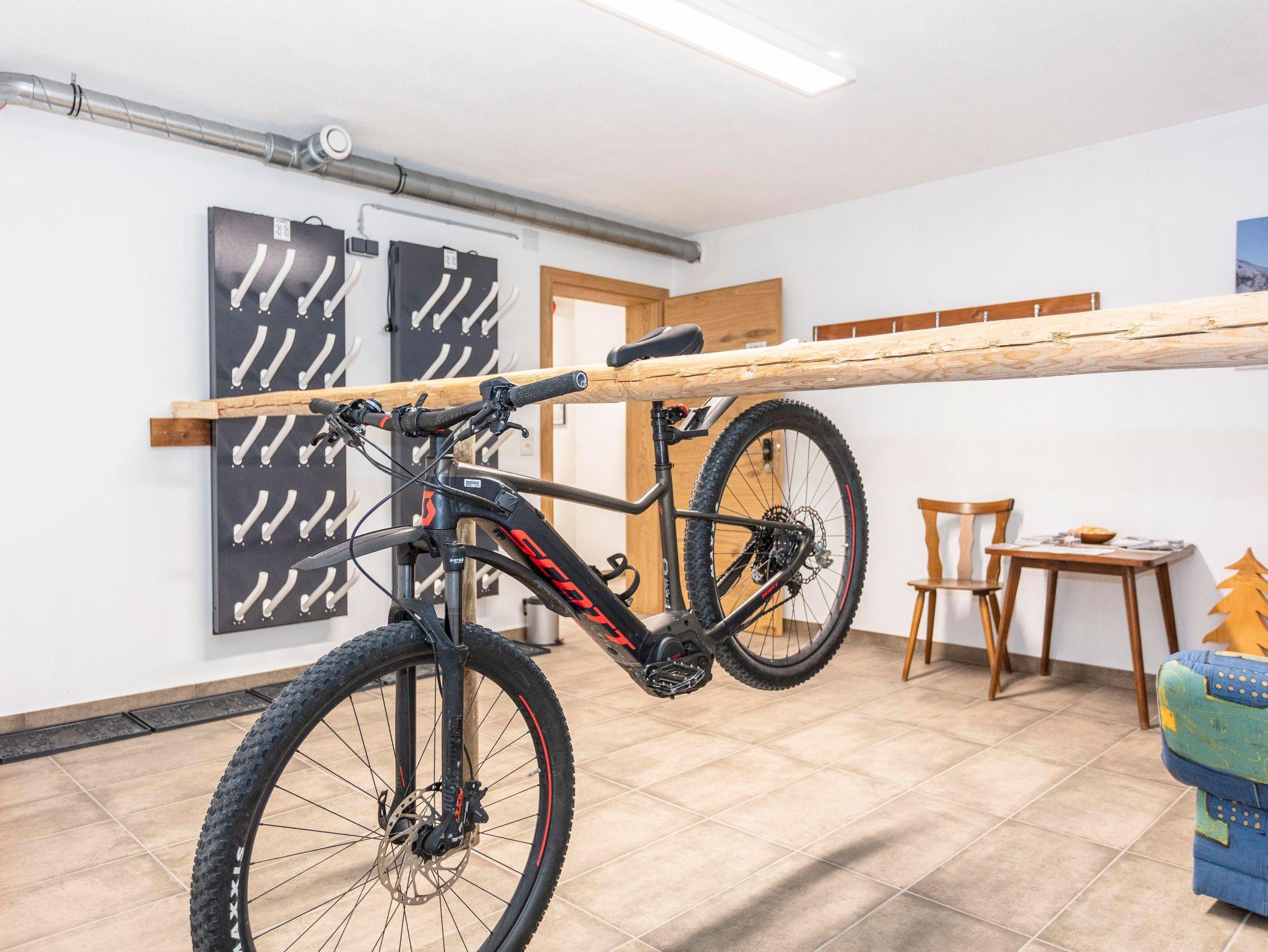 Versperrbarer Ski- und Bikeraum mit belüftetem Skischuhtrockner, Waschmaschine und Wäschetrockner inklusive.