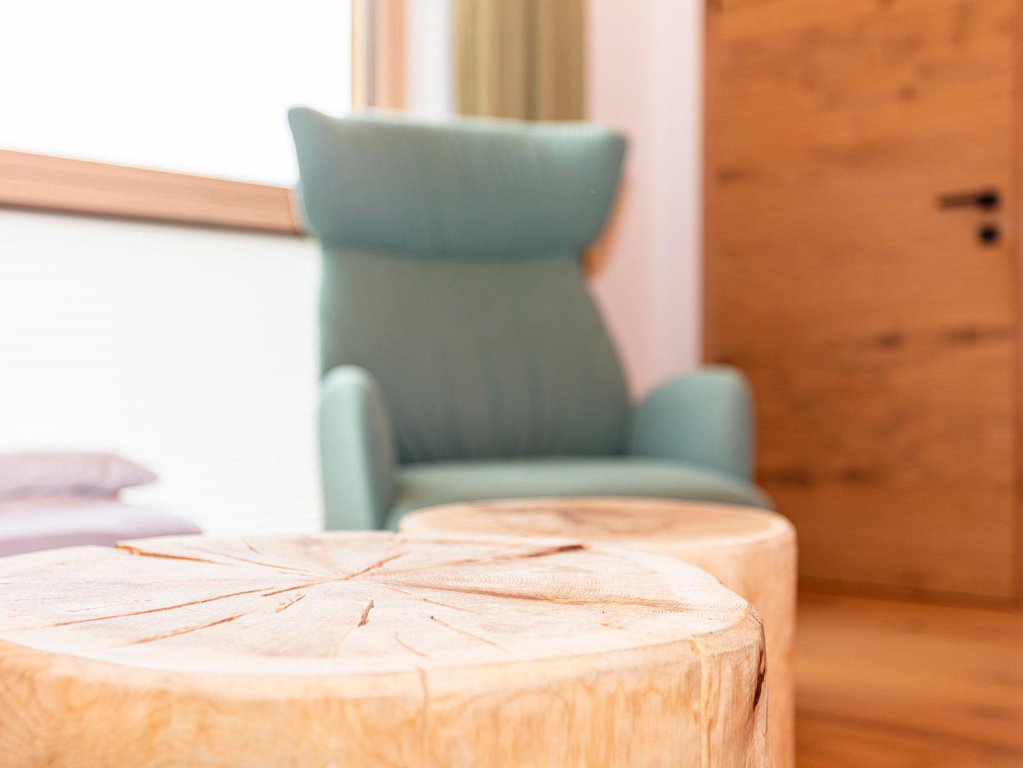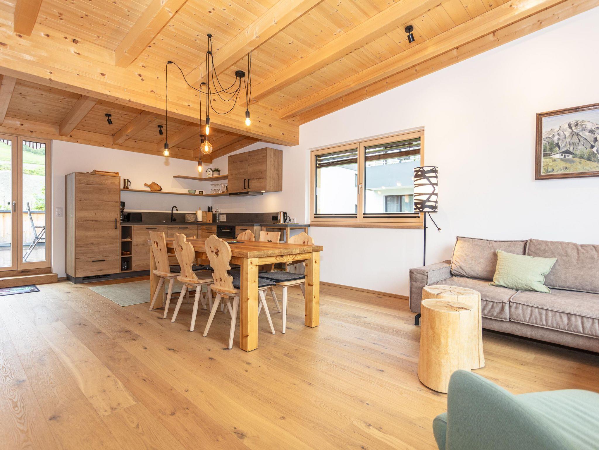 Die naturbelassene Fichtenholzdecke und ein gemütliches Ecksofa aus Naturleinen laden zum Chillen und Genießen des Ausblicks ein. Panoramafenster auf die Leoganger Steinberge. Eigene Sonnenterrasse mit Esstisch und Stühlen mit Blick auf die sanften Grasberge im Süden und Gartenbereich im Freien mit Liegestühlen.