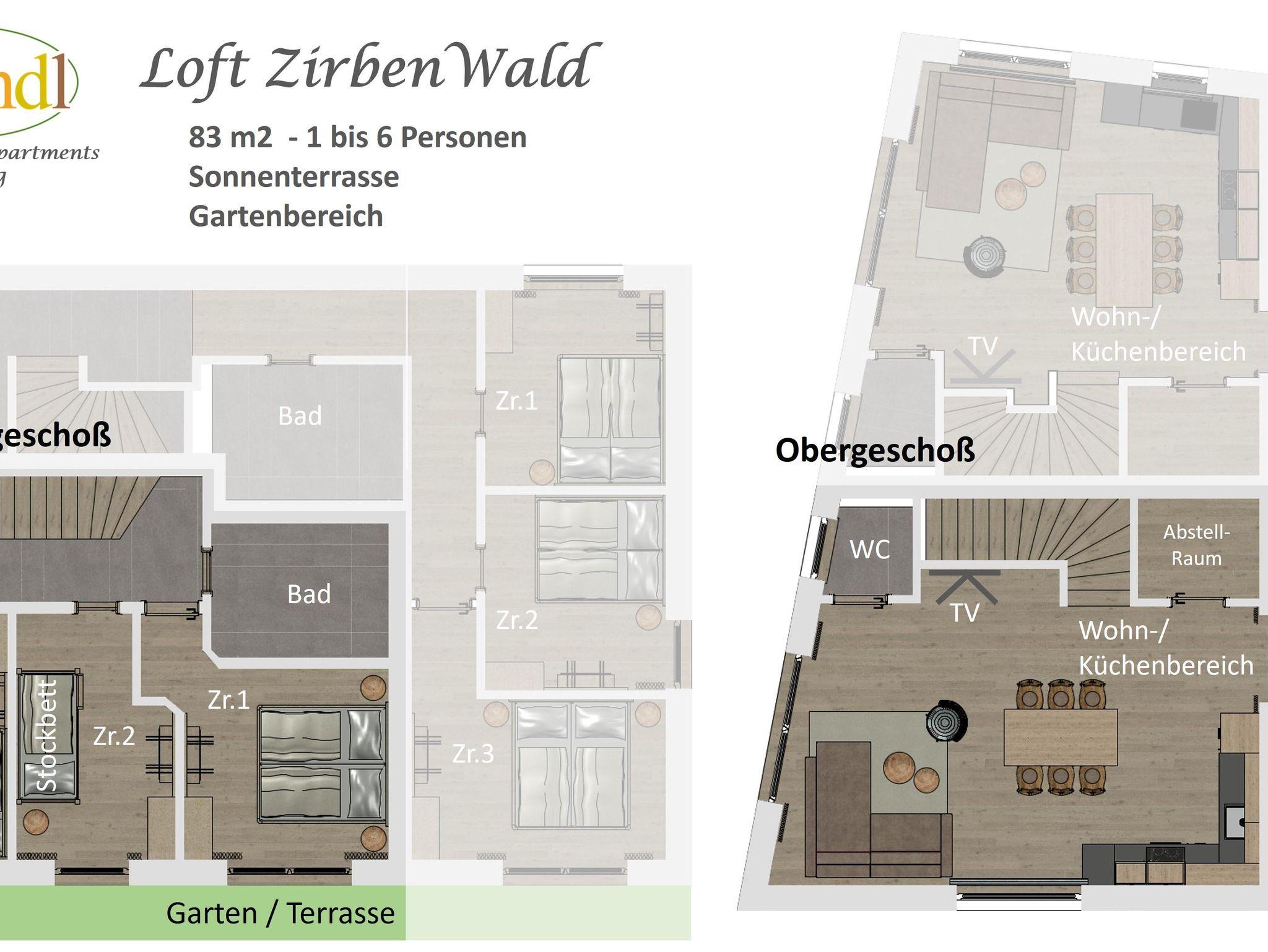 Es erwarten dich zwei Natur Lofts (ZirbenWald 83 m2, FichtenWald 85 m2) mit gemütlichem Ambiente auf 2 Etagen mit viel natürlichem Holz und ein Natur Apartment EschenWald mit 103 m2 mit Kachelofen und Landhausküche, alles im Erdgeschoß mit großzügigem Garten.