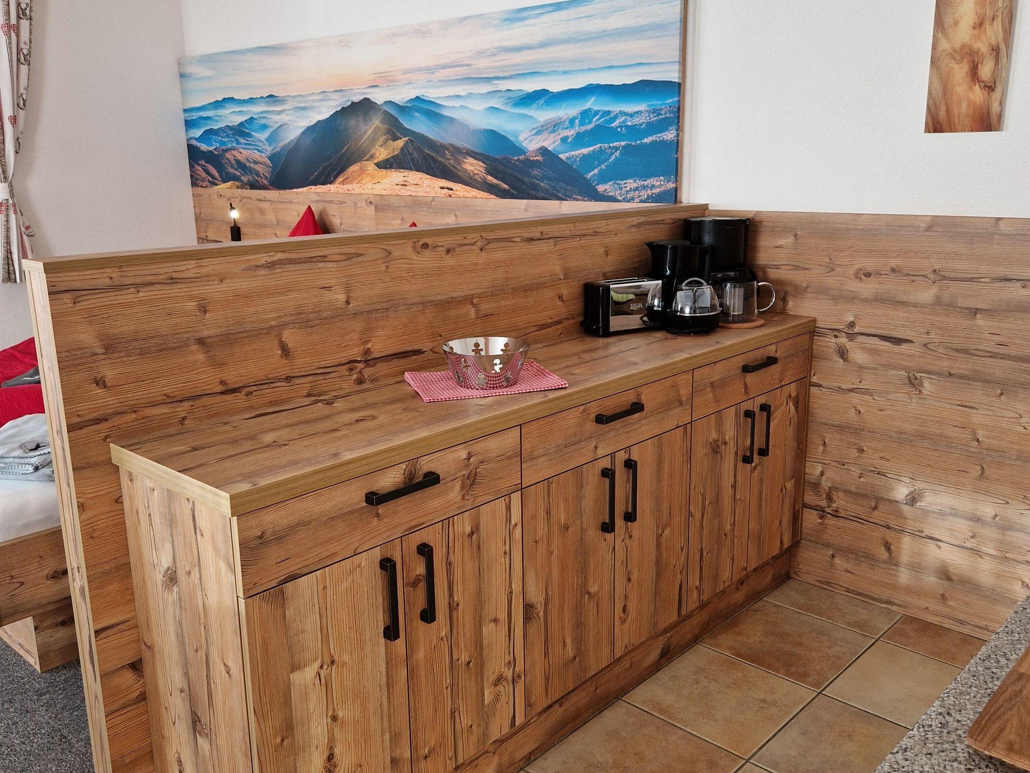 EINRAUM AUMAPPARTEMENT! Küchenzeile-Ausstattung für 4Personen.2PlattenCeranherd,Dunstabzug,Geschirrspüler,Mikrowelle,Kühlschrank, Kaffeemaschine,Wasserkocher,Küchen/Bad/Bettwäsche.Doppelbett,Doppelausziehcouch.32Zoll LED-TV,Ercker mit Rattansitzgruppe.Radio,Eck bank+2Stühle-Tisch.Vorraum-DU/WC-Diele