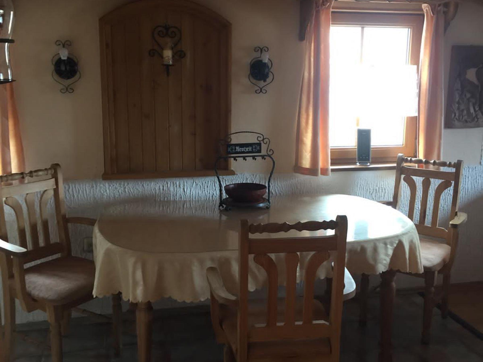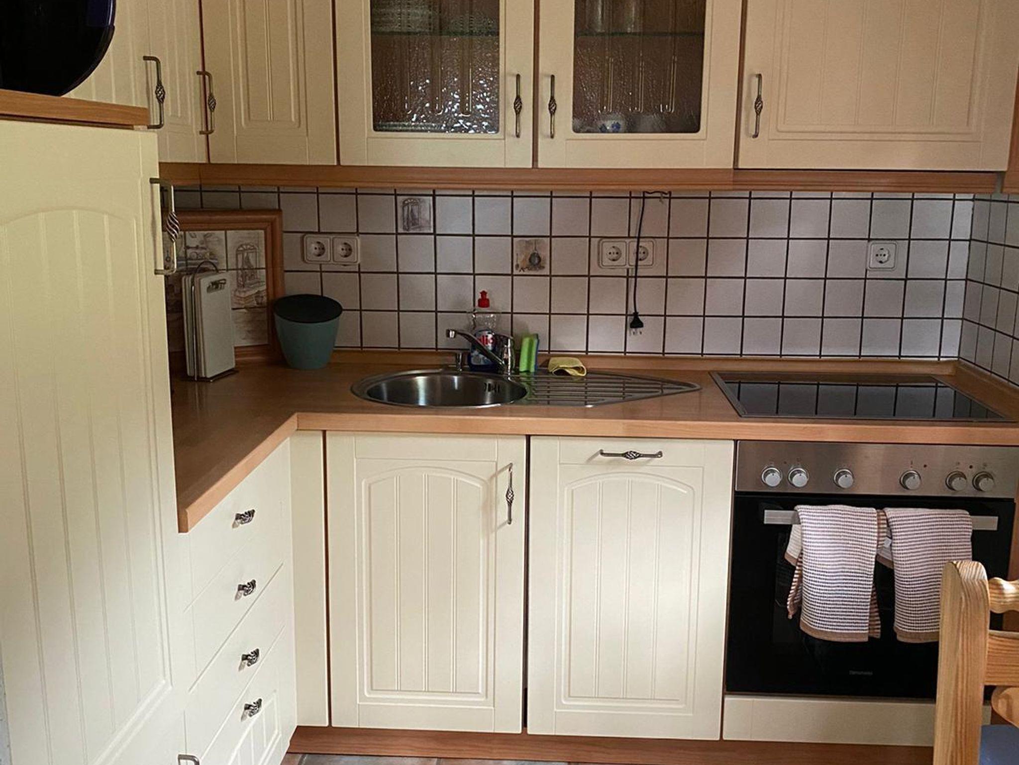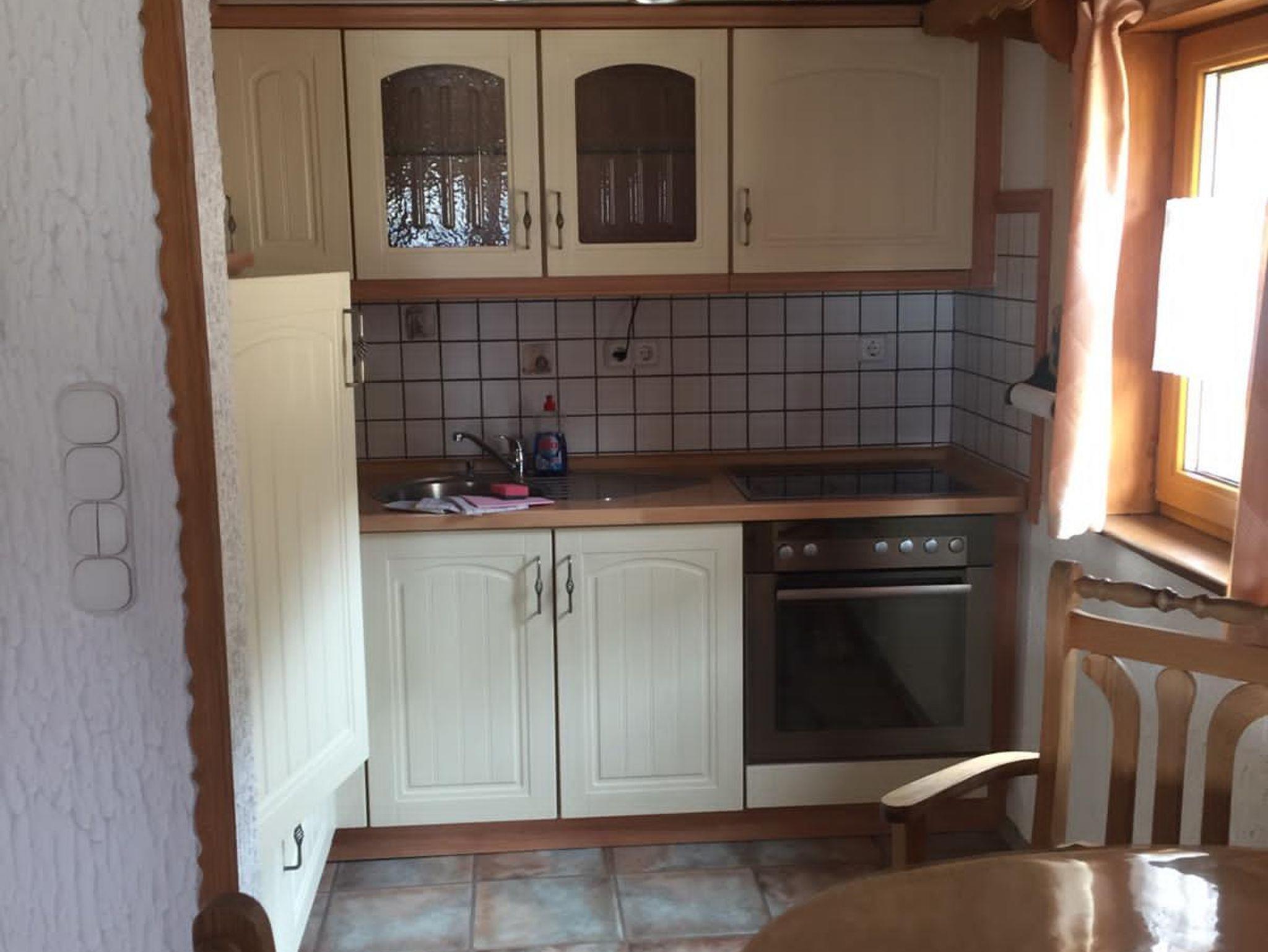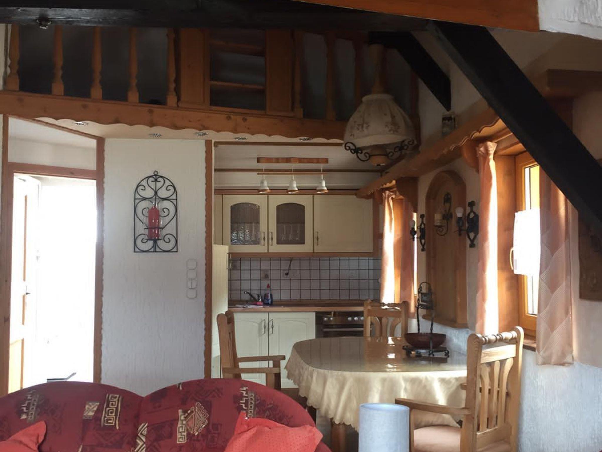 • schöne Küche für Selbstversorger mt einen Esstisch und einen Wohnraum mit Kamin und kleinem zusätzlichen Balkon
